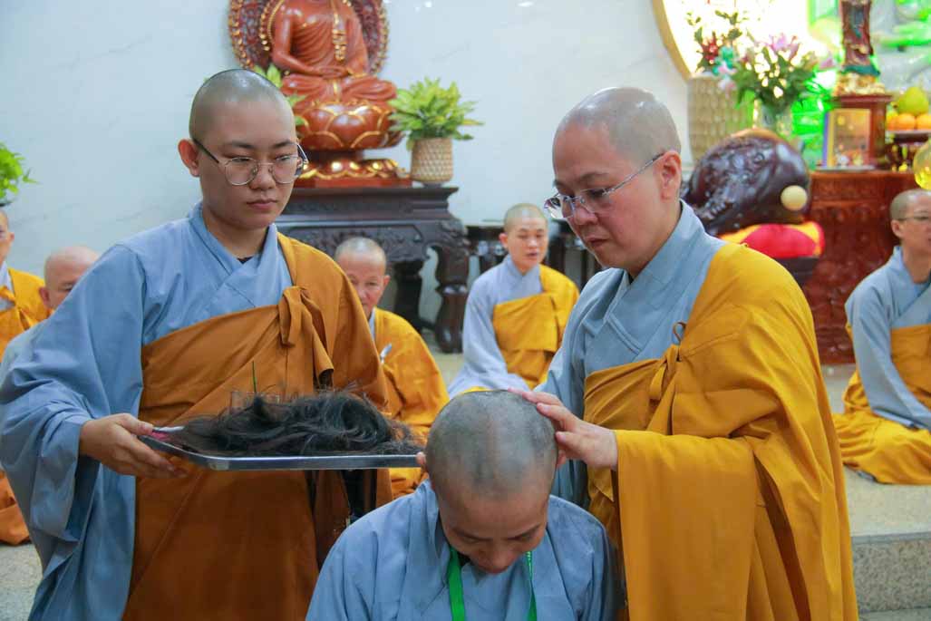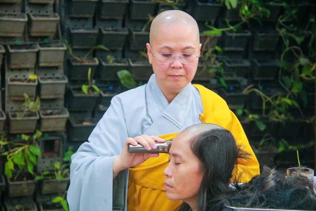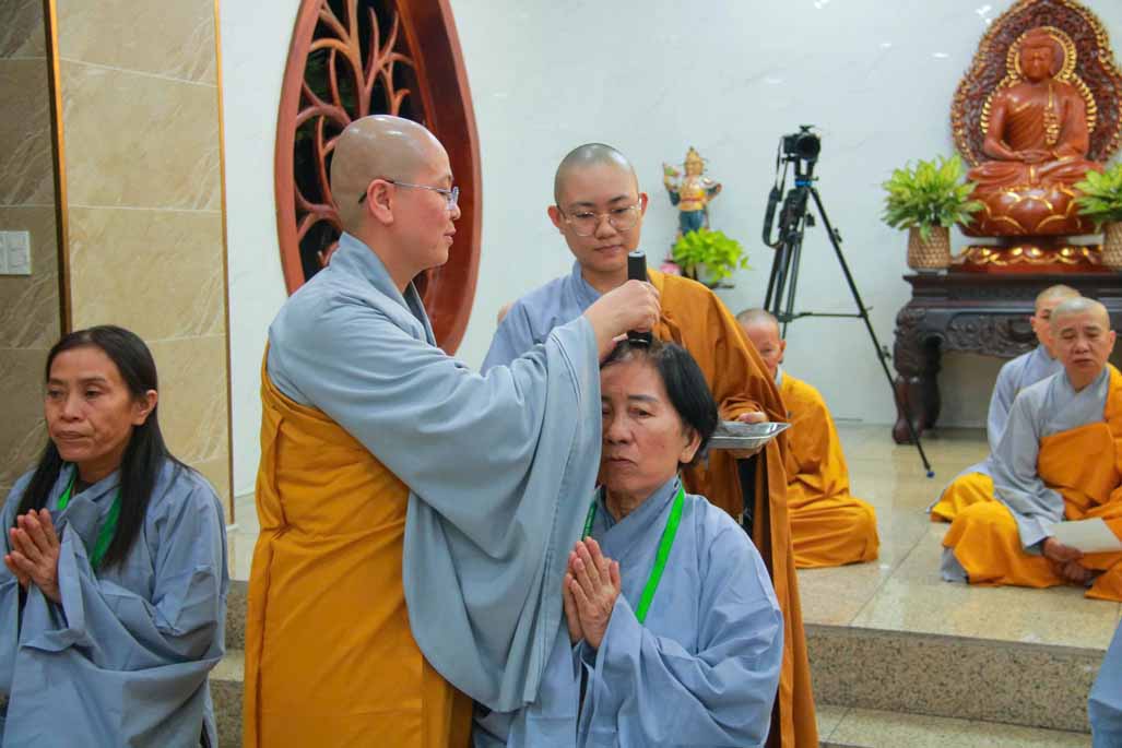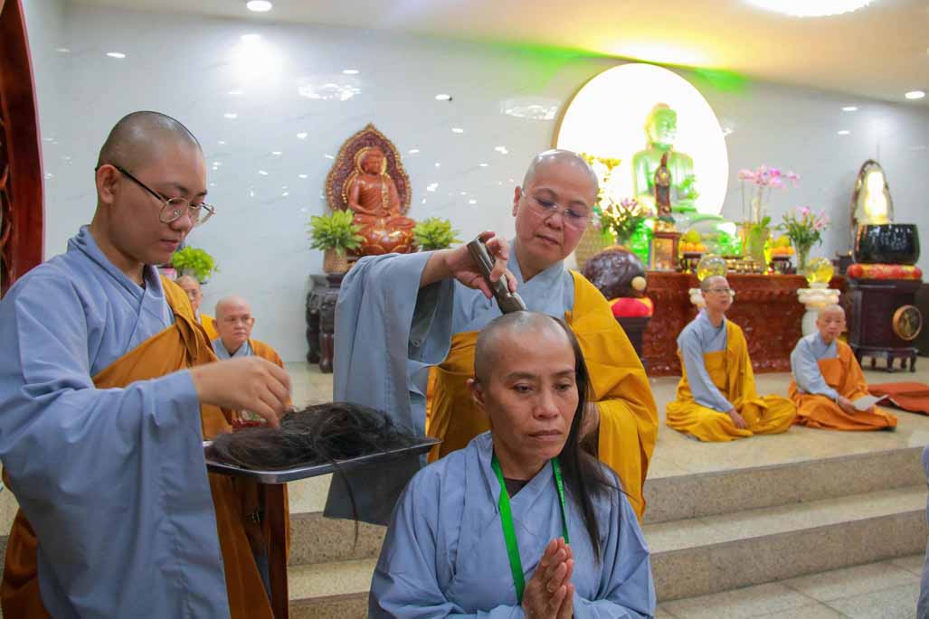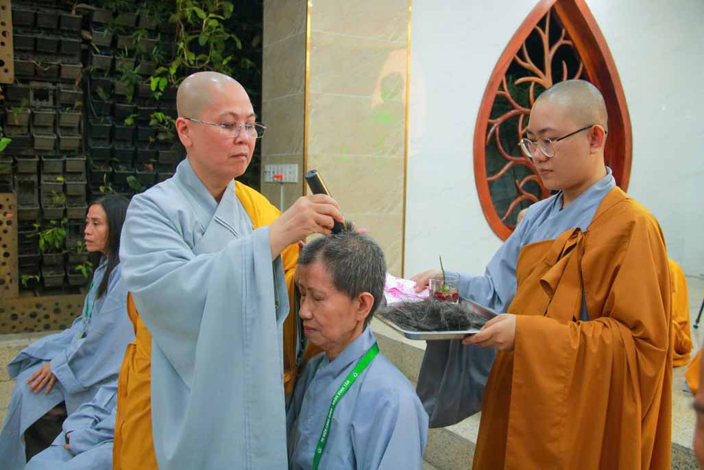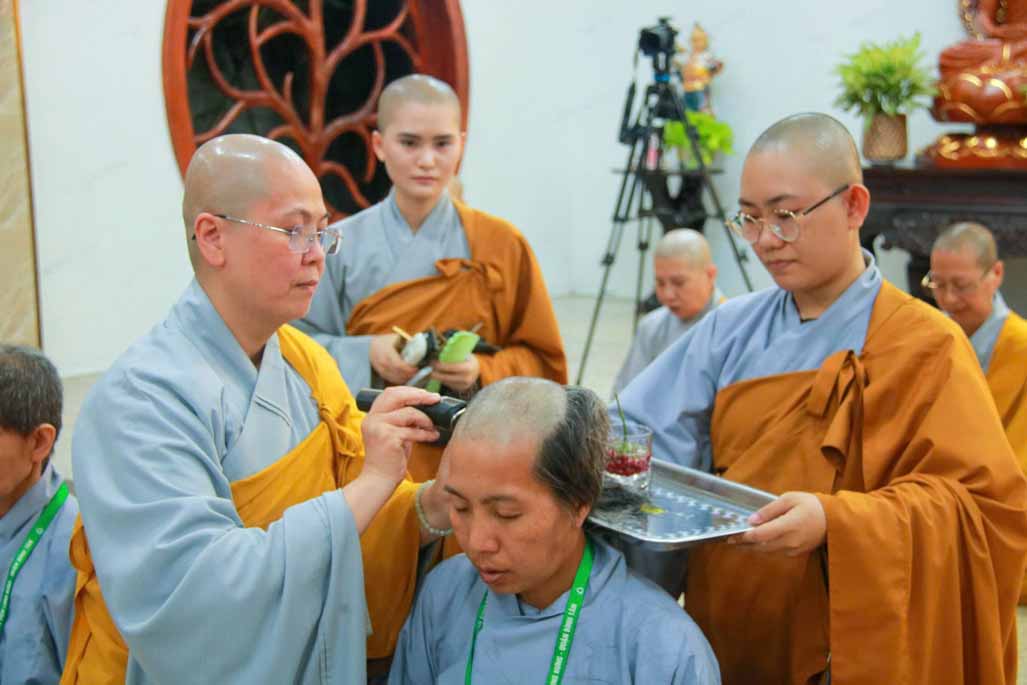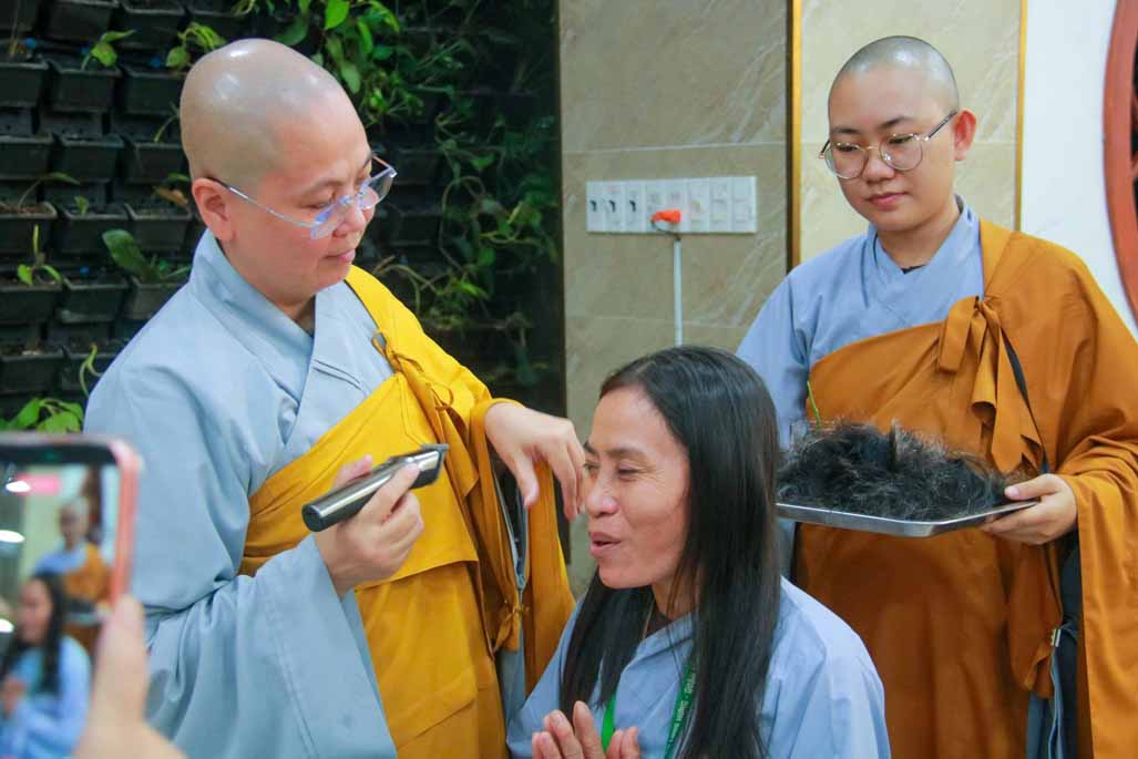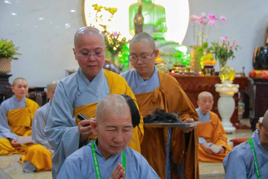 Trong ánh sáng uy nghi của Đức Phật Bổn Sư, Ni sư Thích Nữ Diệu Hiếu trực tiếp cạo bỏ từng lọn tóc cho các giới tử, biểu tượng cho sự dứt trừ nghiệp phàm, buông bỏ trần cấu của bao kiếp luân hồi. Mỗi đường kéo chạm vào mái tóc là mỗi lần giới tử lặng lẽ đọc thầm nguyện lớn: nỗ lực tu tập, sống trong chánh niệm và tinh tấn trên con đường giải thoát.