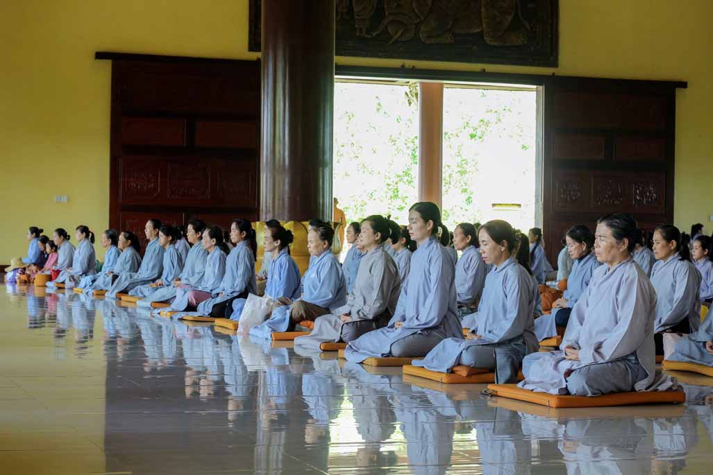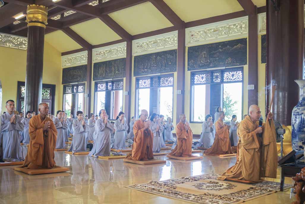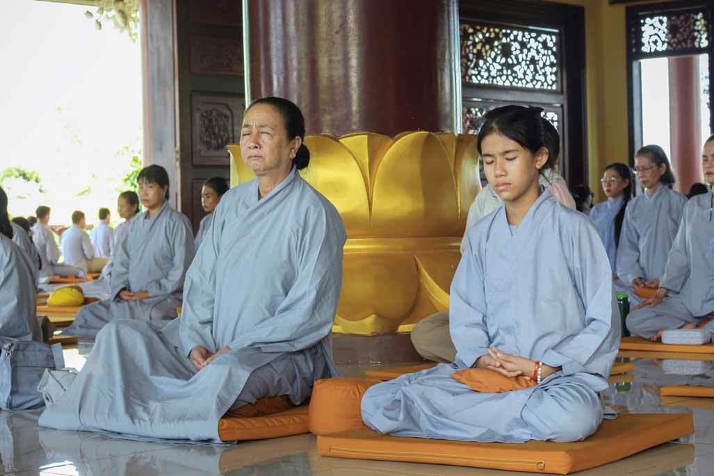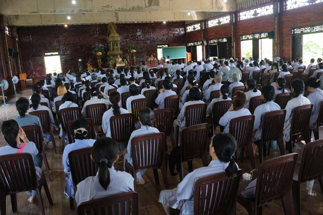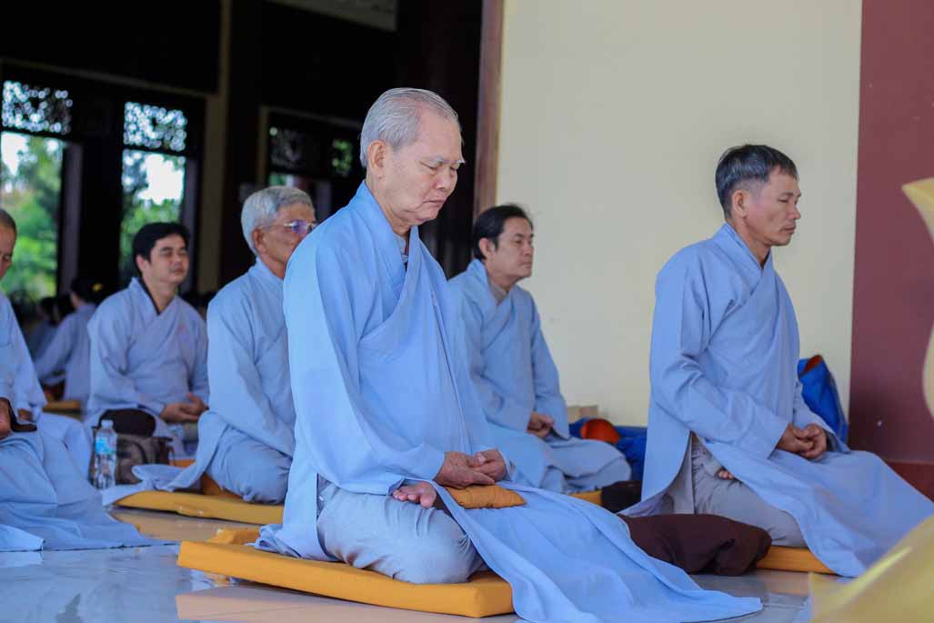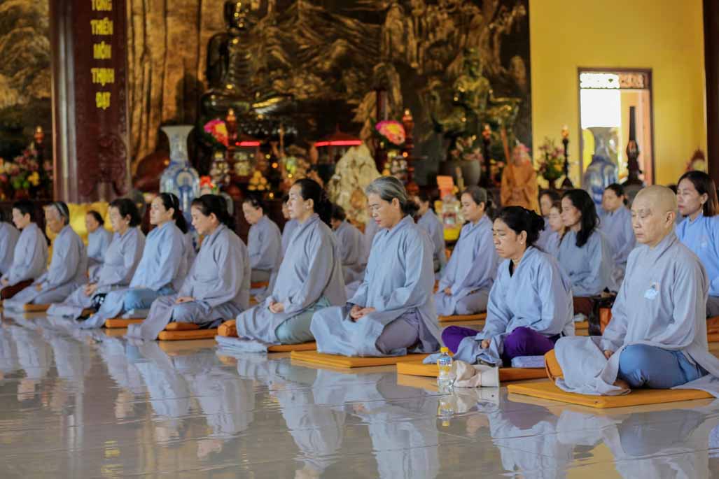 Mở đầu thời khóa, đại chúng vân tập tại đại hùng bửu điện, trang nghiêm thực hiện nghi thức sám hối lục căn và tọa thiền. Trong không gian thanh tịnh của thiền viện, từng bước chân, từng hơi thở của người tham dự đều trở nên chánh niệm, giúp lắng dịu thân tâm và chuẩn bị cho việc tiếp nhận giáo pháp một cách sâu sắc.