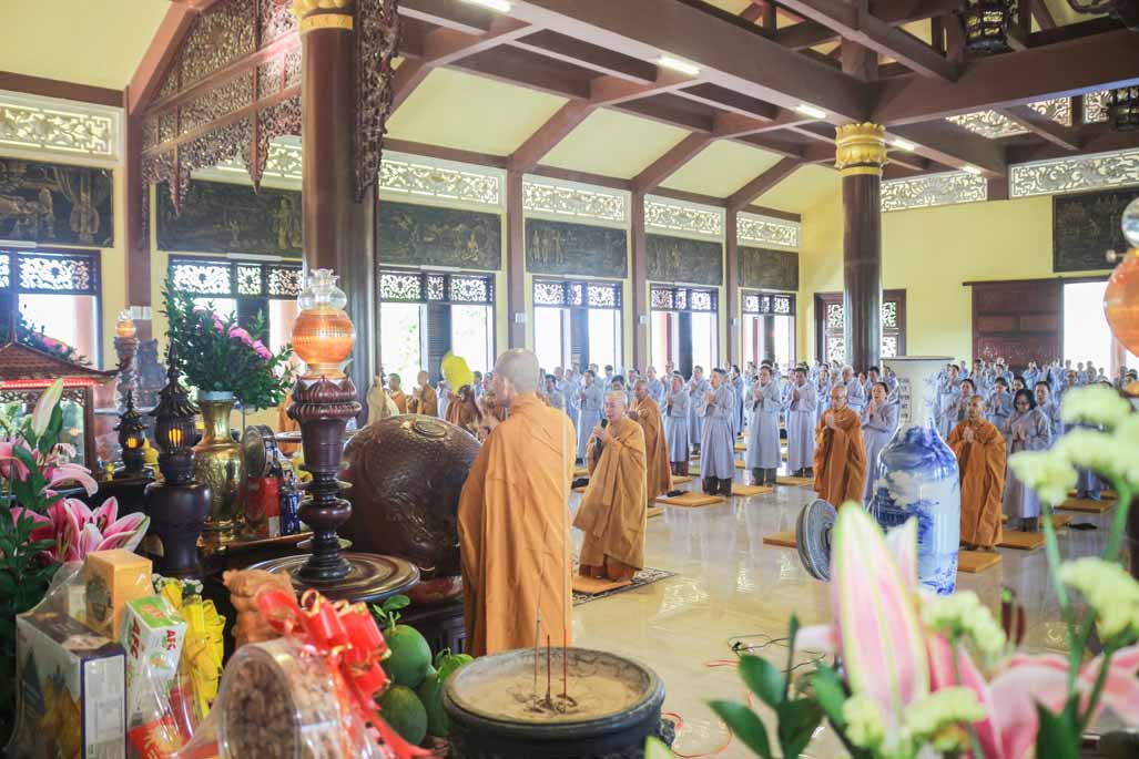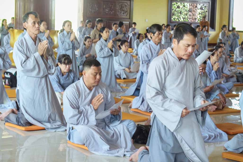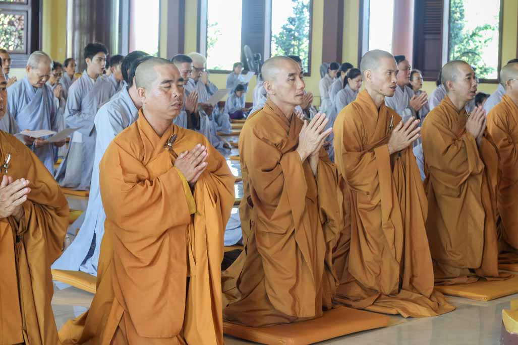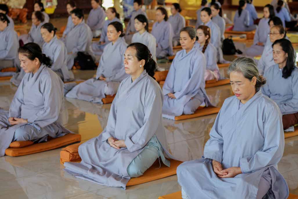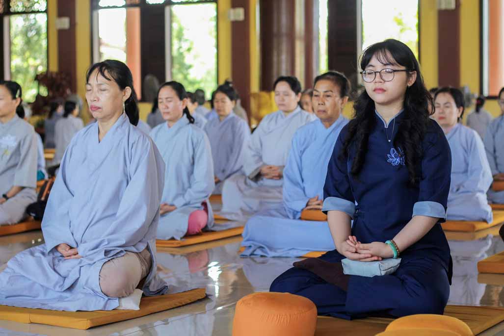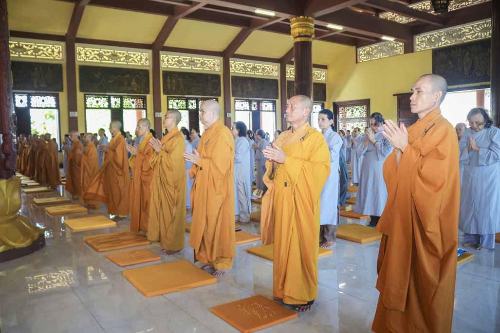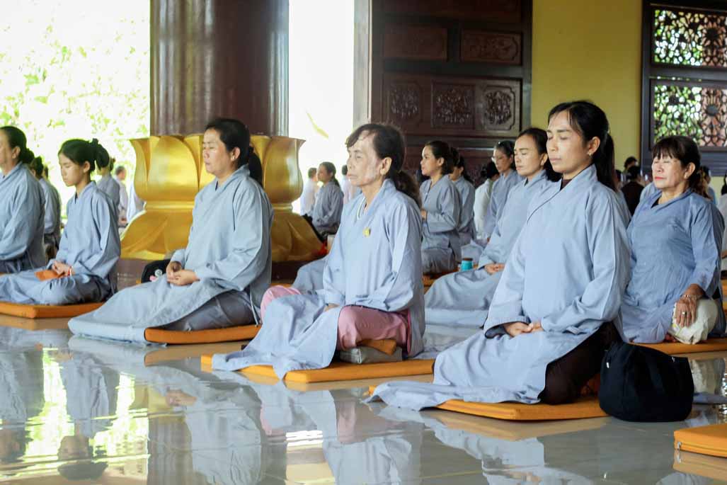 Mở đầu thời khóa, đại chúng vân tập tại đại hùng bửu điện, trang nghiêm thực hiện nghi thức sám hối lục căn và tọa thiền. Trong không gian thanh tịnh của thiền viện, từng bước chân, từng hơi thở của người tham dự đều trở nên chánh niệm, giúp lắng dịu thân tâm và chuẩn bị cho việc tiếp nhận giáo pháp một cách sâu sắc.
