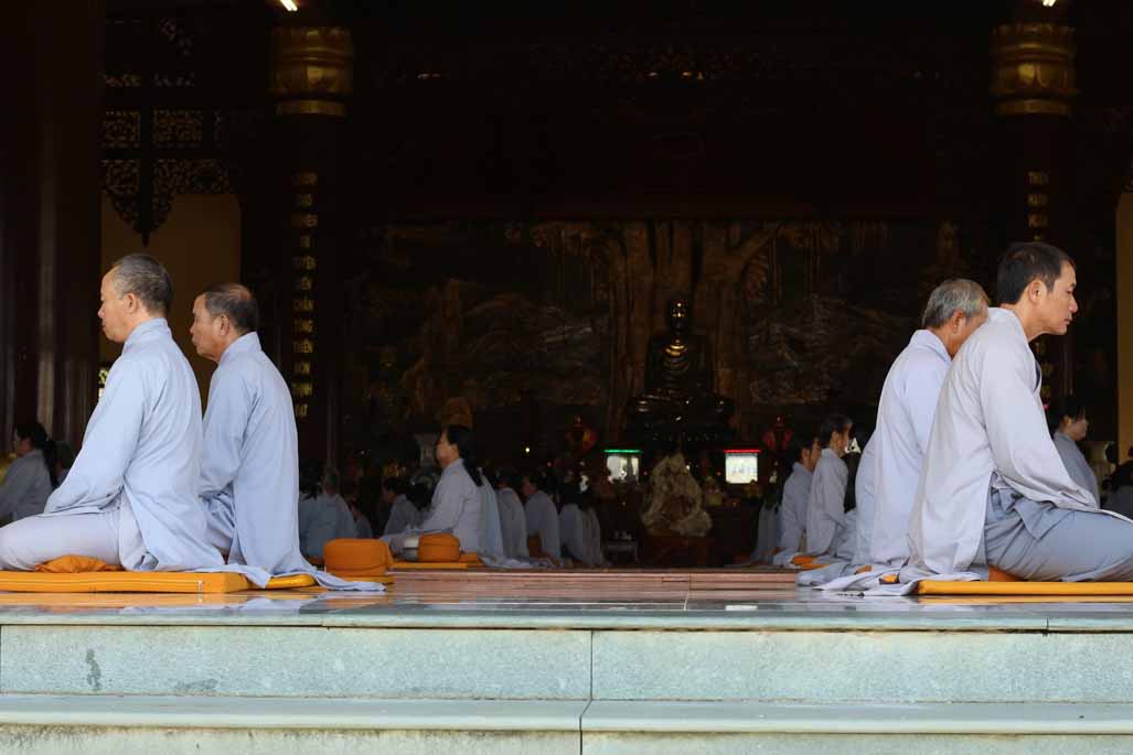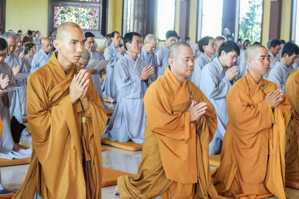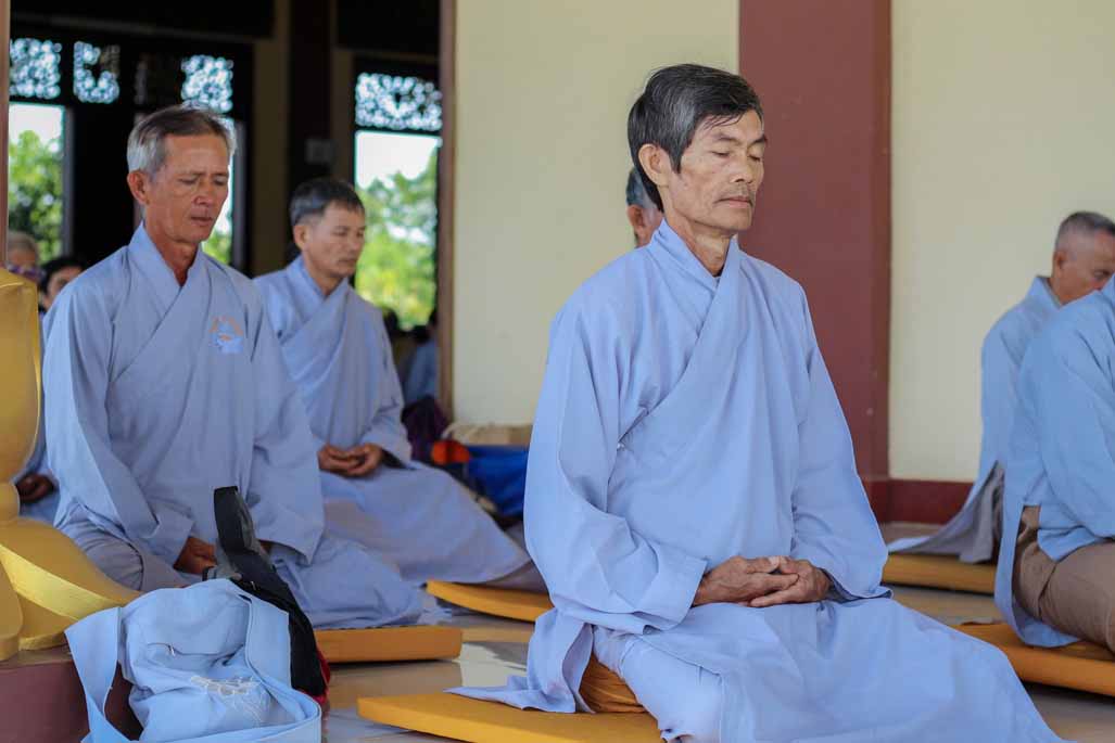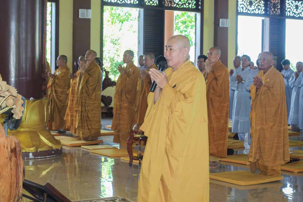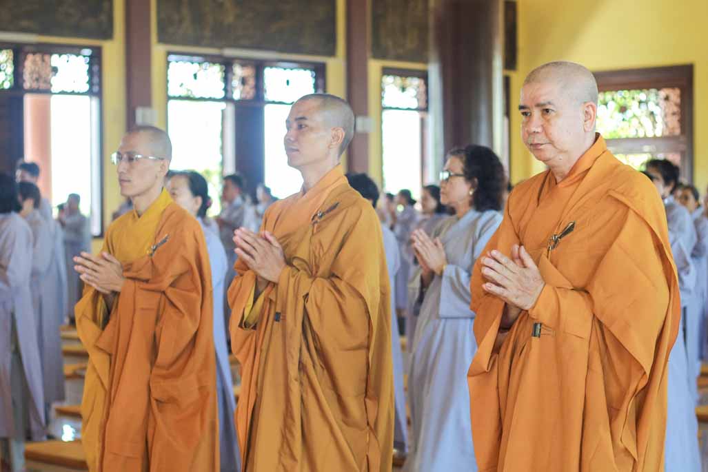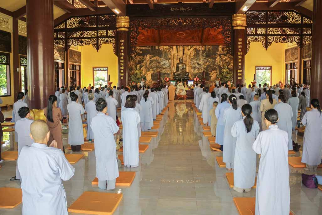 Mở đầu thời khóa, đại chúng vân tập tại đại hùng bửu điện, trang nghiêm thực hiện nghi thức sám hối lục căn và tọa thiền. Trong không gian thanh tịnh của thiền viện, từng bước chân, từng hơi thở của người tham dự đều trở nên chánh niệm, giúp lắng dịu thân tâm và chuẩn bị cho việc tiếp nhận giáo pháp một cách sâu sắc.