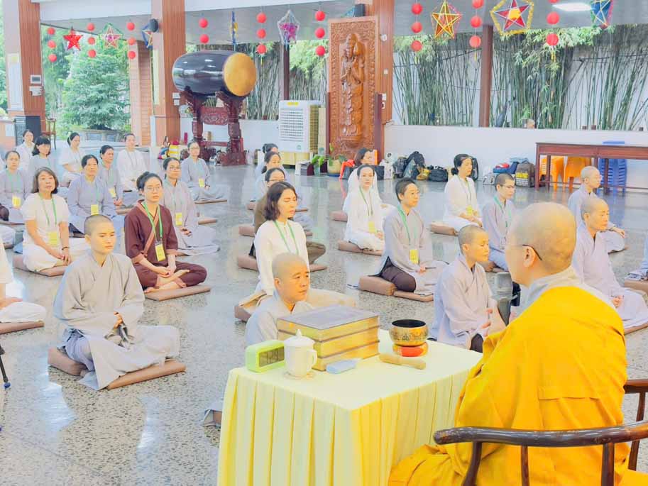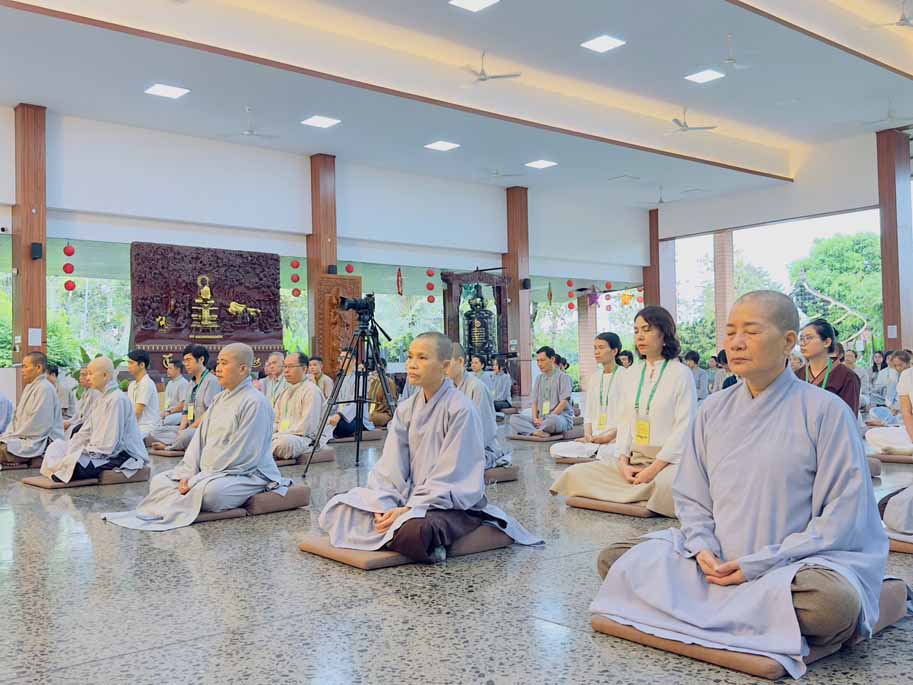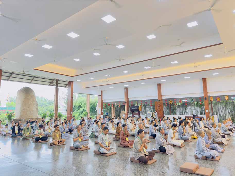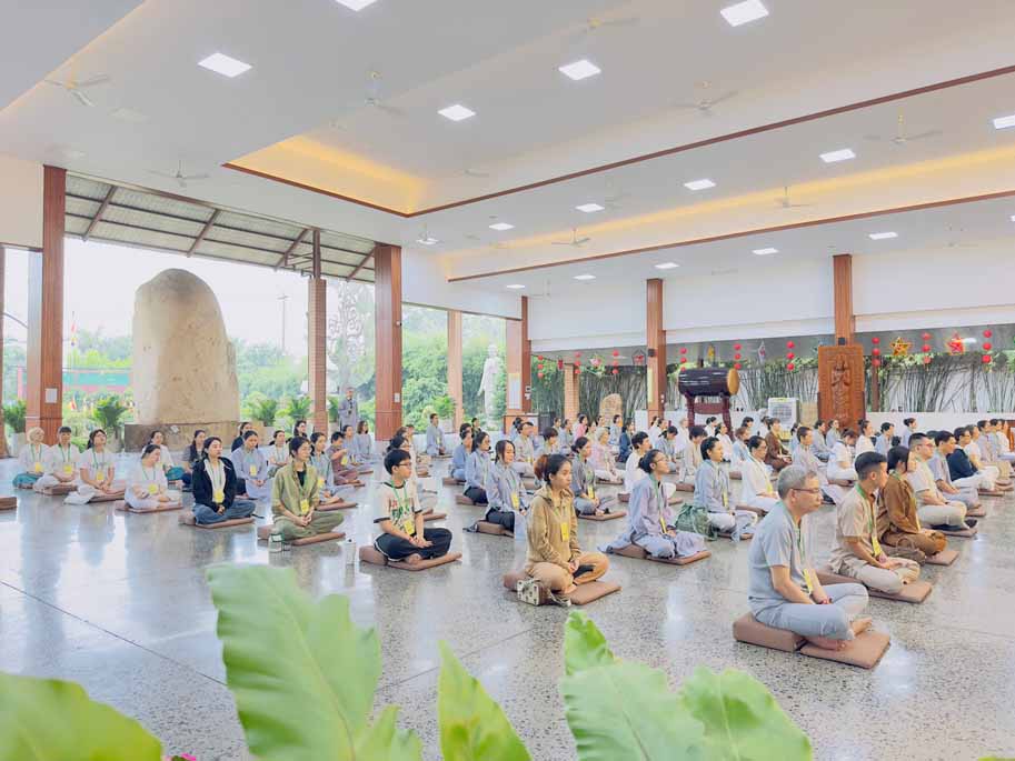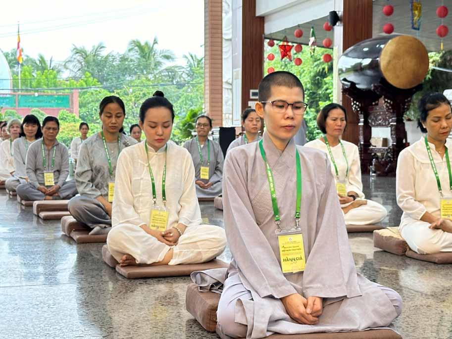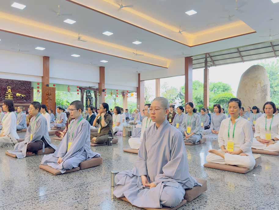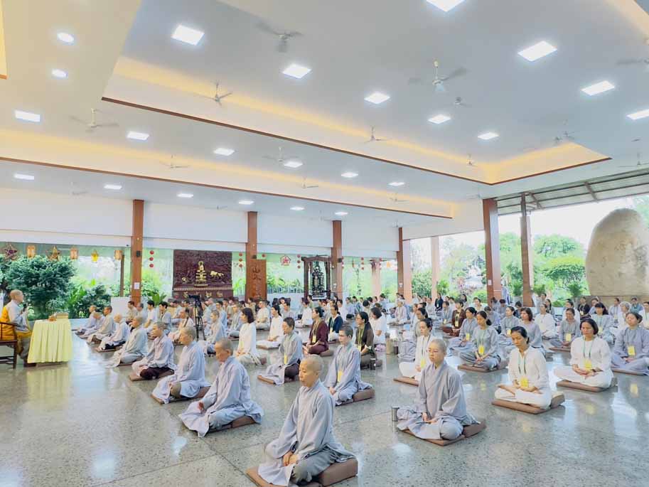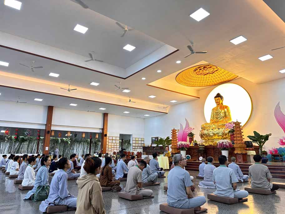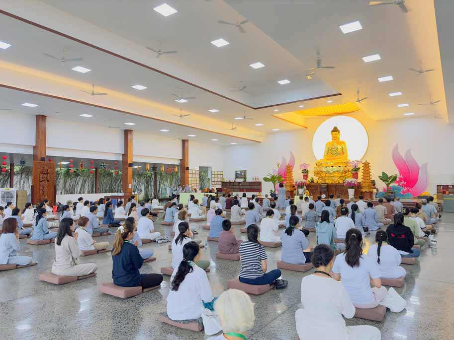 Buổi chiều, đại chúng tiếp tục thực tập thiền tọa và thiền hành kết hợp hơi thở chánh niệm, duy trì sự tỉnh giác trong từng động tác. Không khí tu học diễn ra thanh tịnh, trầm lắng, mỗi hành giả như hòa mình vào nhịp thở chung của đạo tràng.