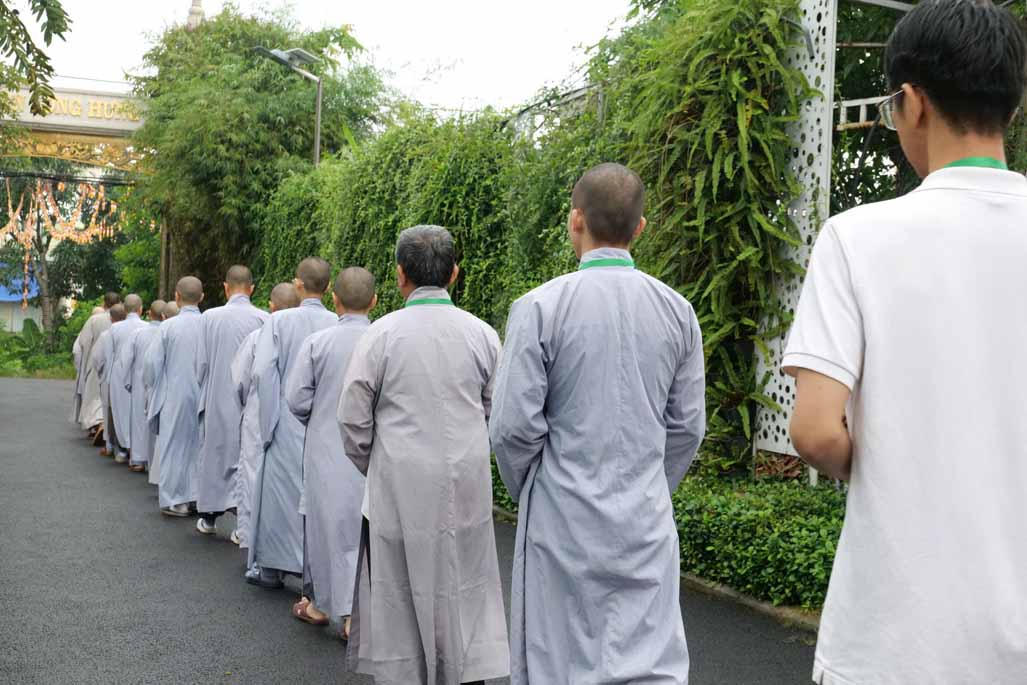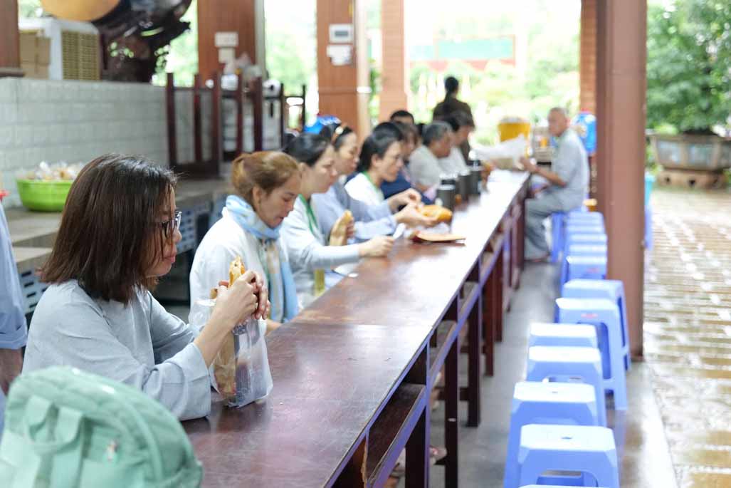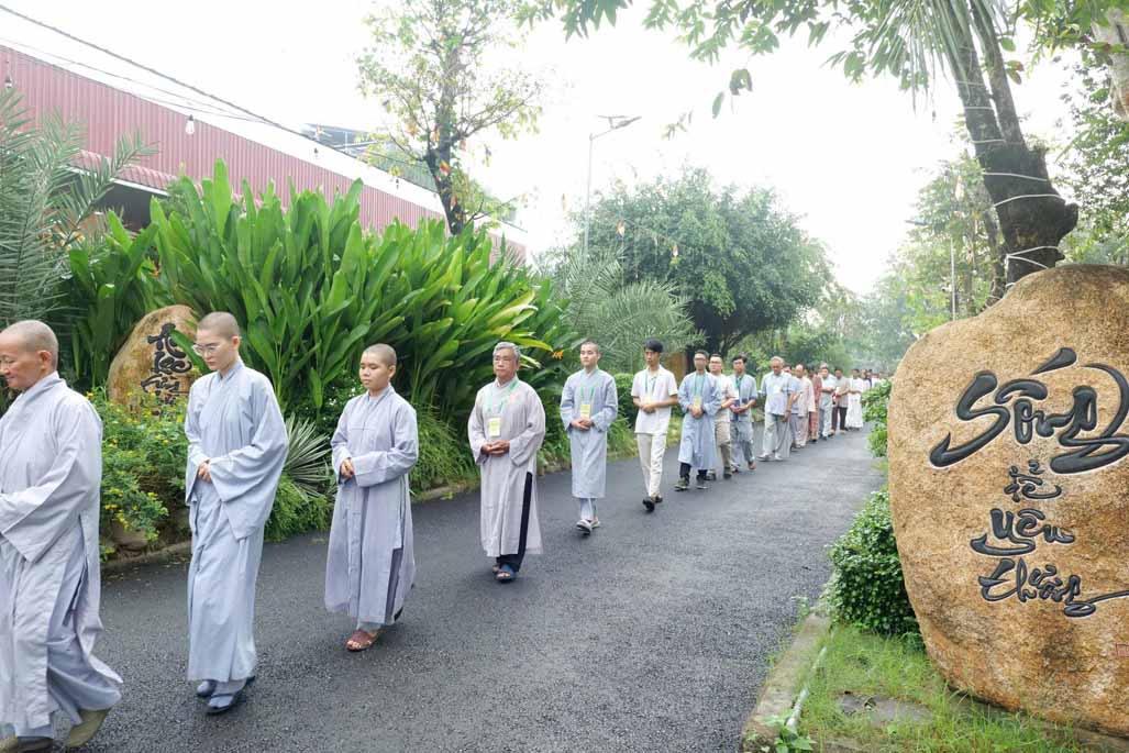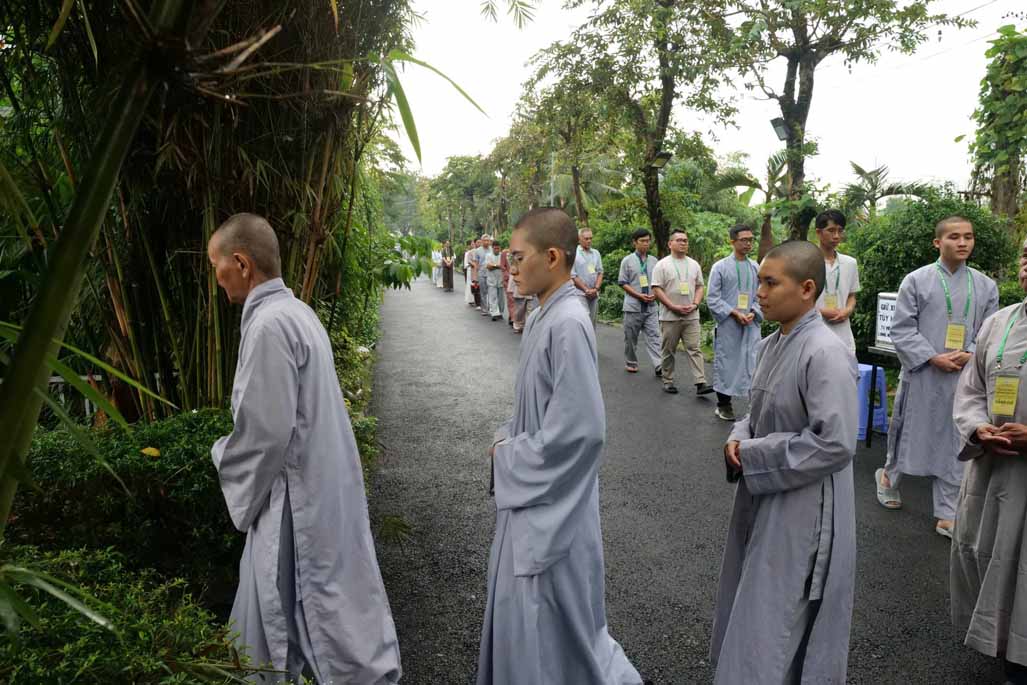 Sau lời khai thị, đại chúng bước vào thời thiền hành buổi sáng. Từng bước chân nhẹ nhàng, thảnh thơi, hòa cùng tiếng chim hót và làn gió sớm đã mang đến không gian thiền vị và yên bình. Mỗi bước đi, mỗi hơi thở đều là cơ hội để hành giả trở về với hiện tại, nhận diện thân và tâm trong sự an trú. Nhiều người chia sẻ cảm giác an lạc lan tỏa khắp thân thể – một sự bình yên đơn sơ nhưng sâu thẳm, mà lâu nay họ đã đánh mất giữa dòng đời vội vã.