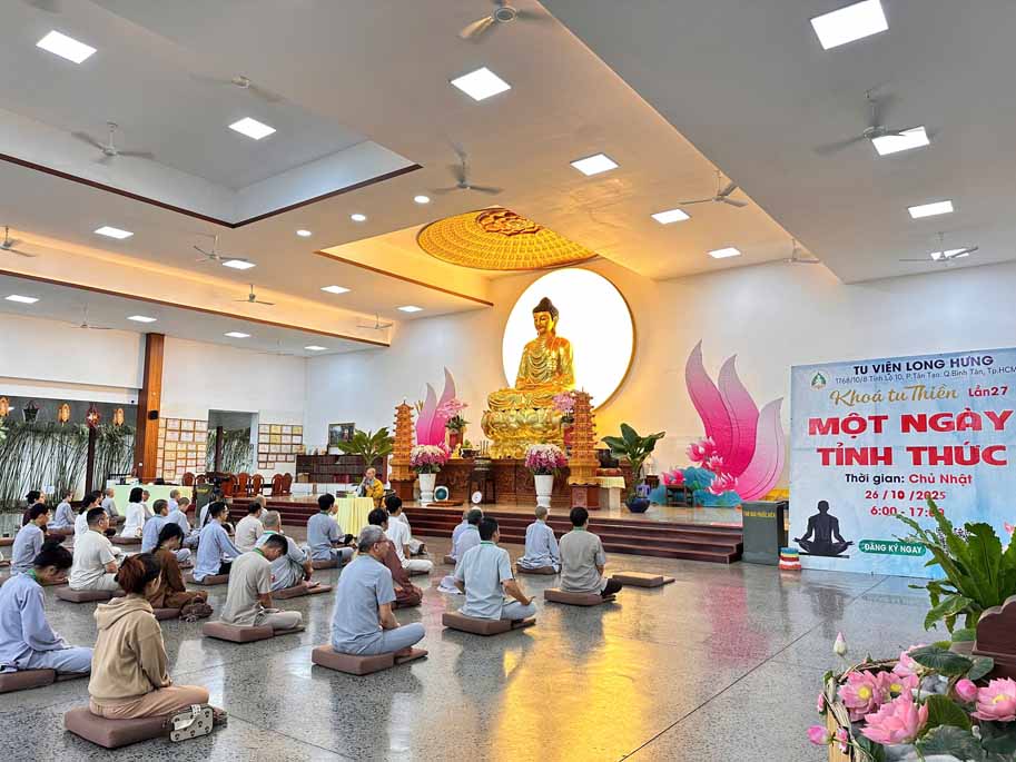 Ngày 26/ 10/ 2025, trong bầu không khí an lành của buổi sớm, Tu viện Long Hưng (P. Bình Tân, TP. HCM) đã trang nghiêm tổ chức Khóa tu thiền “Một ngày tỉnh thức” lần thứ 27, thu hút hơn 100 hành giả từ nhiều nơi trở về cùng tu tập, gieo trồng hạt giống tỉnh thức trong tâm.