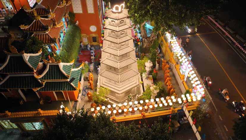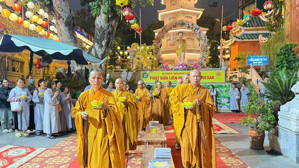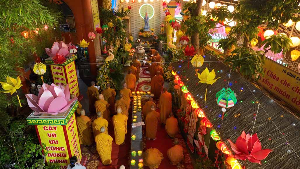 Sau đó chư Tăng cùng Phật tử đã nhiễu hoa đăng, chiêm bái hình ảnh từ bi của Bồ Tát trong ánh sáng lung linh nhiệm màu rồi vân tập về dưới tôn tượng Quan Thế Âm lộ thiên tiến hành lễ lạy ngũ bách danh Quán Thế Âm.