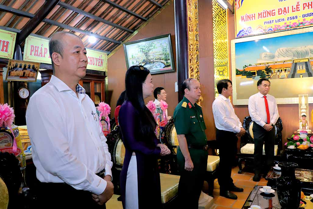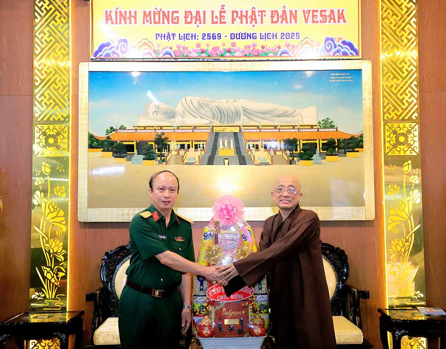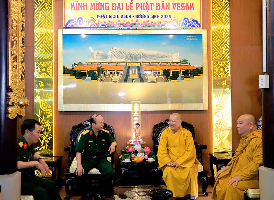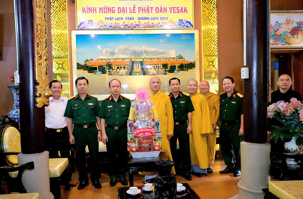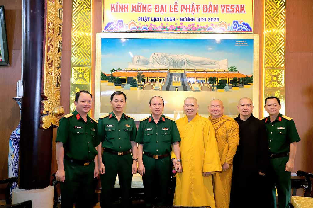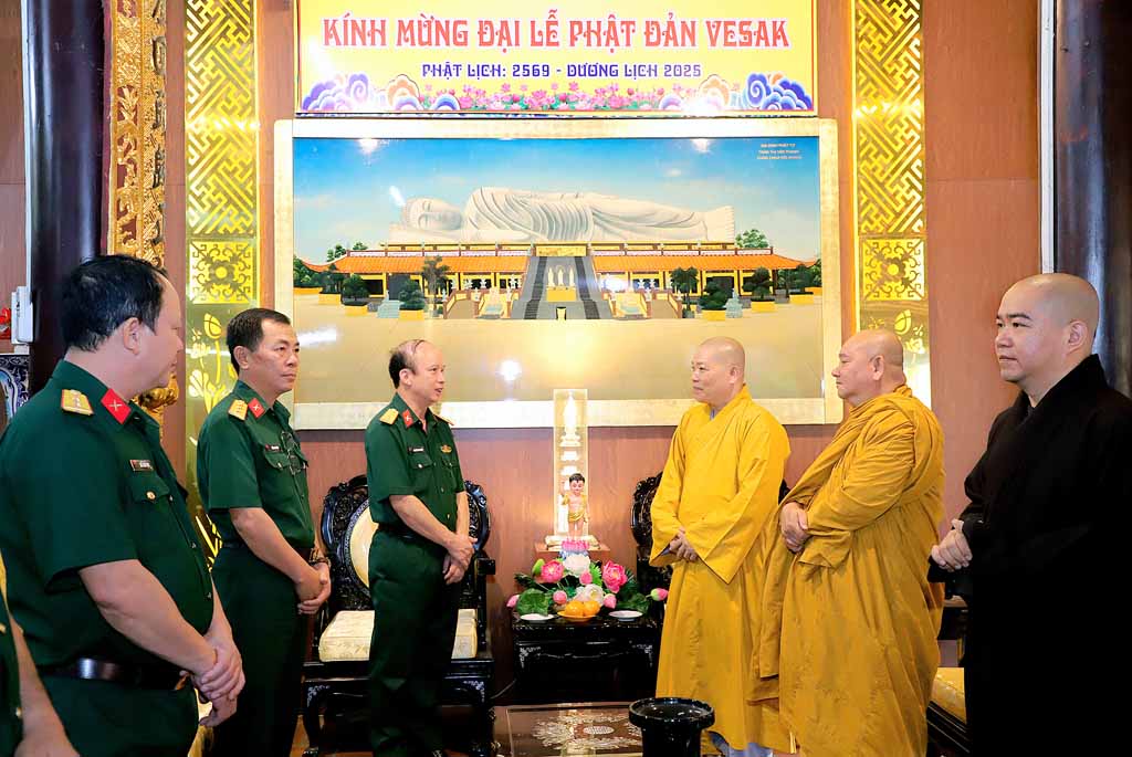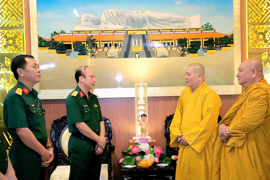 Cùng thời gian trên, lãnh đạo Bộ Chỉ huy Quân sự tỉnh do Đại tá Nguyễn Đình Chuẩn – Tỉnh uỷ viên, Chính ủy BCHQS tỉnh Bình Dương cùng các thành viên cũng trân trọng chúc mừng chư Tăng Ni, bà con Phật tử tỉnh nhà đón Đại lễ Phật đản Phật lịch 2569 – Dương lịch 2025 vạn sự an lạc, vui tươi và hạnh phúc. Mong các vị Tăng Ni tiếp tục phát huy những mặt tích cực trong hoạt động Phật sự, vận động đồng bào Phật tử chấp hành tốt chủ trương của Đảng, chính sách, pháp luật của Nhà nước; thực hiện nhiều hoạt động an sinh xã hội chào mừng tuần lễ Phật đản….