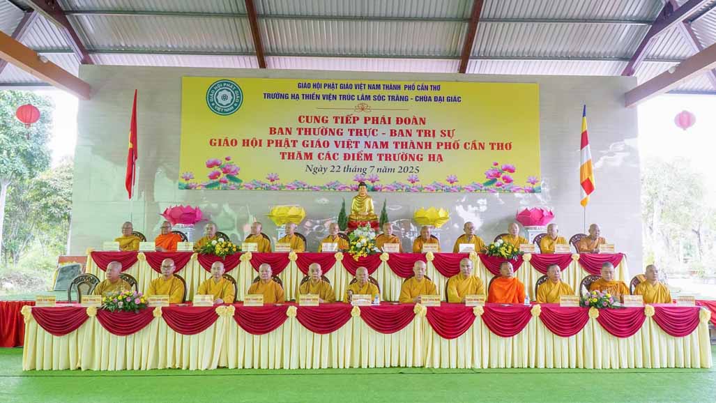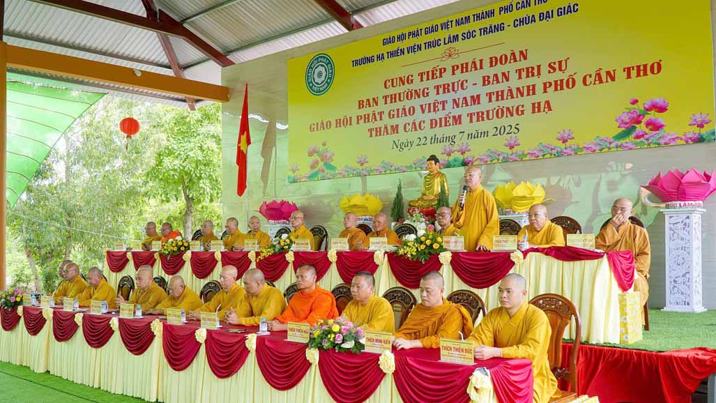 Tiếp đón Phái đoàn có: HT. Thích Minh Thành – Ủy viên Hội đồng Trị sự GHPGVN, Chứng minh ban Trị sự PG TP. Cần Thơ, Hóa chủ trường hạ Thiền Viện Trúc Lâm Sóc Trăng. HT. Thích Thiện Thạnh Chứng minh ban Trị sự PG TP. Cần Thơ, Thiền chủ Trường hạ Thiền Viện Trúc Lâm Sóc Trăng, TT. Thích Thiện Nguyện -Ủy viên Hội đồng Trị sự GHPGVN, Phó Trưởng ban kiêm Chánh Thư ký BTS PG Tp. Cần Thơ, Phó Hóa chủ Trường hạ. Ni trưởng Thích Như Thân – Thiền chủ Trường hạ Chùa Đại Giác cùng hiện diện là chư Tôn giáo phẩm, chư Tôn đức Tăng Ni trụ trì các tự viện và hành giả an cư của hai điểm trường hạ.