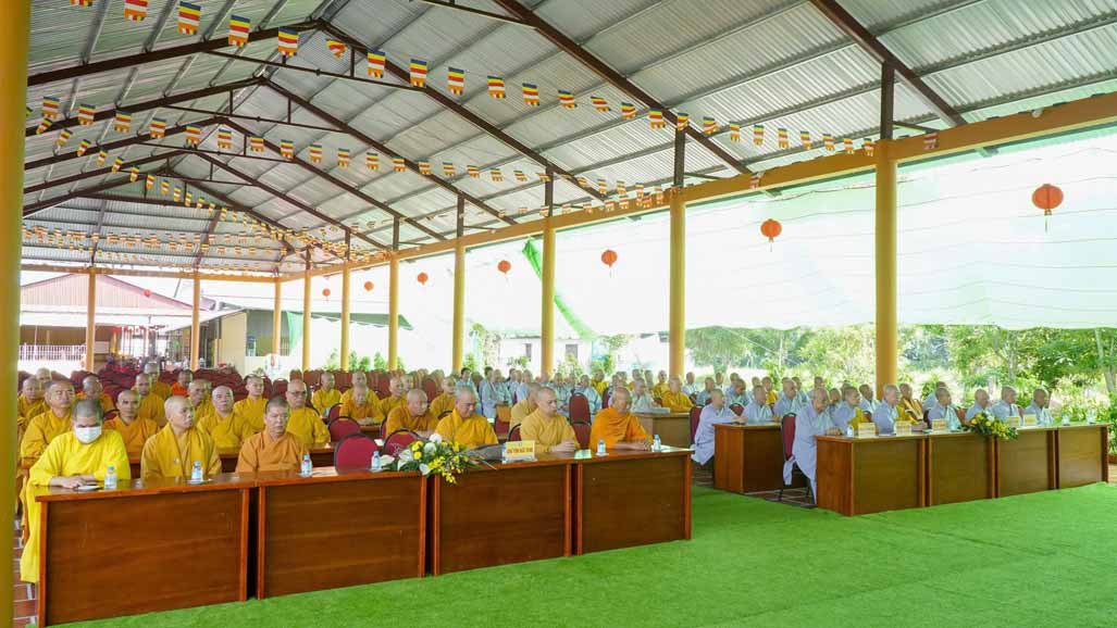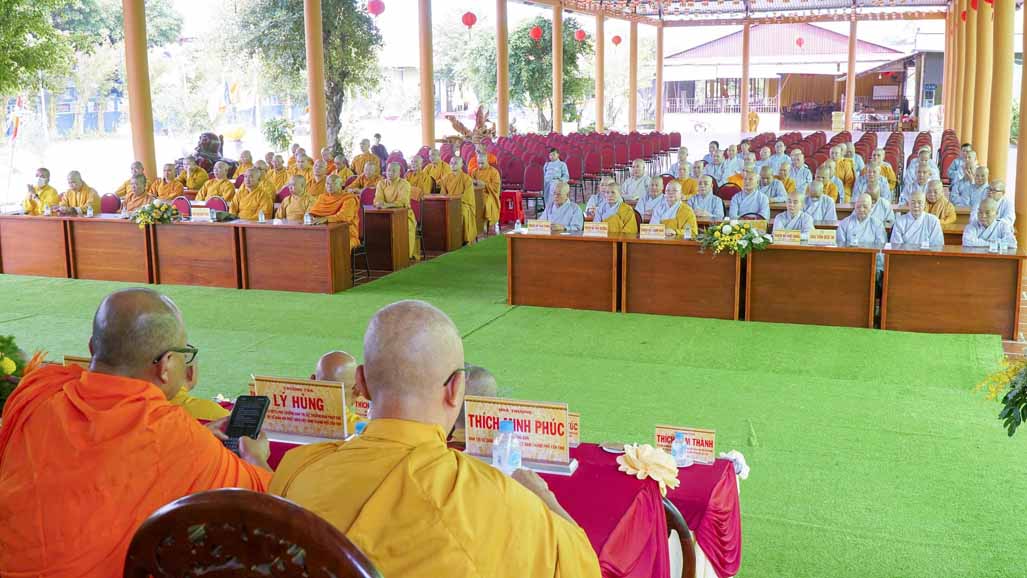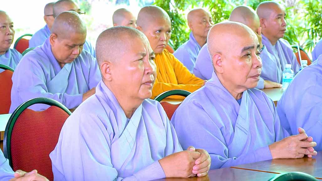 Tiếp theo, TT. Thích Thiện Nguyện đã trình bày báo cáo khái quát tình hình tu học và sinh hoạt hành trì của chư hành giả an cư tại hai điểm Trường hạ: Trường hạ Tăng tại Thiền viện Trúc Lâm Sóc Trăng (số 69 Trần Nhân Tông, phường Phú Lợi, Tp. Cần Thơ) có 109 hành giả an cư nội thiền và ngoại thiền. Trường hạ Ni tại Chùa Đại Giác (số 542 Nguyễn Huệ, phường Phú Lợi, Tp. Cần Thơ) có 155 hành giả an cư nội thiền và ngoại thiền. Công phu tu học của chư hành giả diễn ra nghiêm túc, thanh tịnh, đúng tinh thần pháp an cư kiết hạ; thể hiện rõ sự tiến tu đạo nghiệp và tinh thần hòa hợp trong Tăng đoàn.