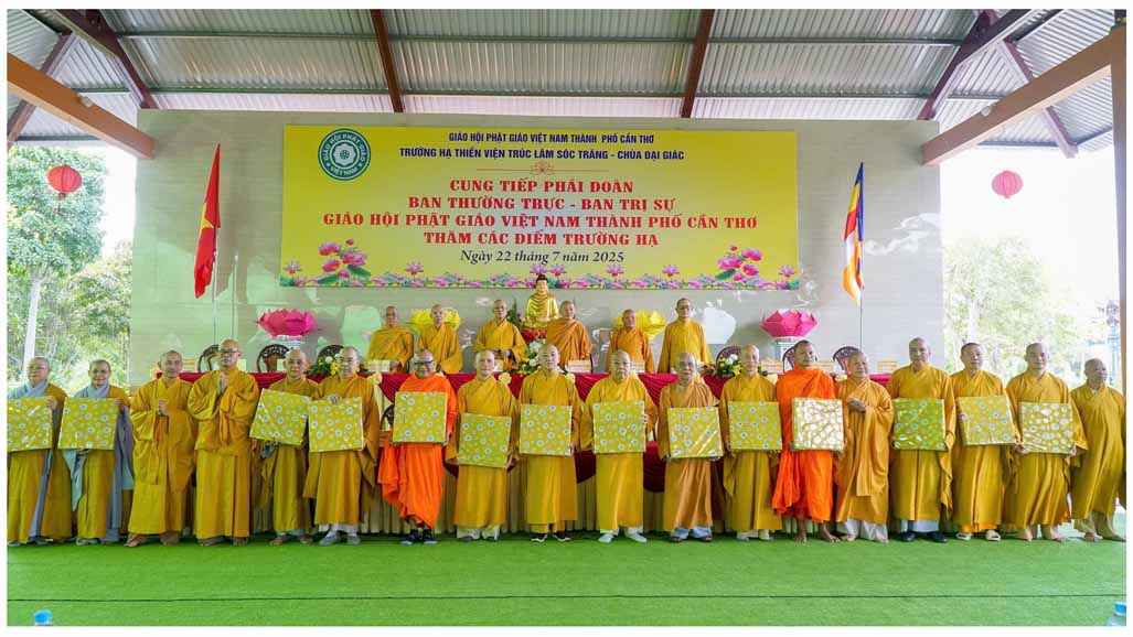 Ngày 22/ 7/ 2025 (28 tháng 6 năm Ất Tỵ), tại Thiền viện Trúc Lâm Sóc Trăng và chùa Đại Giác, chư Tôn đức Tăng Ni Ban Chức sự hai điểm trường hạ cùng quý Tăng Ni trụ trì và hành giả an cư, đã trang nghiêm cung đón Phái đoàn ban Thường trực BTS GHPGVN Tp. Cần Thơ quang lâm thăm và sách tấn chư hành giả an cư.