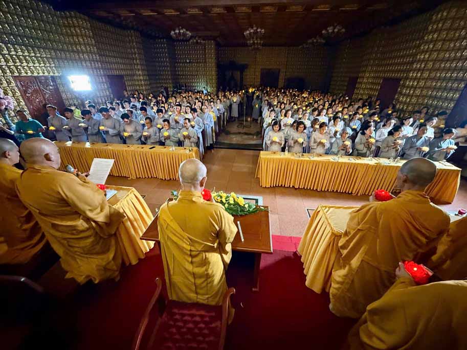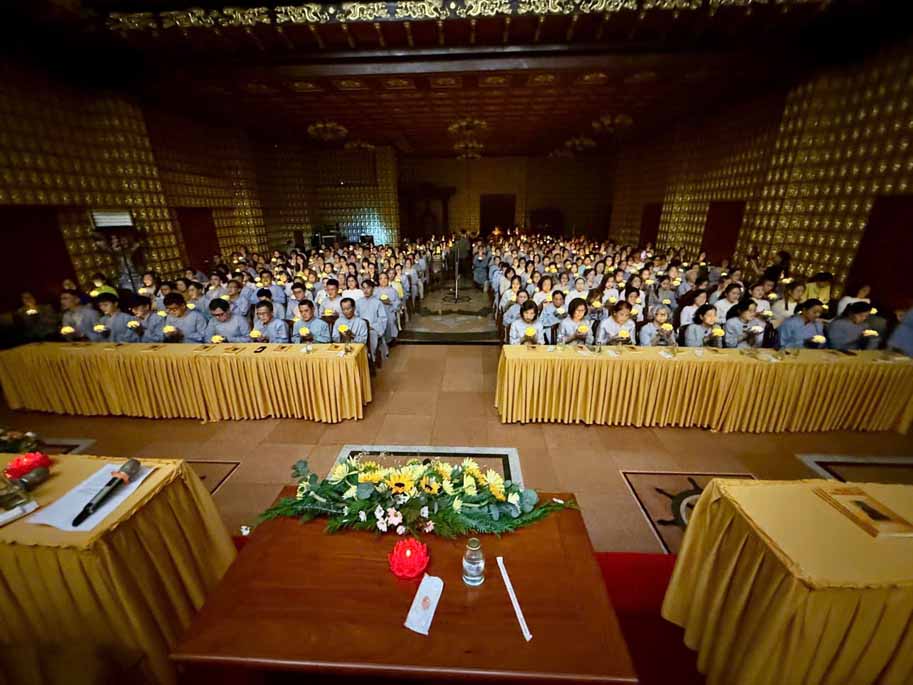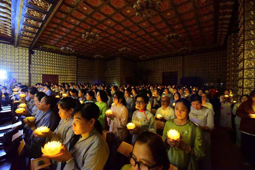 Thời kinh kết thúc cũng là lúc những ngọn đăng quang lần lượt được truyền trao, thắp lên nguồn sáng trong lành tưởng nhớ ngày thành đạo cao quý của bậc đại giác.
