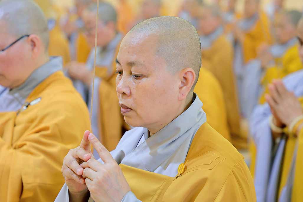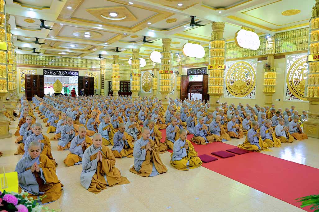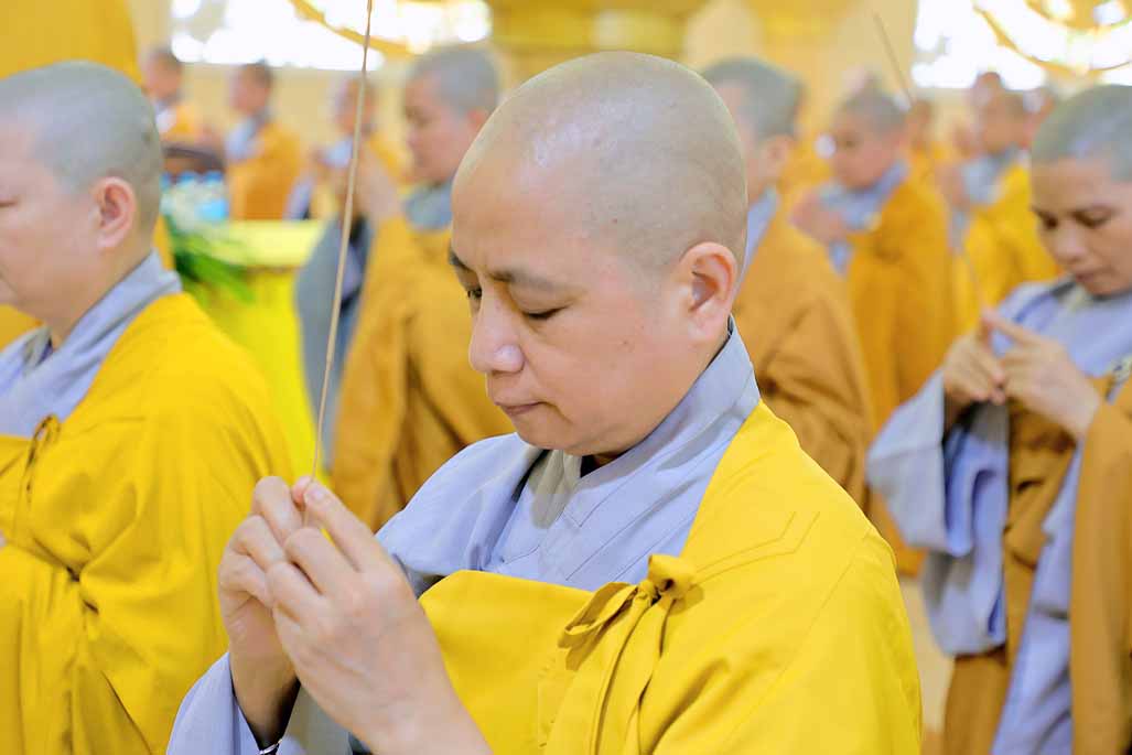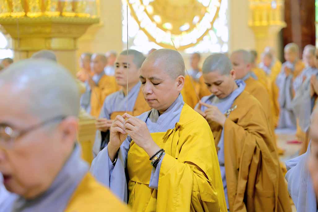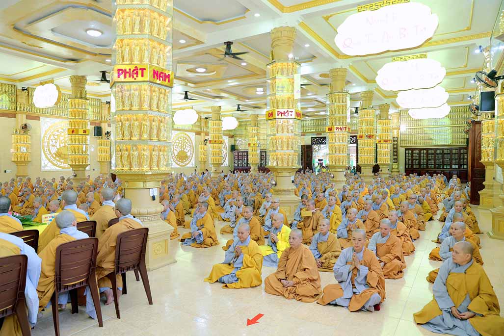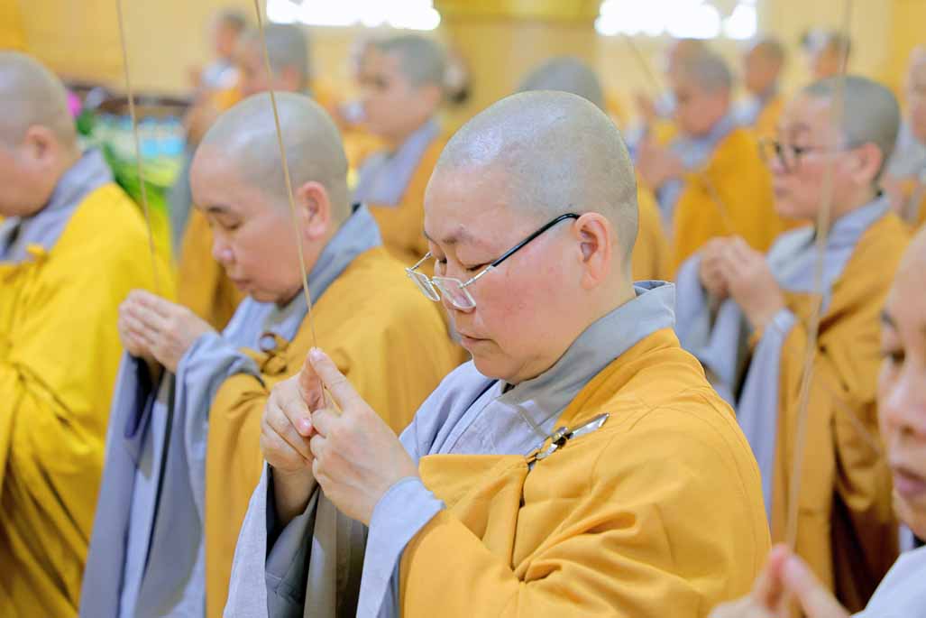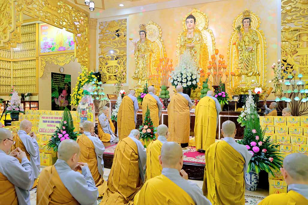 Toàn thể Hội chúng niêm hương đảnh lễ Tam bảo, tại Chánh điện A Mi chùa Long Vân.
