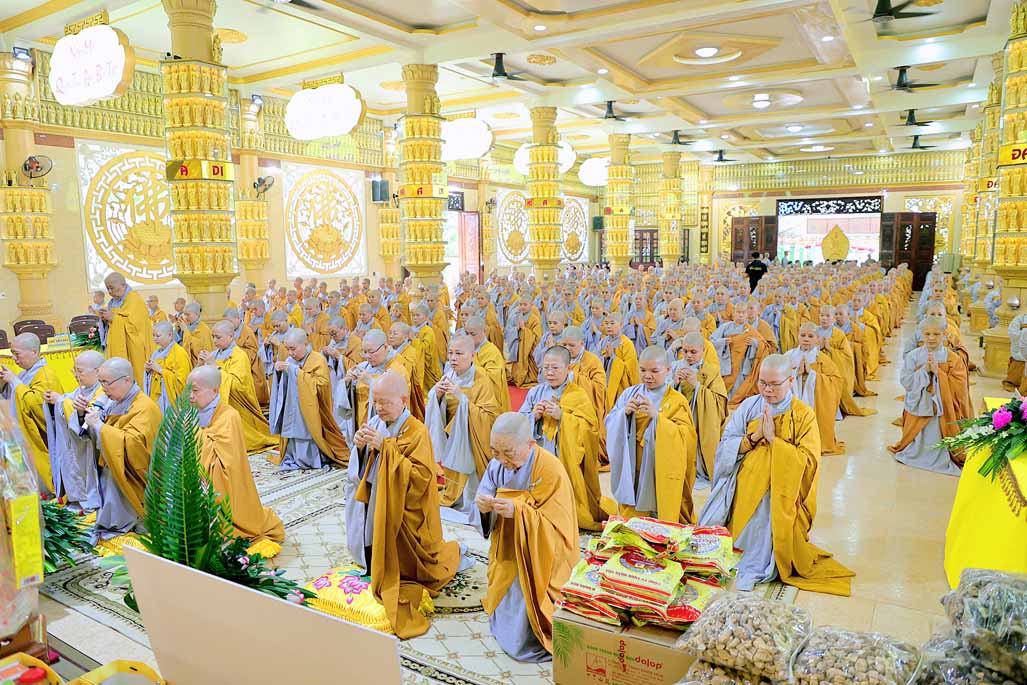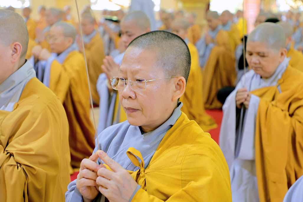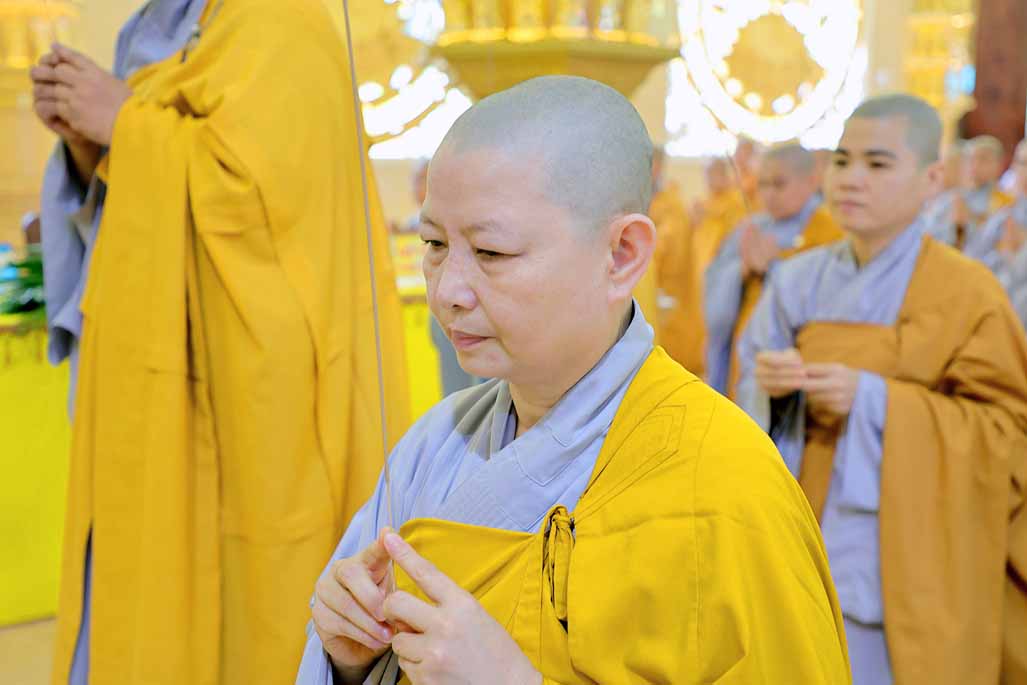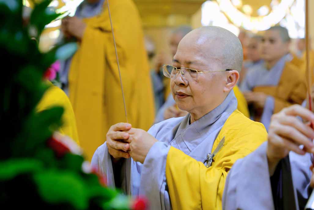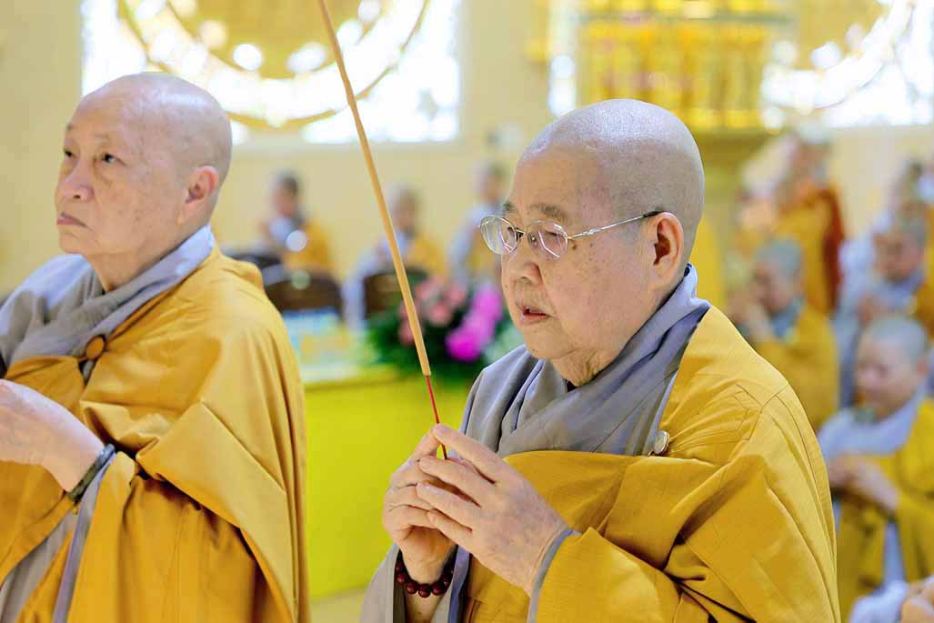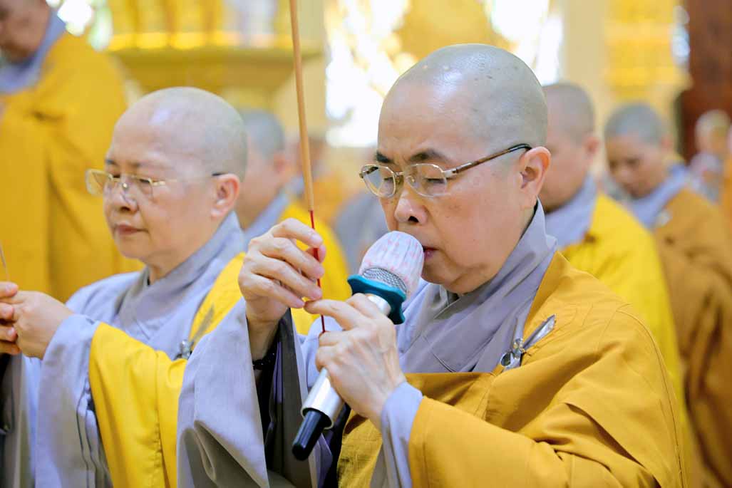 Toàn thể Hội chúng niêm hương đảnh lễ Tam bảo, tại Chánh điện A Mi chùa Long Vân.