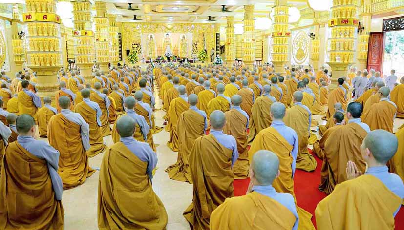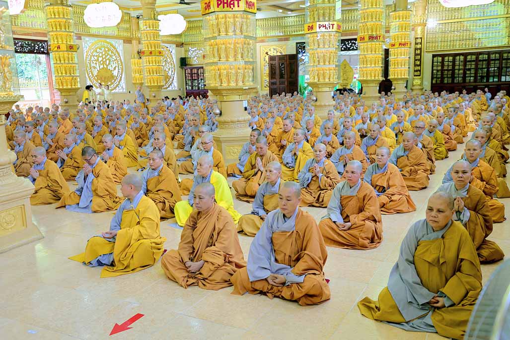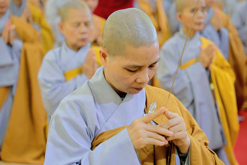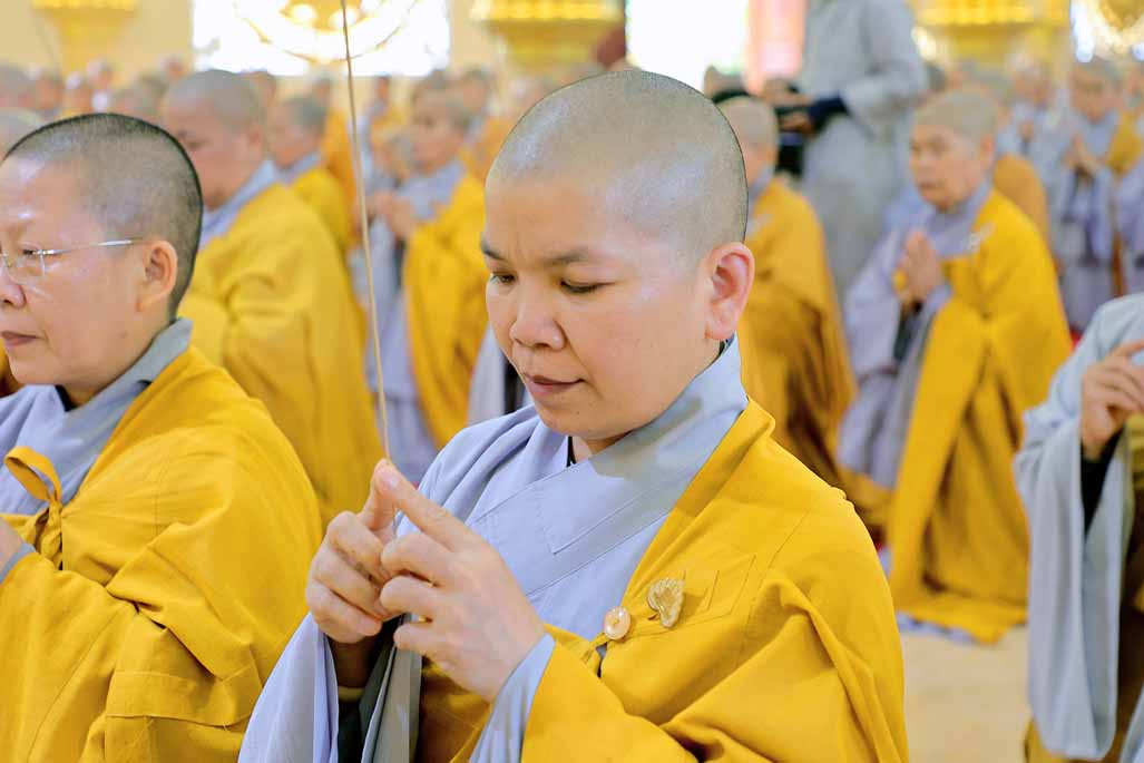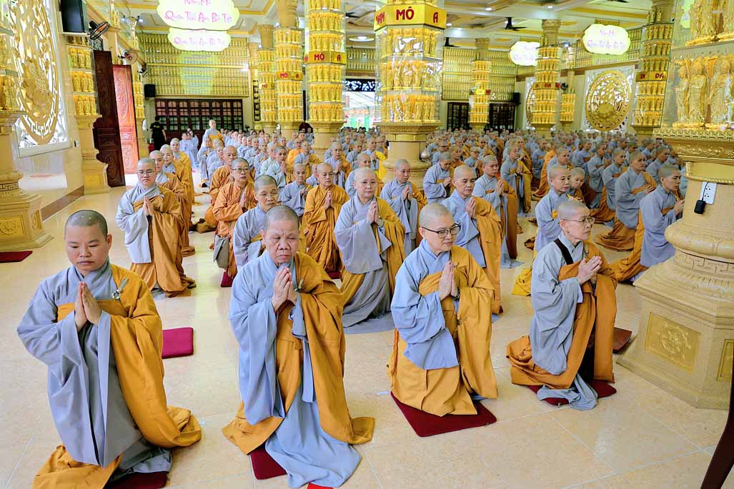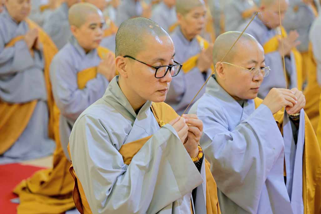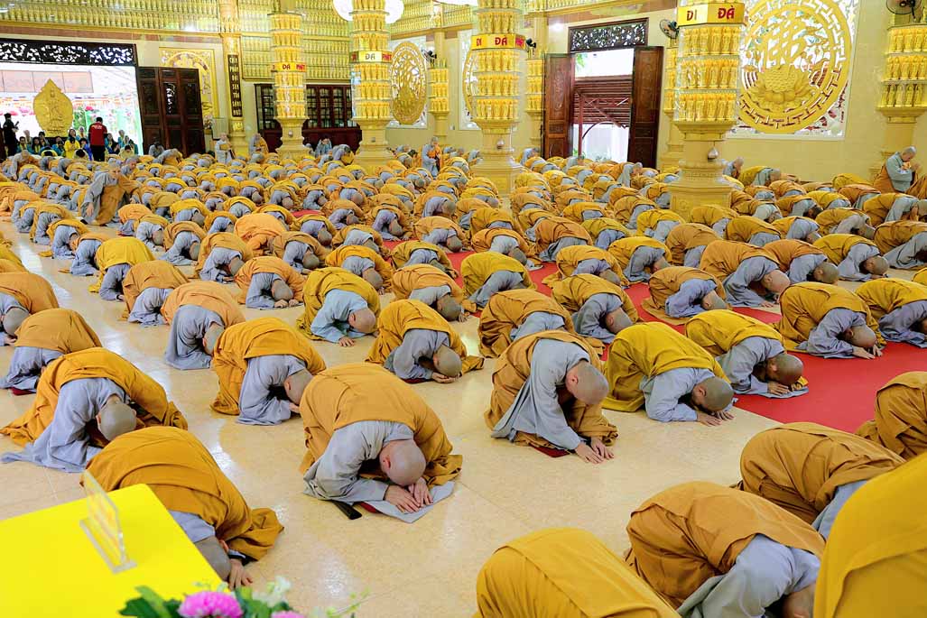 Toàn thể Hội chúng niêm hương đảnh lễ Tam bảo, tại Chánh điện A Mi chùa Long Vân.