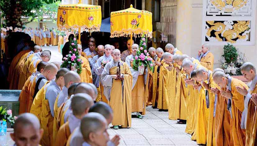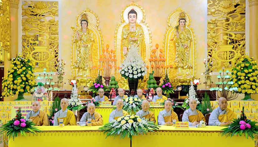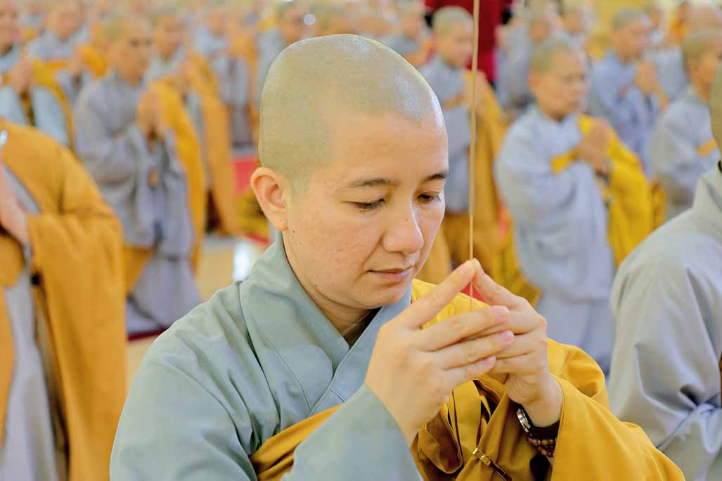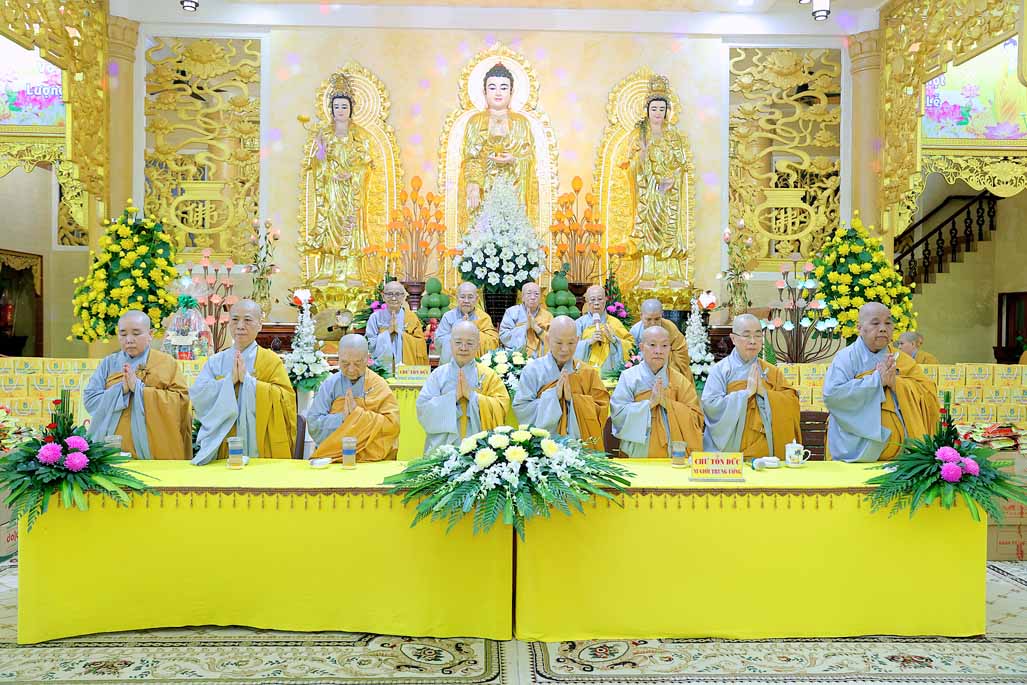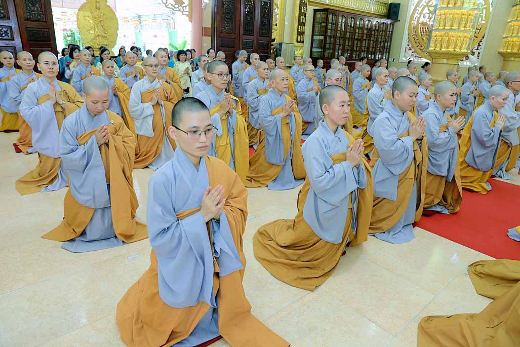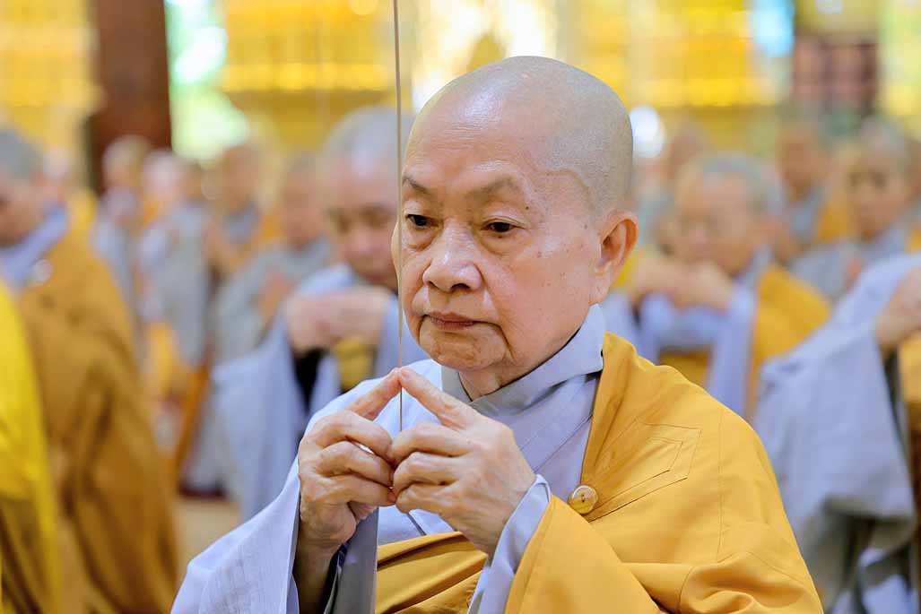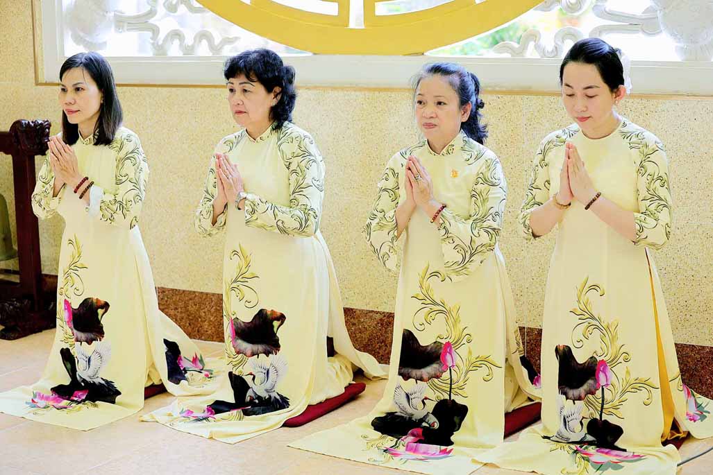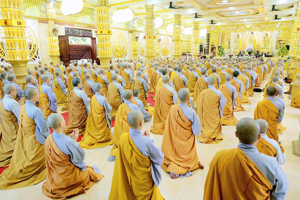 Toàn thể Hội chúng niêm hương đảnh lễ Tam bảo, tại Chánh điện A Mi chùa Long Vân.