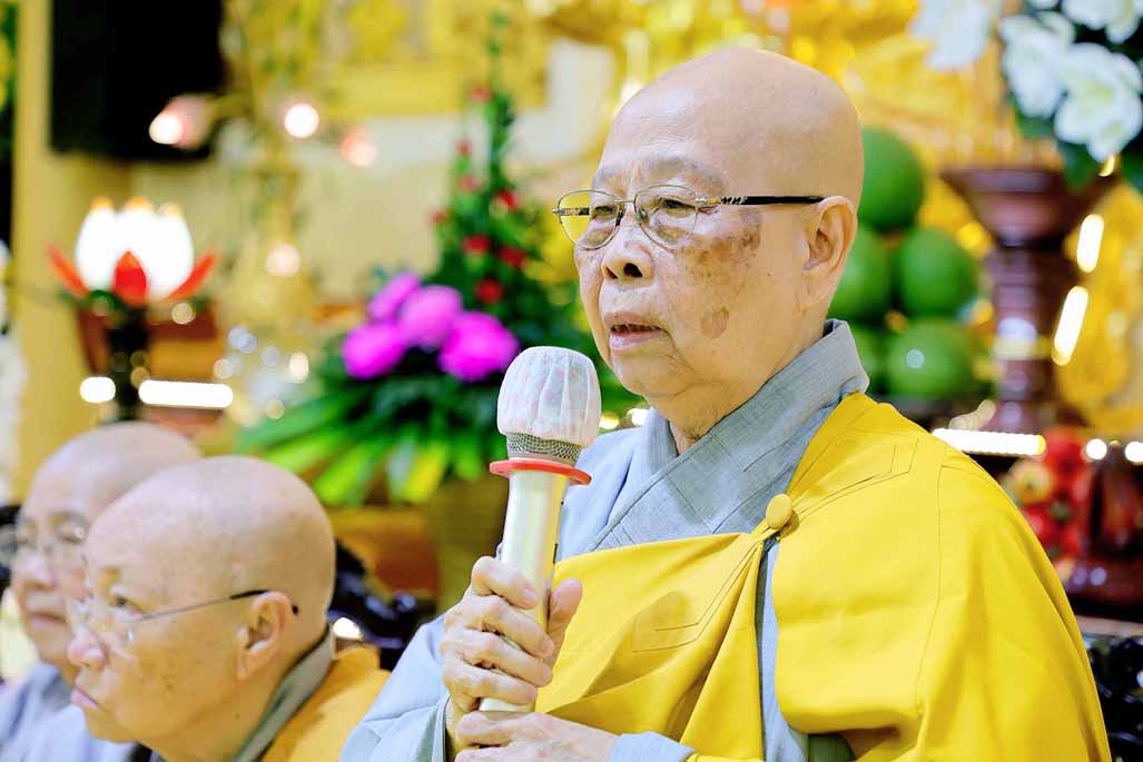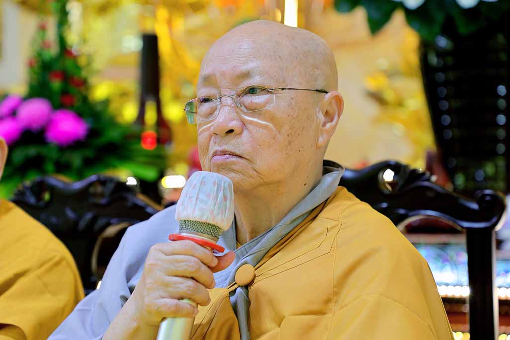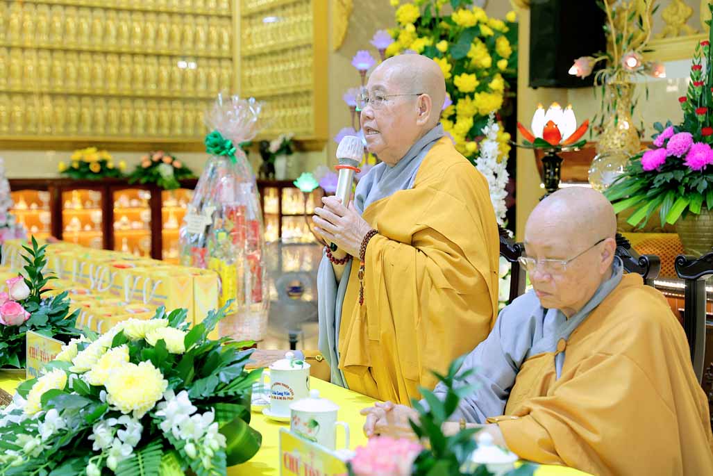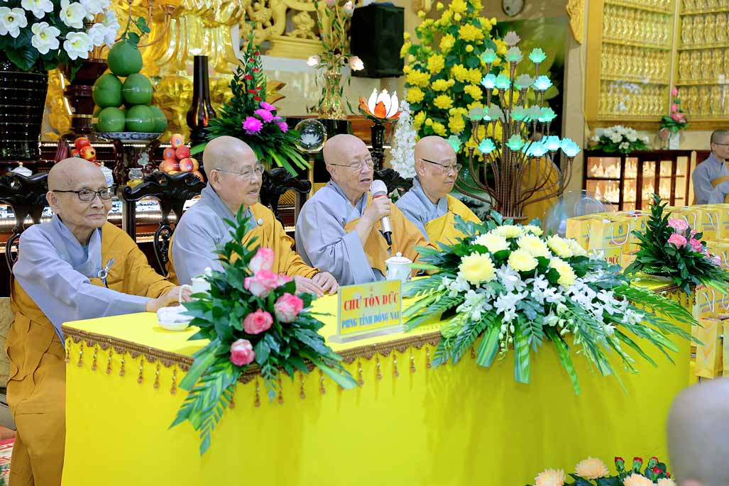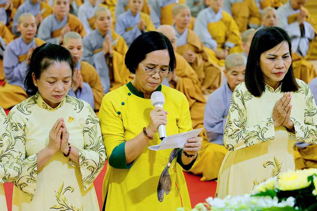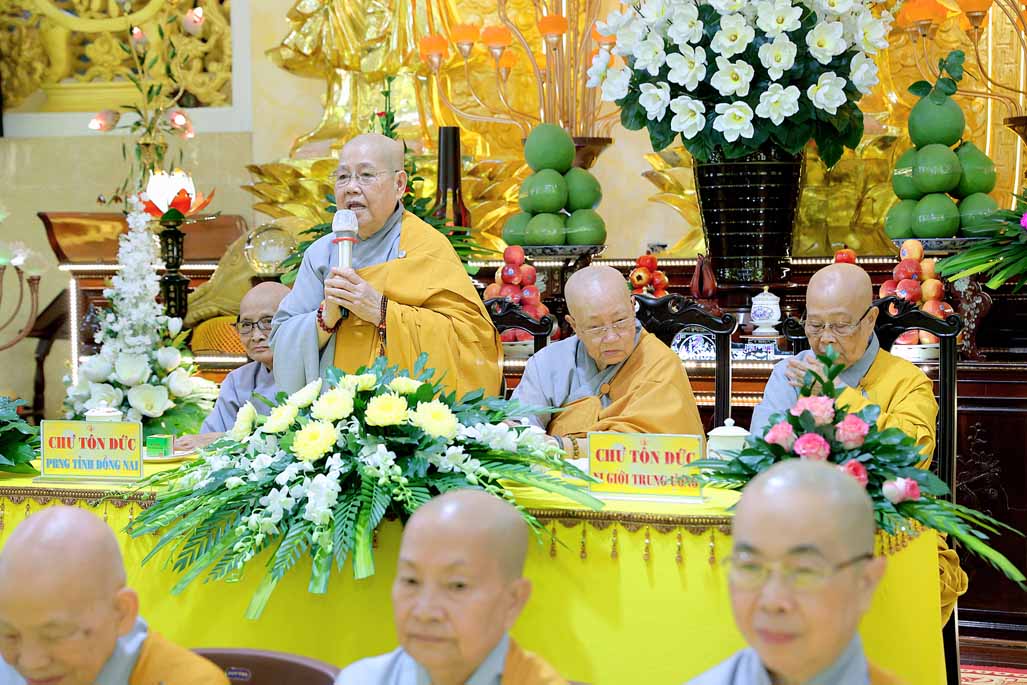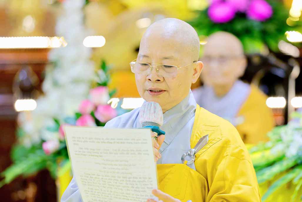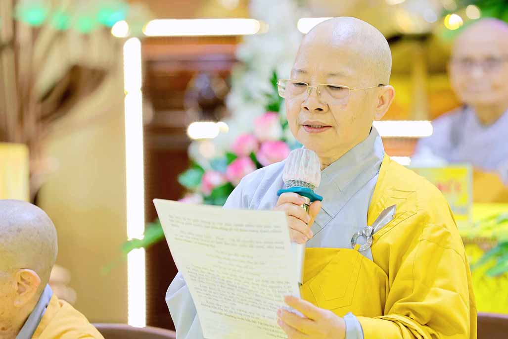 Tiếp đến, NT. Thích Như Thảo đại diện phái đoàn tuyên đọc bức tâm thư của Ni trưởng trưởng PBNG Trung ương gửi đến chư Hành giả an cư cả nước nói chung và hành giả an cư tại đạo tràng chùa Long Vân tỉnh Đồng Nai nói riêng. Trong tâm thư có đoạn: “ Hãy thắp sáng Giới – Định – Tuệ để chuyển hóa chính mình và lan tỏa năng lượng an lành đến mọi miền đất nước, như trong kinh Pháp Cú thường dạy: