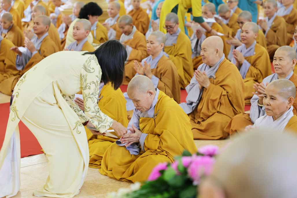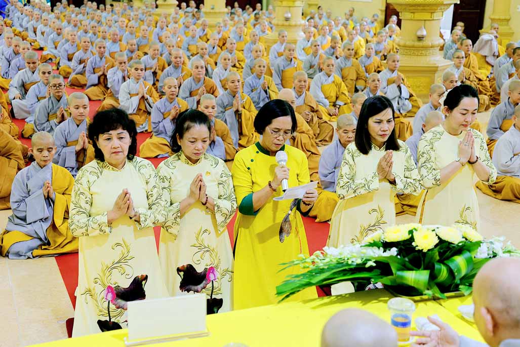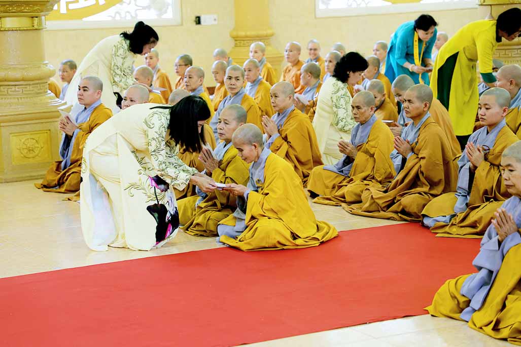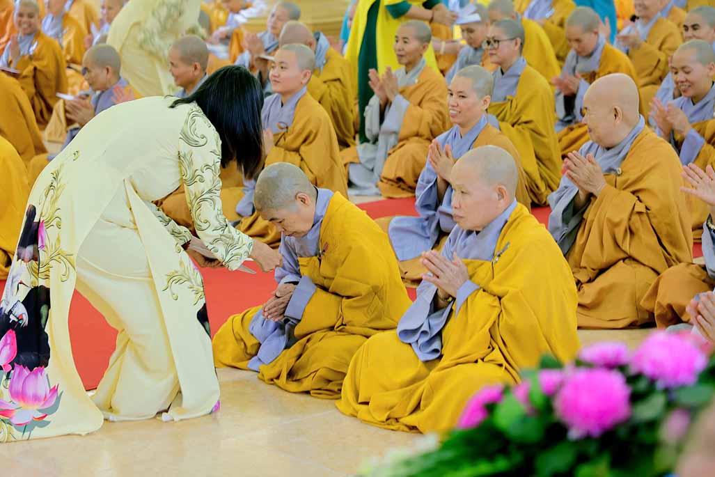 Tiếp đến, theo sự hướng dẫn của quý Ni Trưởng, Phật tử Diệu Đức – Đại diện hàng Phật tử dâng lời tác bạch cúng dường tịnh tài, tịnh vật lên chư hành giả Ni.