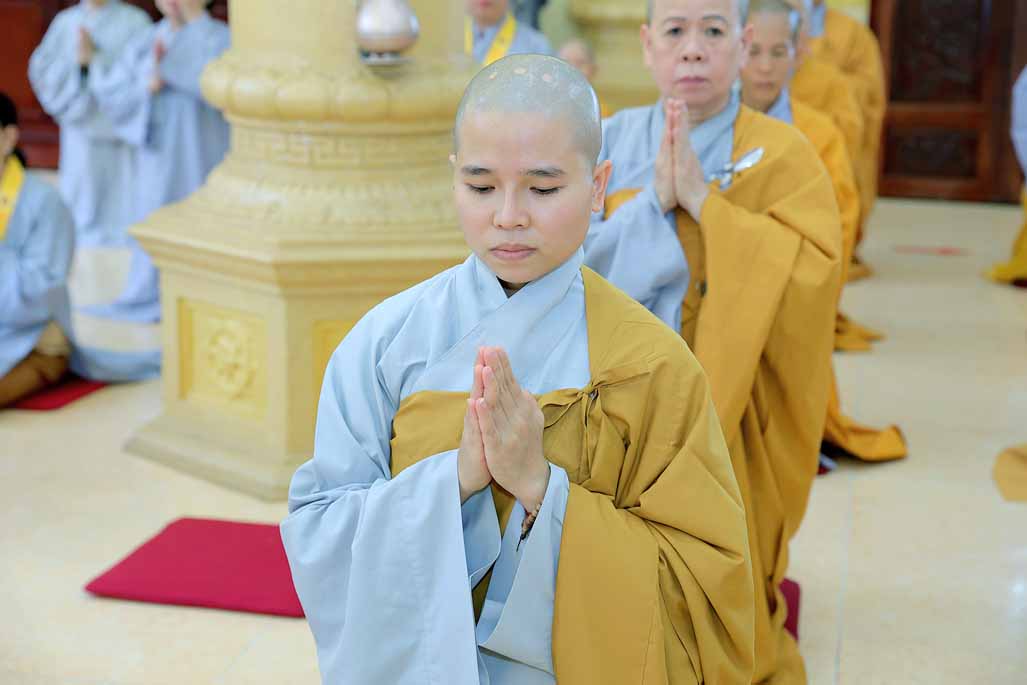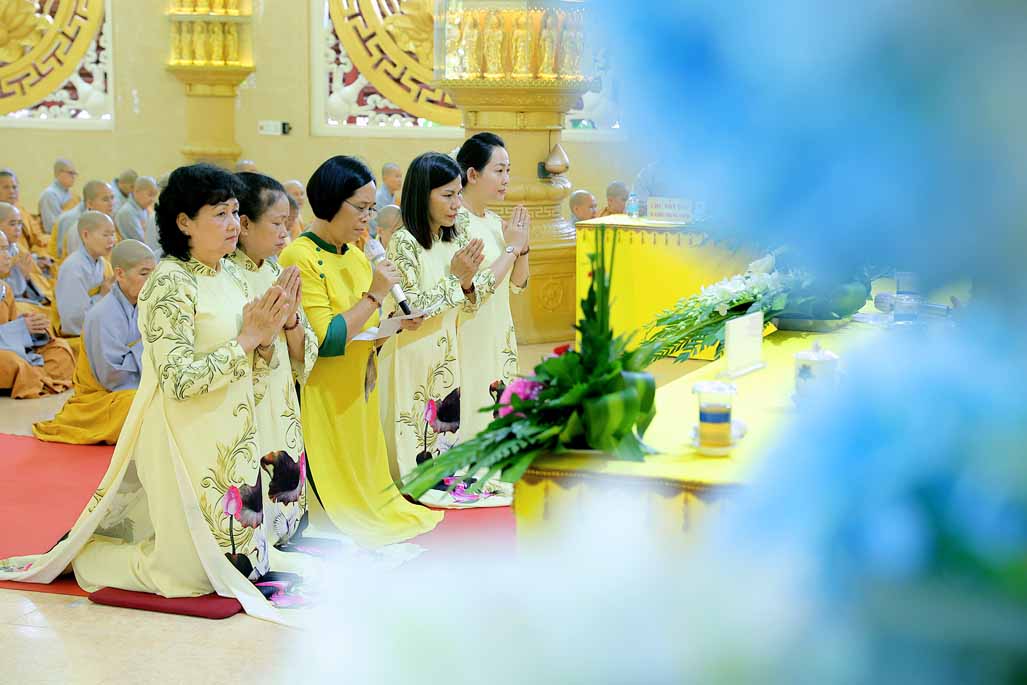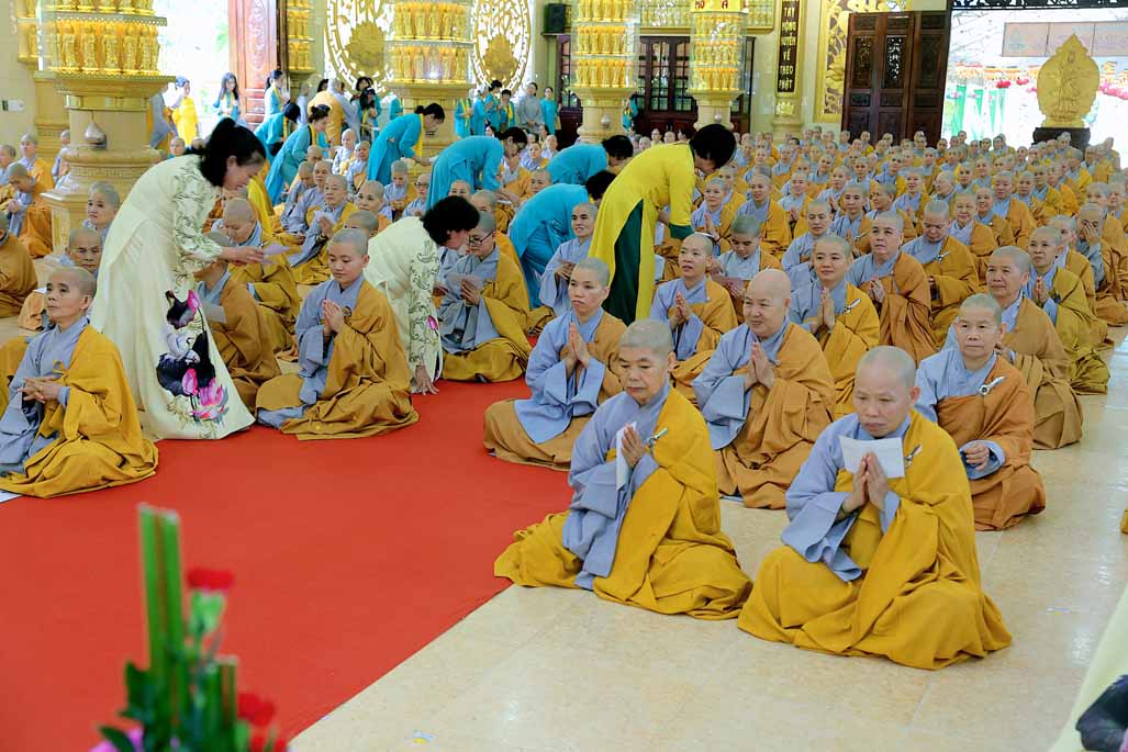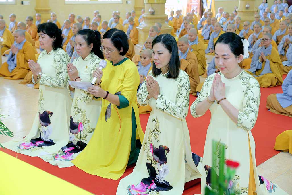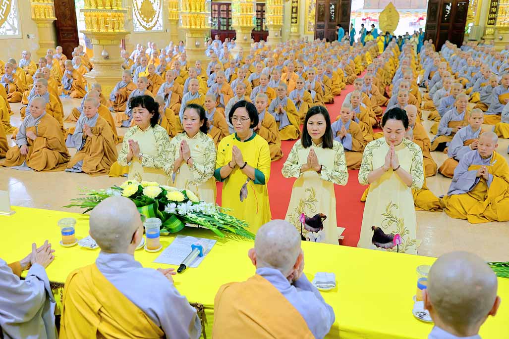 Tiếp đến, theo sự hướng dẫn của quý Ni Trưởng, Phật tử Diệu Đức – Đại diện hàng Phật tử dâng lời tác bạch cúng dường tịnh tài, tịnh vật lên chư hành giả Ni.