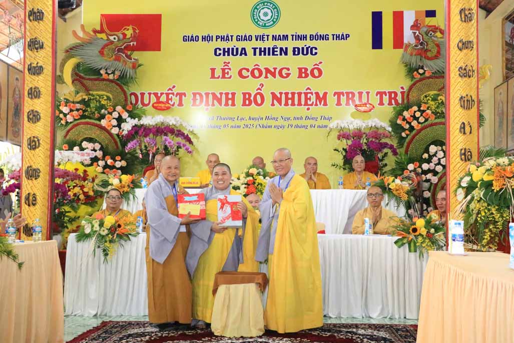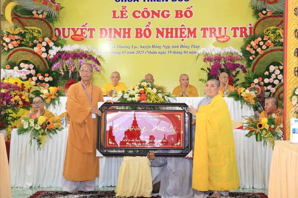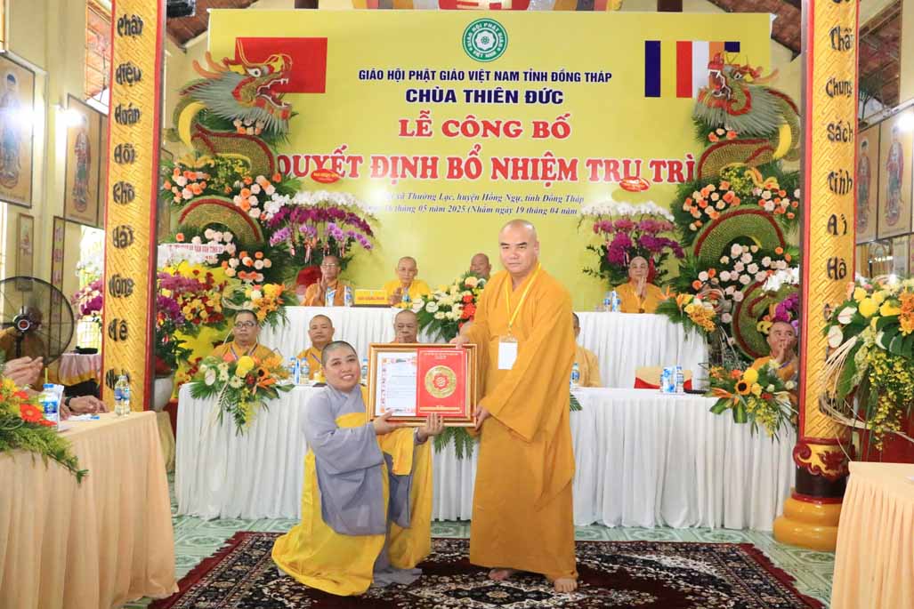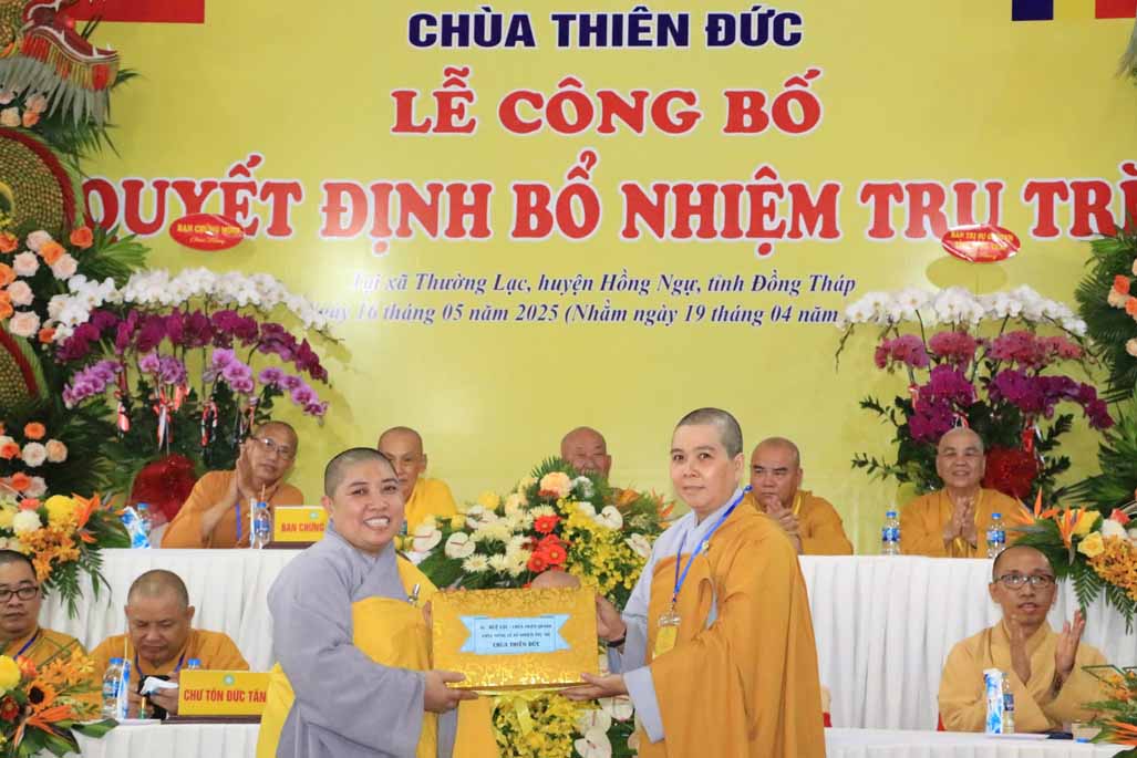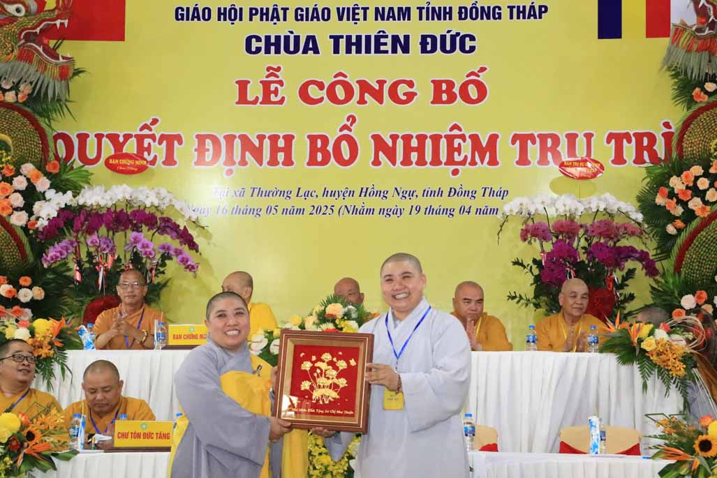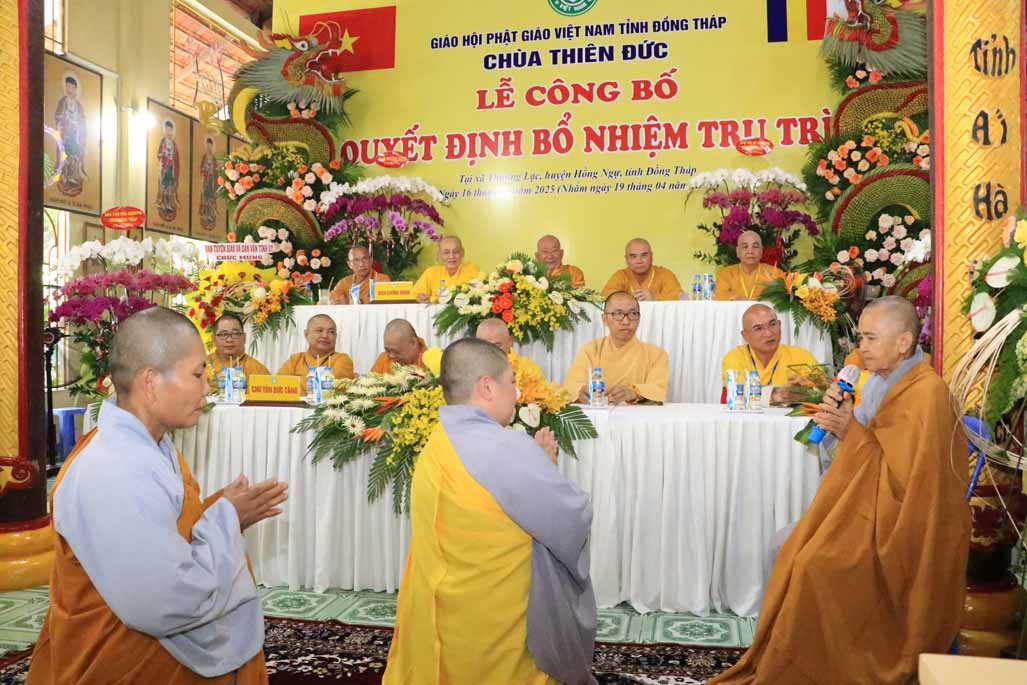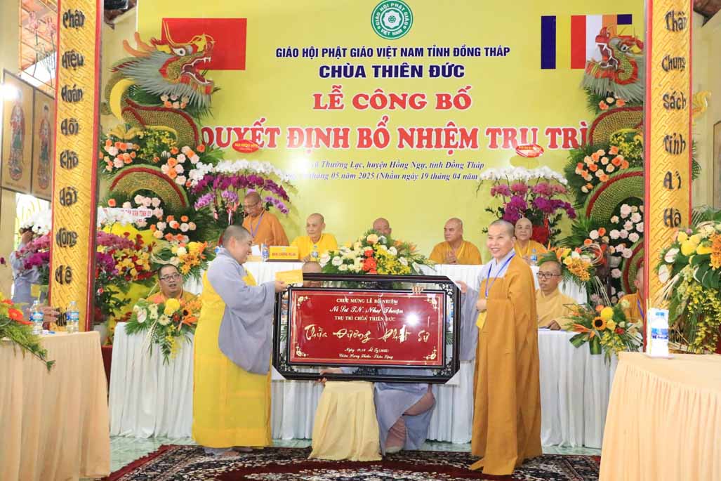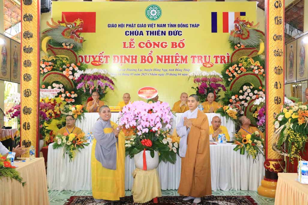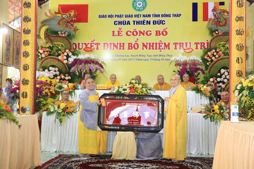 Tại buổi lễ, Thượng tọa Thích Minh Sơn đọc quyến định số 15/QĐ-BTS, ngày 04 tháng 04 năm 2025 của ban Trị sự GHPGVN tỉnh Đồng Tháp bổ nhiệm trụ trì chùa Thiên Đức xã Thường Lạc, huyện Hồng Ngự do Ni sư Thích nữ Như Thuận (thế danh Nguyễn Thị Thu Huyền, SN. 1976), Ủy viên BTS GHPGVN tỉnh, Phó ban BTS GHPGVN huyện Tam Nông, tốt nghiệp cử nhân Phật học tại Tp. Hồ Chí Minh; đảm nhiệm chức vụ trụ trì.