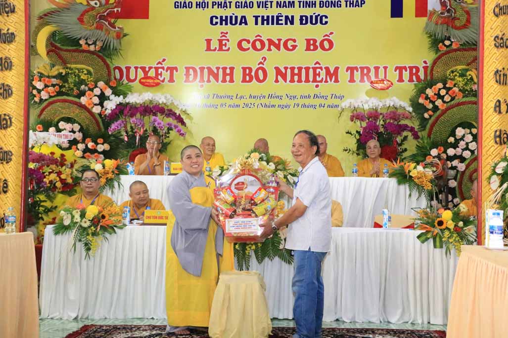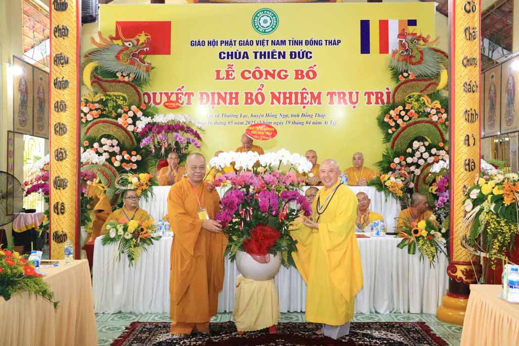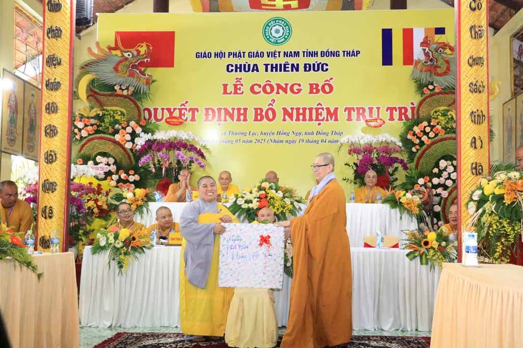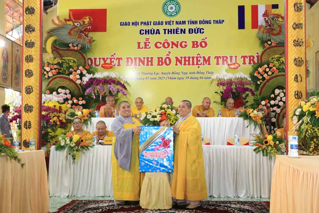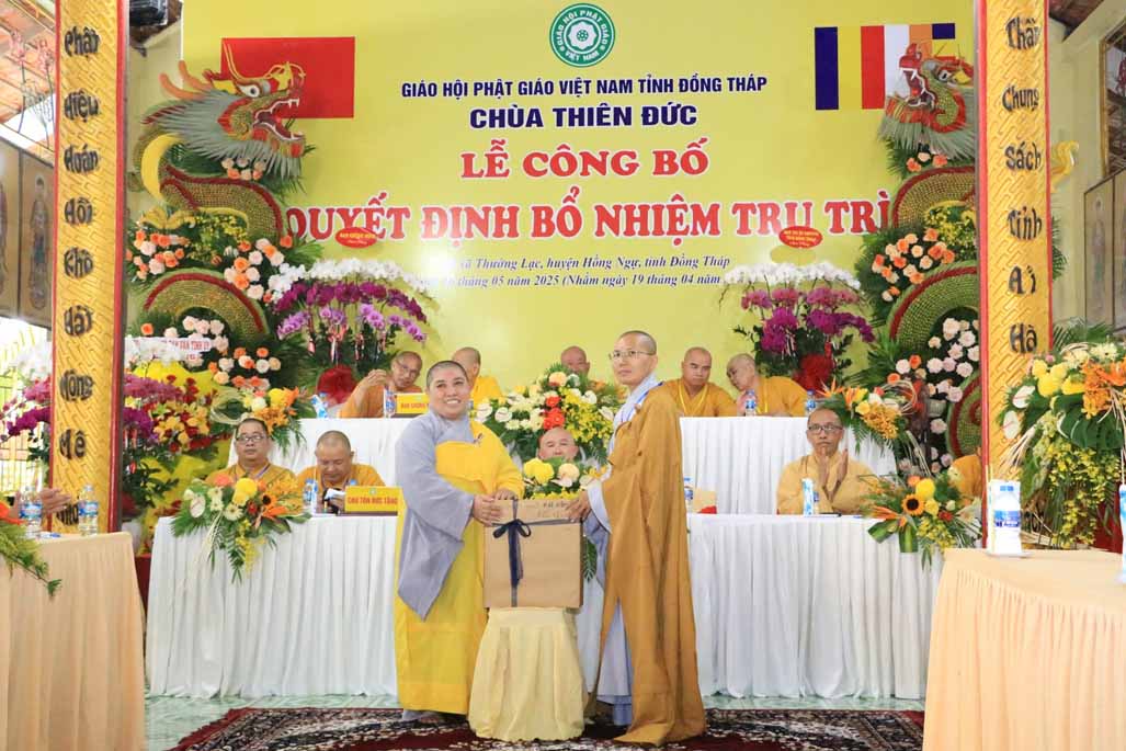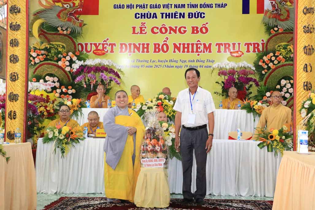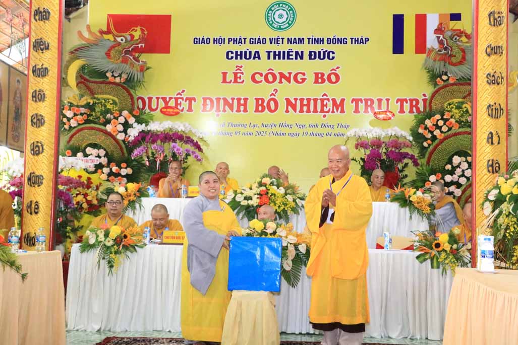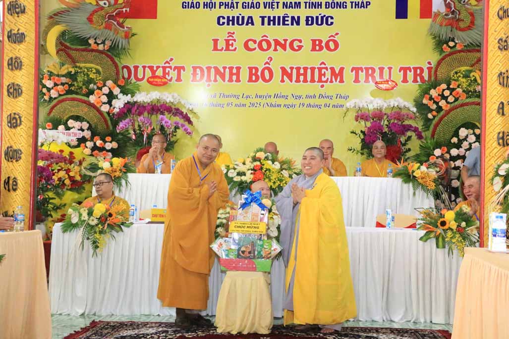 Tại buổi lễ, Thượng tọa Thích Minh Sơn đọc quyến định số 15/QĐ-BTS, ngày 04 tháng 04 năm 2025 của ban Trị sự GHPGVN tỉnh Đồng Tháp bổ nhiệm trụ trì chùa Thiên Đức xã Thường Lạc, huyện Hồng Ngự do Ni sư Thích nữ Như Thuận (thế danh Nguyễn Thị Thu Huyền, SN. 1976), Ủy viên BTS GHPGVN tỉnh, Phó ban BTS GHPGVN huyện Tam Nông, tốt nghiệp cử nhân Phật học tại Tp. Hồ Chí Minh; đảm nhiệm chức vụ trụ trì.