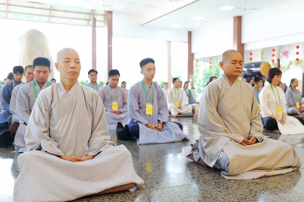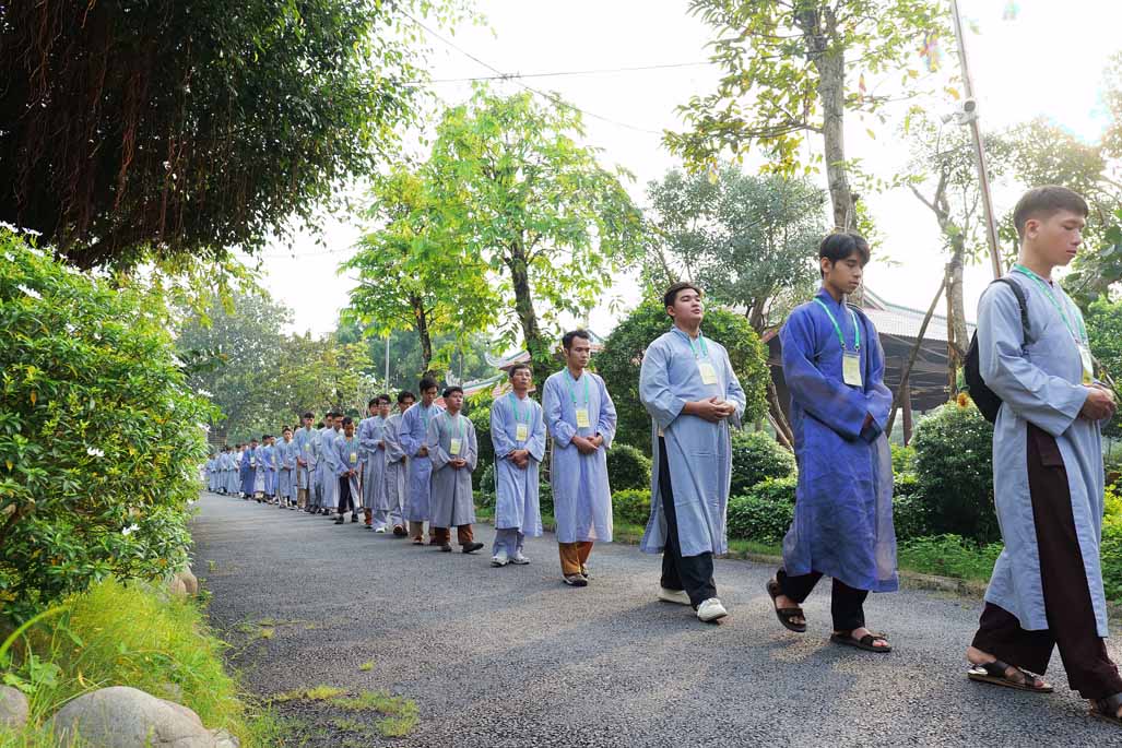 Xen kẽ giữa các thời thiền, đại chúng cùng tụng kinh, dùng cơm chánh niệm và sinh hoạt chia sẻ. Không gian rộng rãi, nhiều cây xanh, tượng Phật uy nghiêm của Tu viện Long Hưng đã trở thành môi trường lý tưởng để các Phật tử trẻ – đặc biệt là hơn 70 nam hành giả – tạm gác lại nhịp sống vội vã, trở về học cách làm chủ thân tâm.
