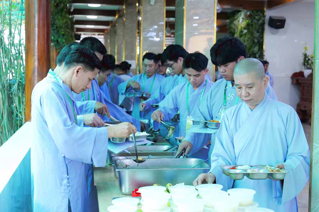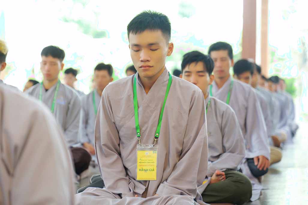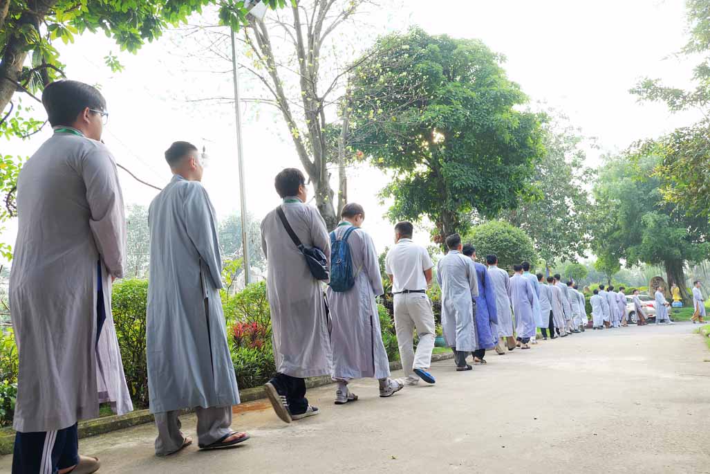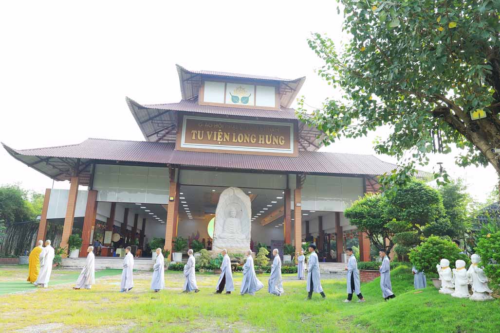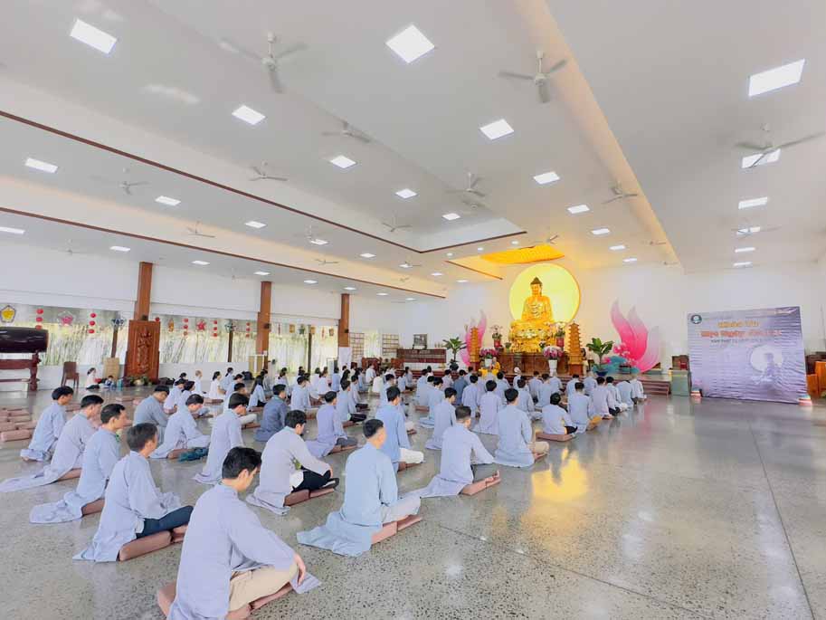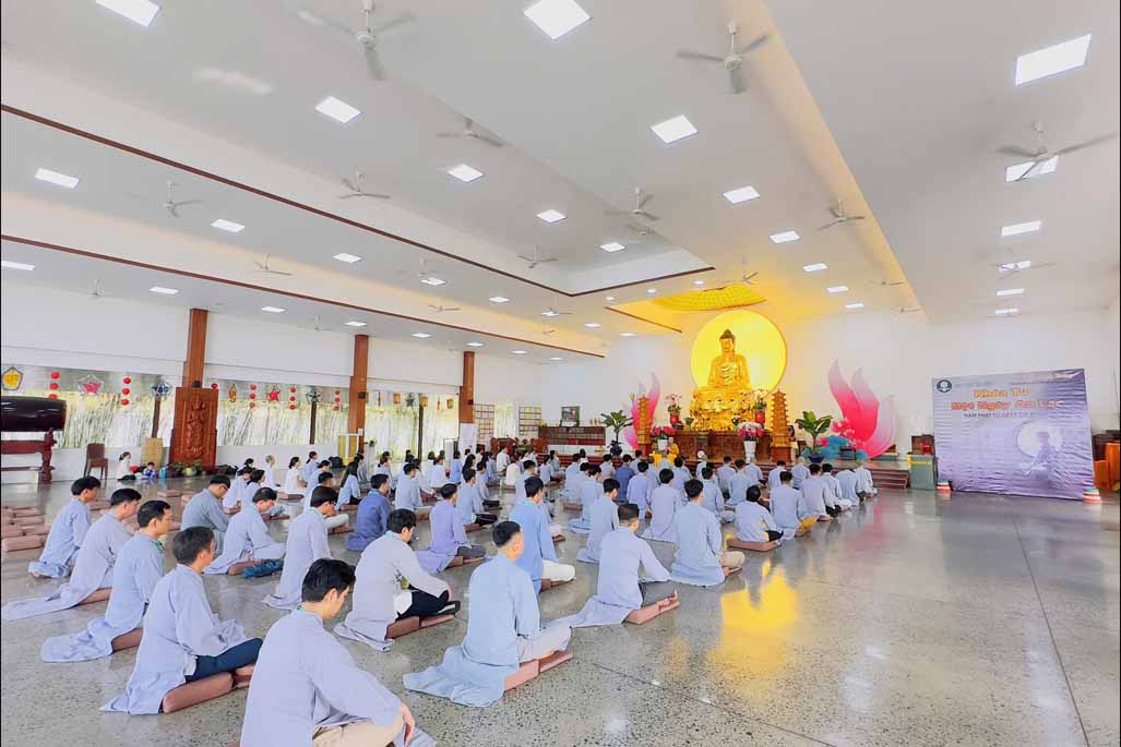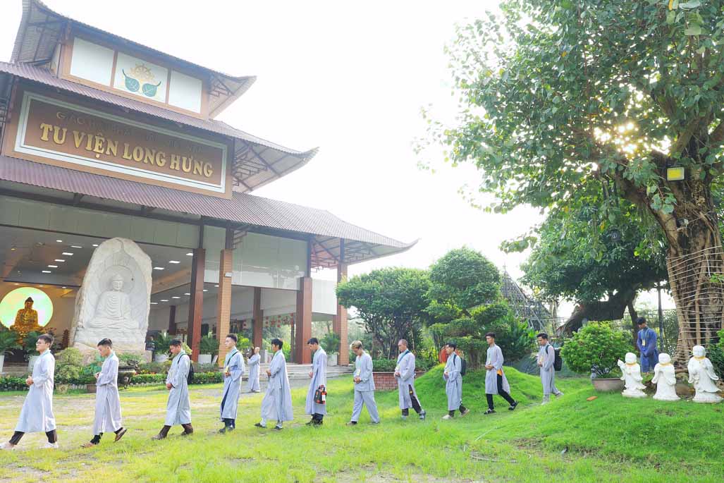 Xen kẽ giữa các thời thiền, đại chúng cùng tụng kinh, dùng cơm chánh niệm và sinh hoạt chia sẻ. Không gian rộng rãi, nhiều cây xanh, tượng Phật uy nghiêm của Tu viện Long Hưng đã trở thành môi trường lý tưởng để các Phật tử trẻ – đặc biệt là hơn 70 nam hành giả – tạm gác lại nhịp sống vội vã, trở về học cách làm chủ thân tâm.