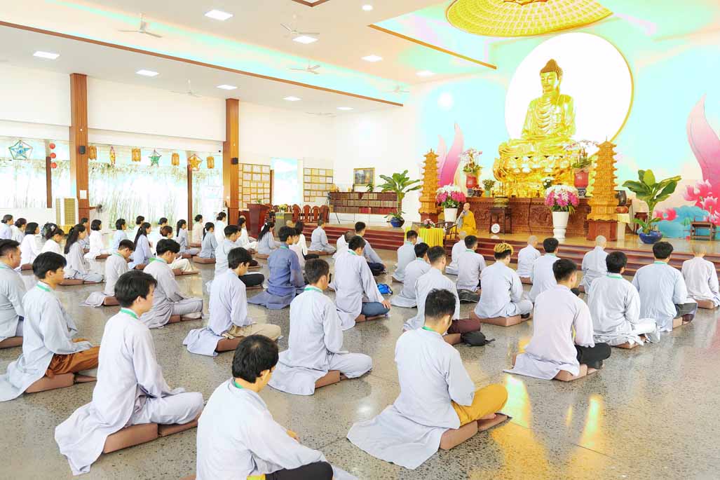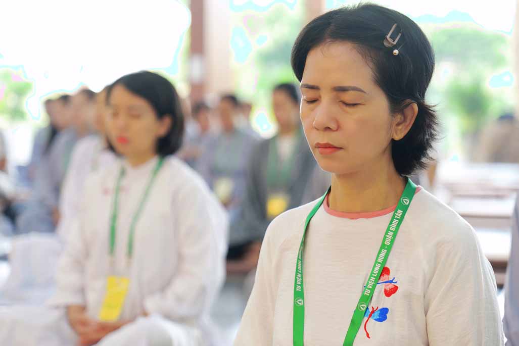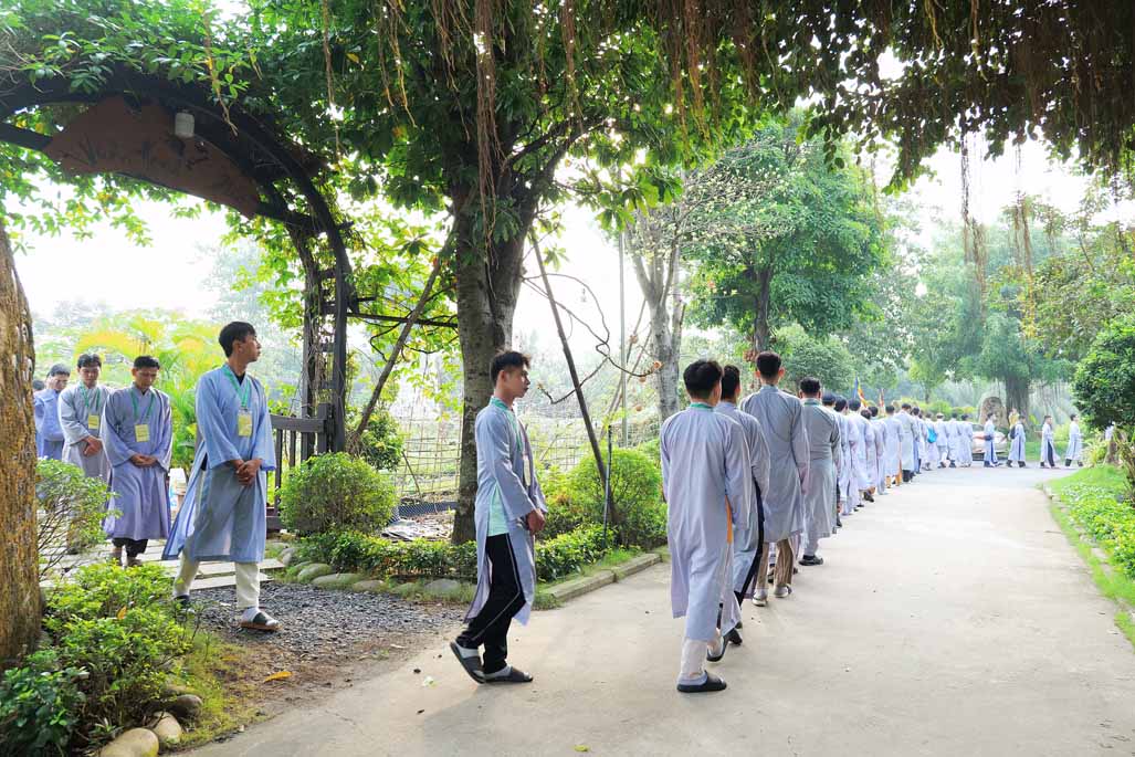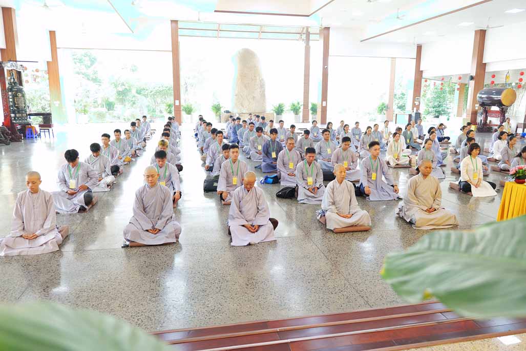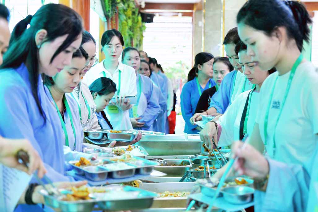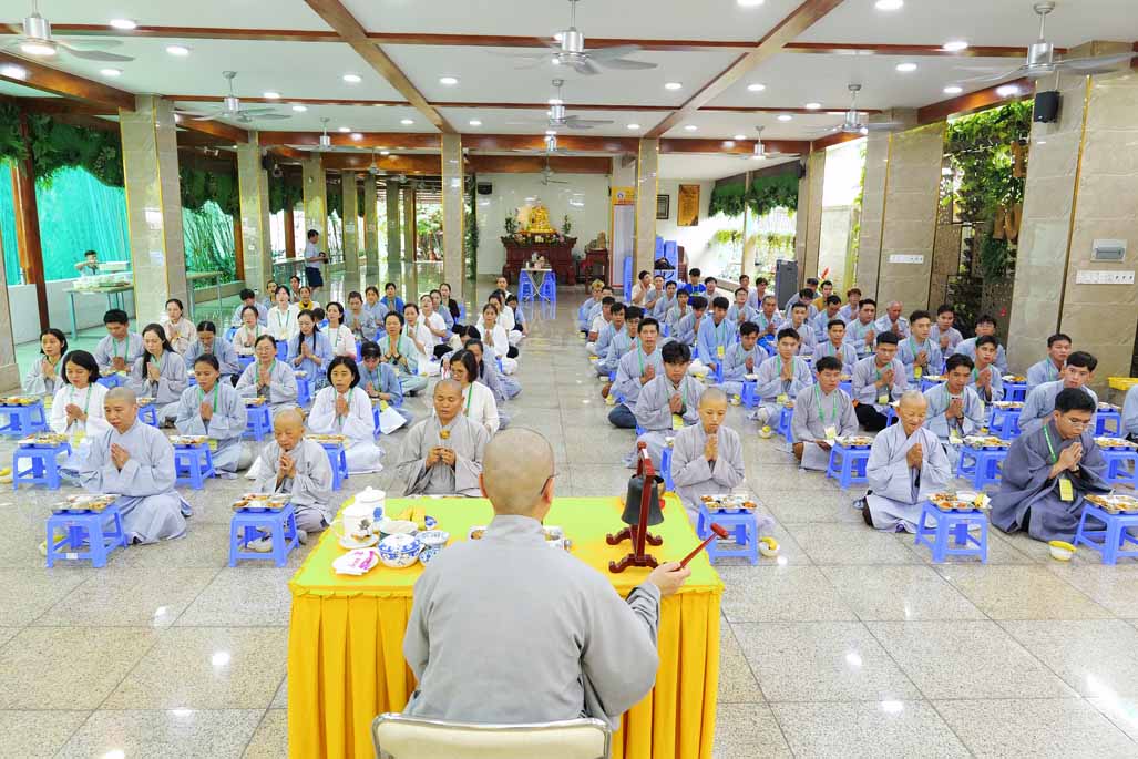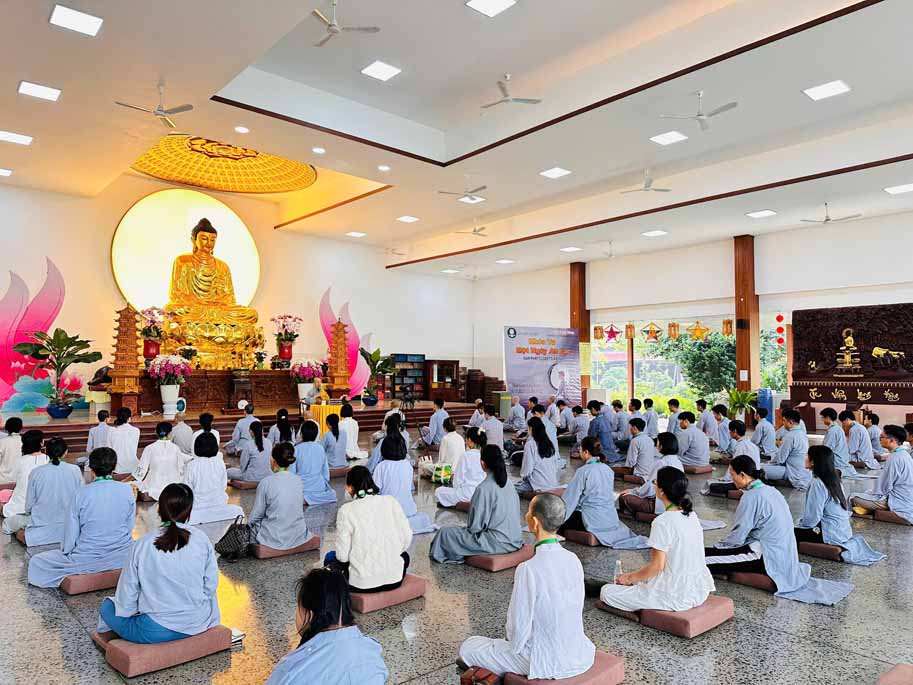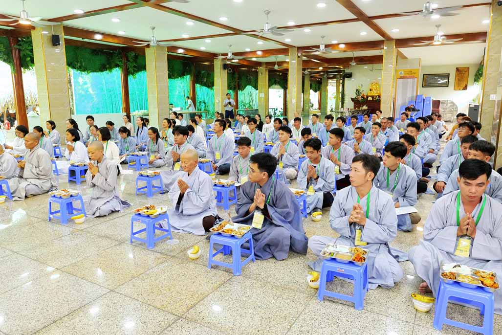 Xen kẽ giữa các thời thiền, đại chúng cùng tụng kinh, dùng cơm chánh niệm và sinh hoạt chia sẻ. Không gian rộng rãi, nhiều cây xanh, tượng Phật uy nghiêm của Tu viện Long Hưng đã trở thành môi trường lý tưởng để các Phật tử trẻ – đặc biệt là hơn 70 nam hành giả – tạm gác lại nhịp sống vội vã, trở về học cách làm chủ thân tâm.