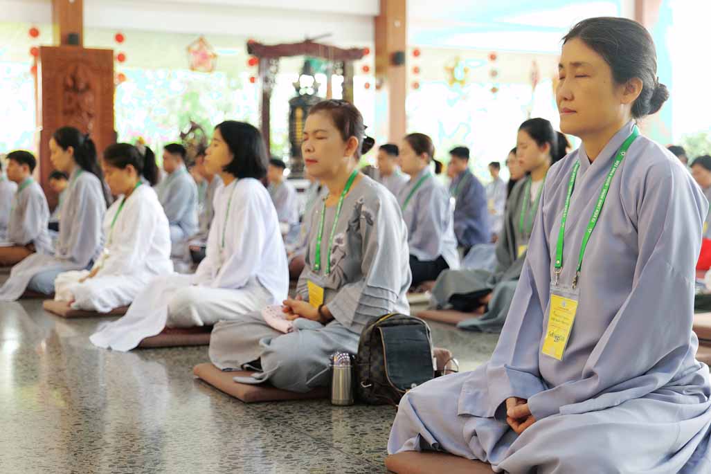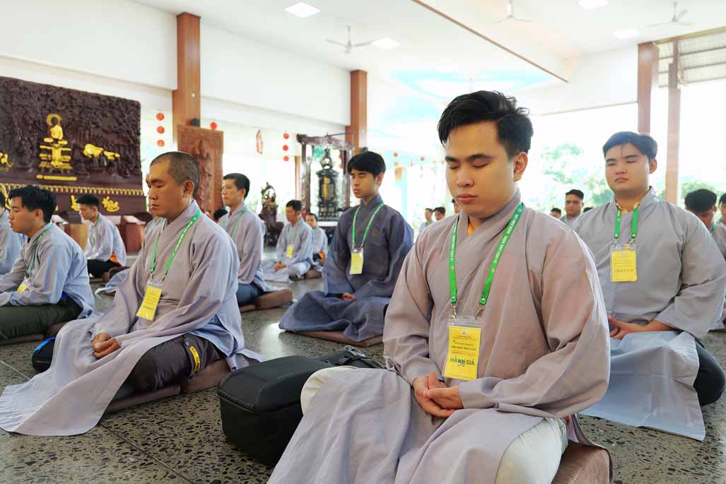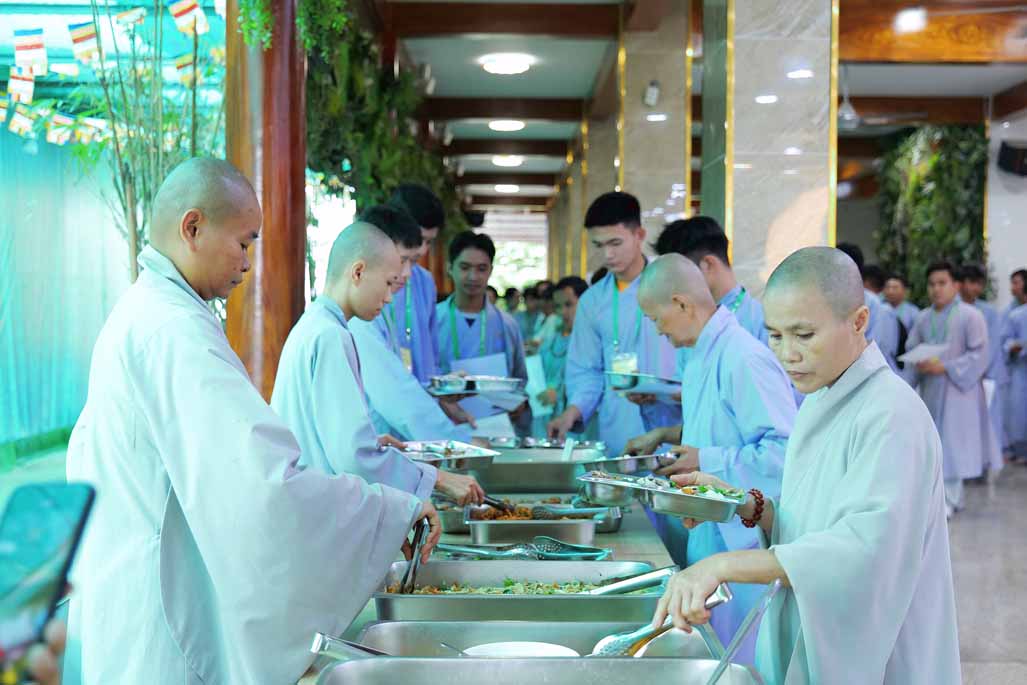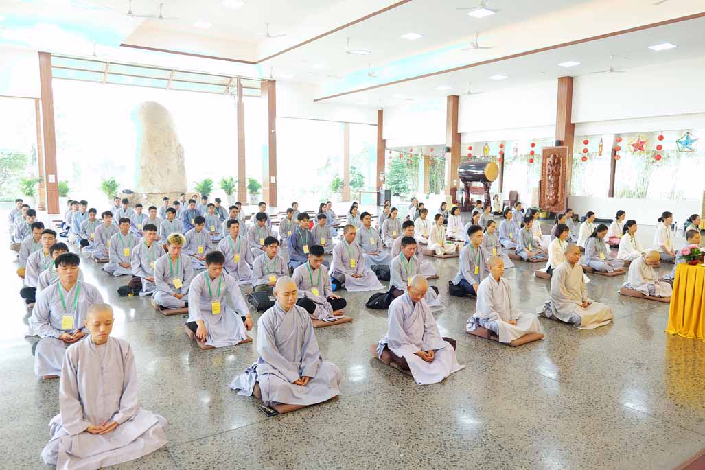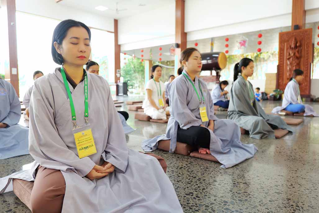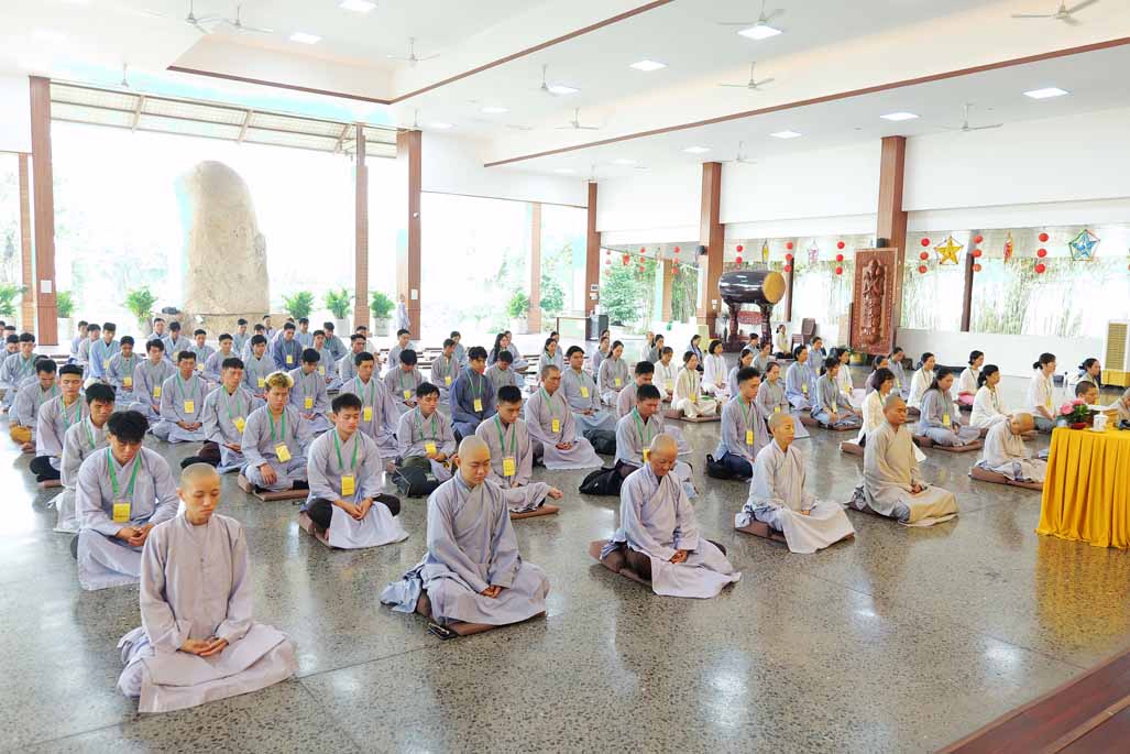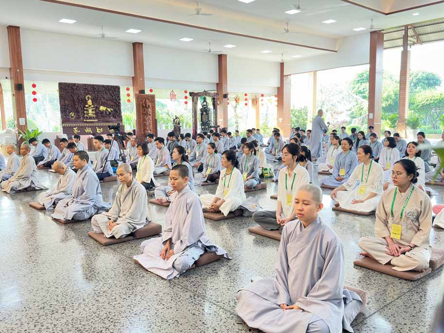 Xen kẽ giữa các thời thiền, đại chúng cùng tụng kinh, dùng cơm chánh niệm và sinh hoạt chia sẻ. Không gian rộng rãi, nhiều cây xanh, tượng Phật uy nghiêm của Tu viện Long Hưng đã trở thành môi trường lý tưởng để các Phật tử trẻ – đặc biệt là hơn 70 nam hành giả – tạm gác lại nhịp sống vội vã, trở về học cách làm chủ thân tâm.