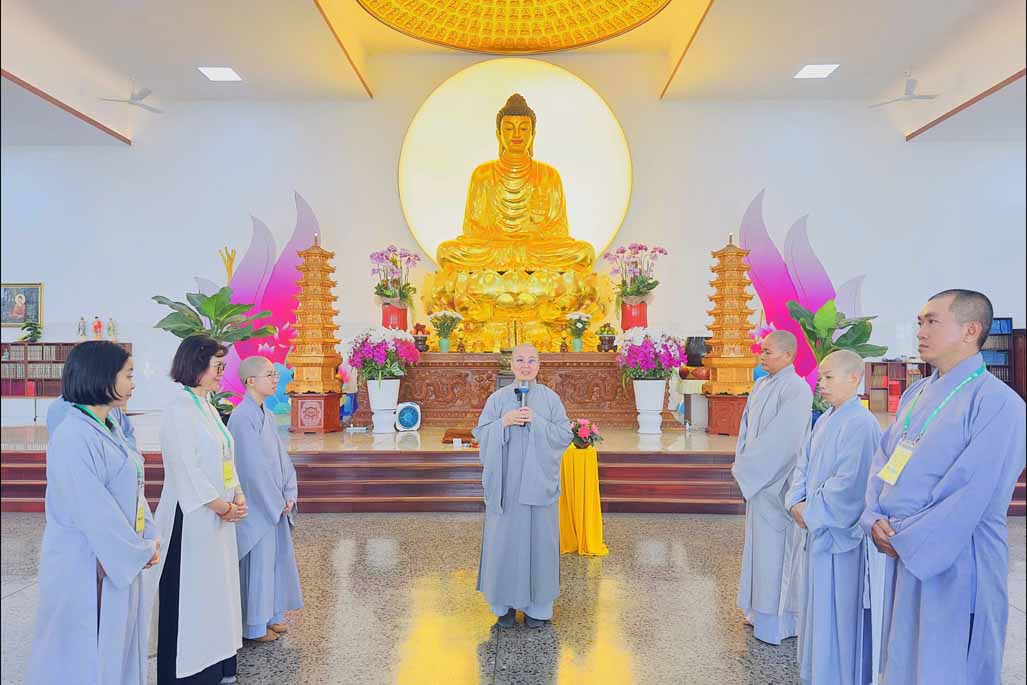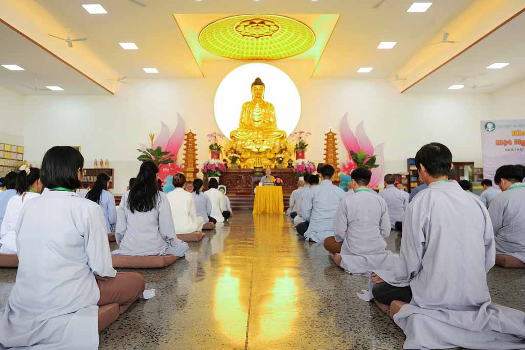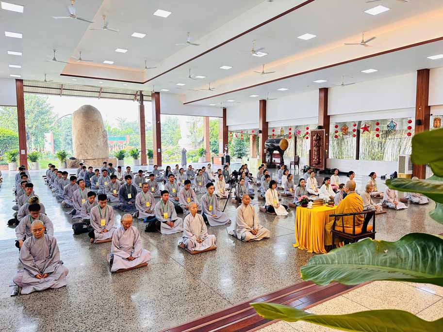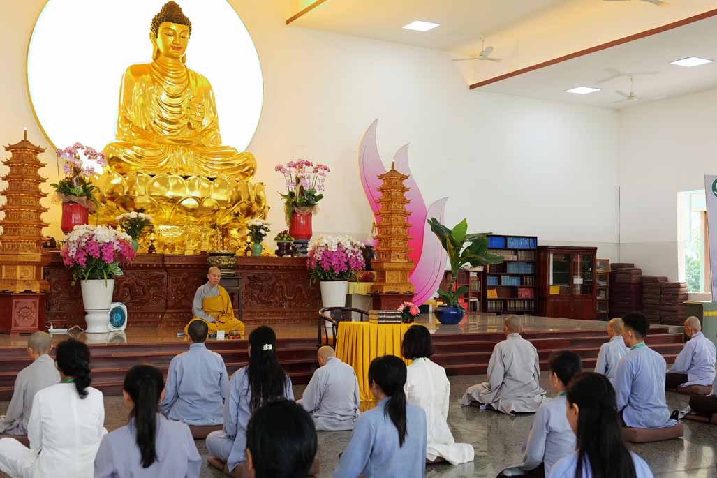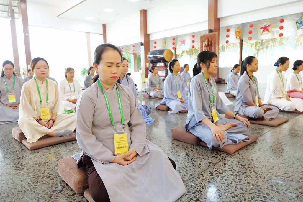 Sau thời thiền hành, đại chúng trở lại chánh điện trang nghiêm, an tọa lắng nghe Ni sư Diệu Hiếu chia sẻ pháp thoại và hướng dẫn thực tập thiền tọa. Ni sư nhắc lại khát vọng chung của mọi người là cầu tìm an lạc và hạnh phúc, nhưng phần lớn lại sống trong căng thẳng, lo âu. Căn nguyên là vì “chúng ta hướng ra bên ngoài quá nhiều, ít khi chịu quay về bên trong”. Bằng phương pháp thiền chánh niệm, hành giả được mời gọi trở về soi sáng lại thân – khẩu – ý nghiệp, nhận diện những gì đang diễn ra nơi thân tâm trong giây phút hiện tại.