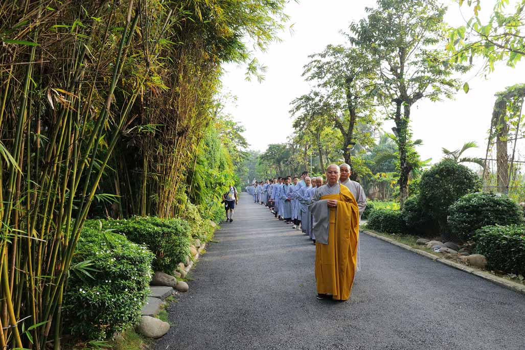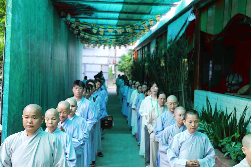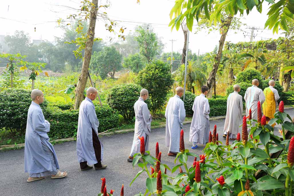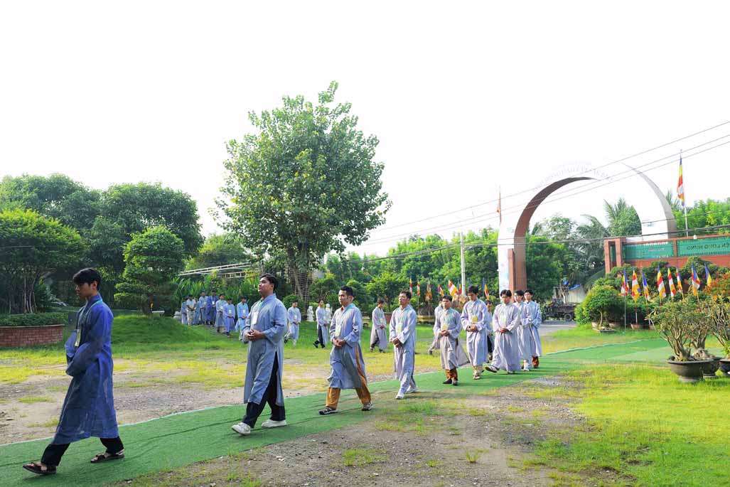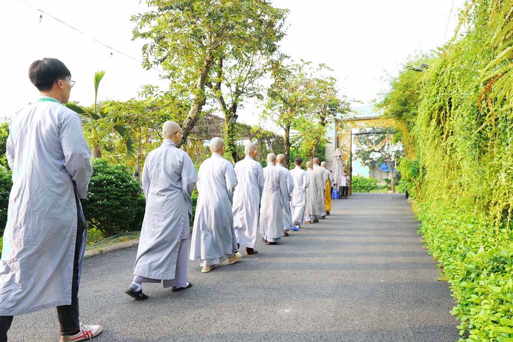 Ngay từ sáng sớm, đại chúng vân tập đông đủ tại chánh điện trước tôn tượng Đức Phật Bổn Sư. Sau thời ổn định đạo tràng, Ni sư Thích Nữ Diệu Hiếu – Trụ trì Tu viện Long Hưng – trực tiếp hướng dẫn thời thiền hành khai khóa. Trong không gian thanh tịnh của tu viện, hàng dài hành giả nhẹ nhàng bước đi từng bước chánh niệm quanh khuôn viên, mở đầu ngày tu bằng những bước chân an lạc, gom tâm về với hiện tại.