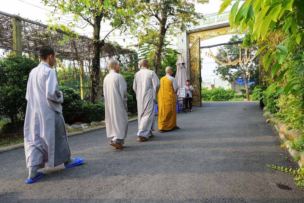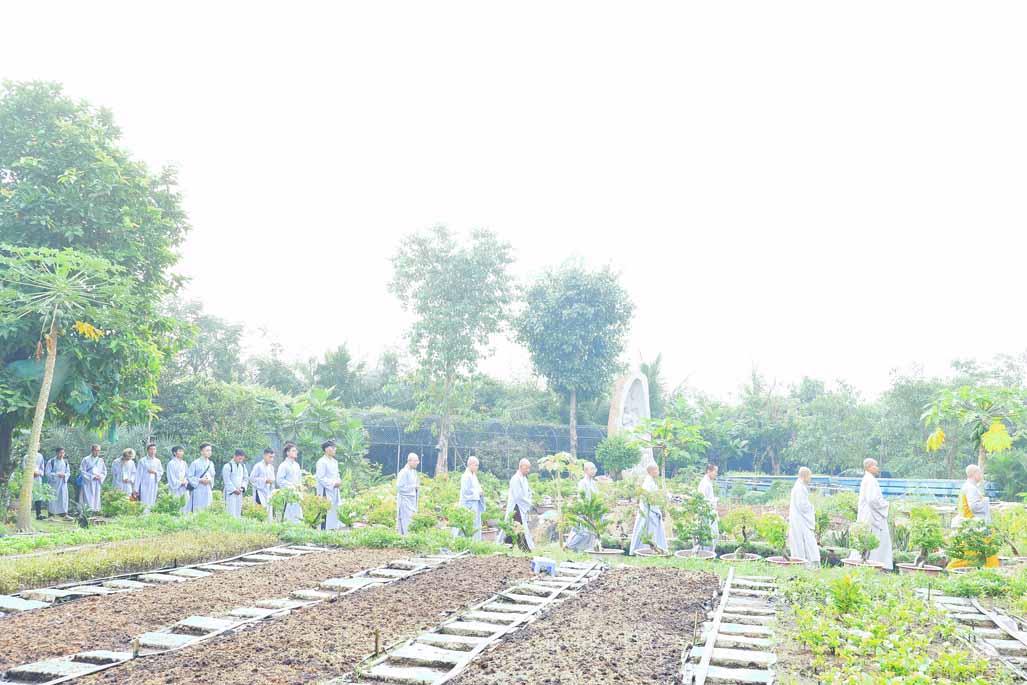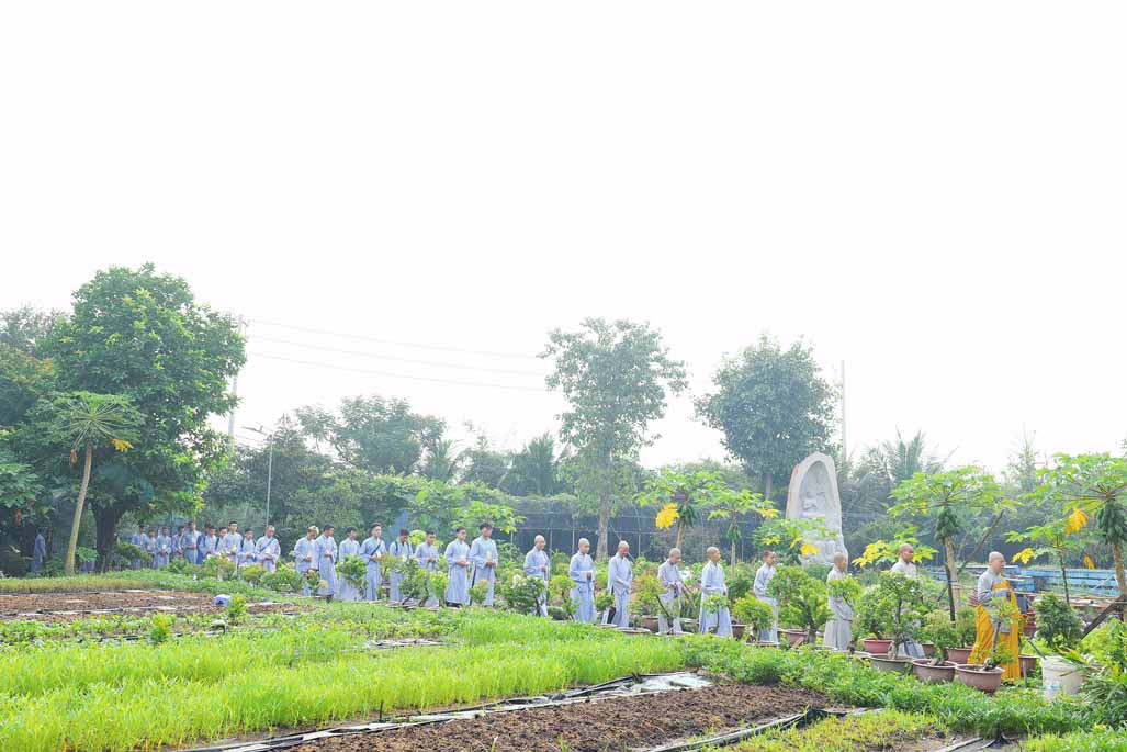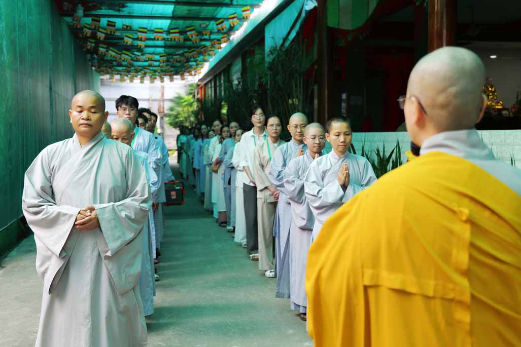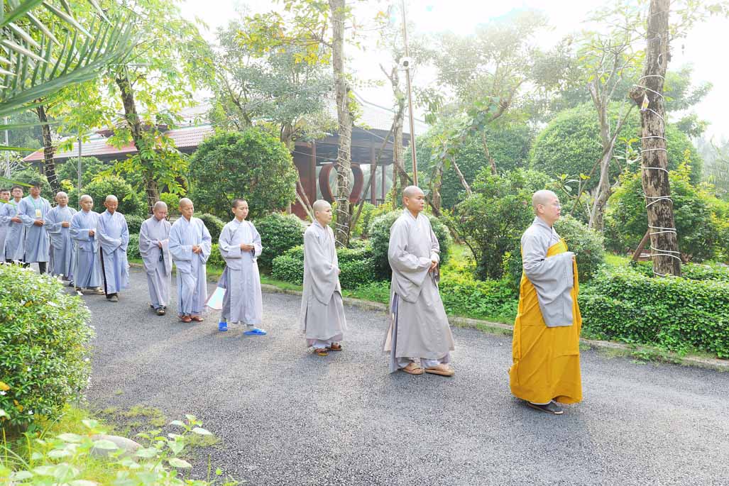 Ngay từ sáng sớm, đại chúng vân tập đông đủ tại chánh điện trước tôn tượng Đức Phật Bổn Sư. Sau thời ổn định đạo tràng, Ni sư Thích Nữ Diệu Hiếu – Trụ trì Tu viện Long Hưng – trực tiếp hướng dẫn thời thiền hành khai khóa. Trong không gian thanh tịnh của tu viện, hàng dài hành giả nhẹ nhàng bước đi từng bước chánh niệm quanh khuôn viên, mở đầu ngày tu bằng những bước chân an lạc, gom tâm về với hiện tại.