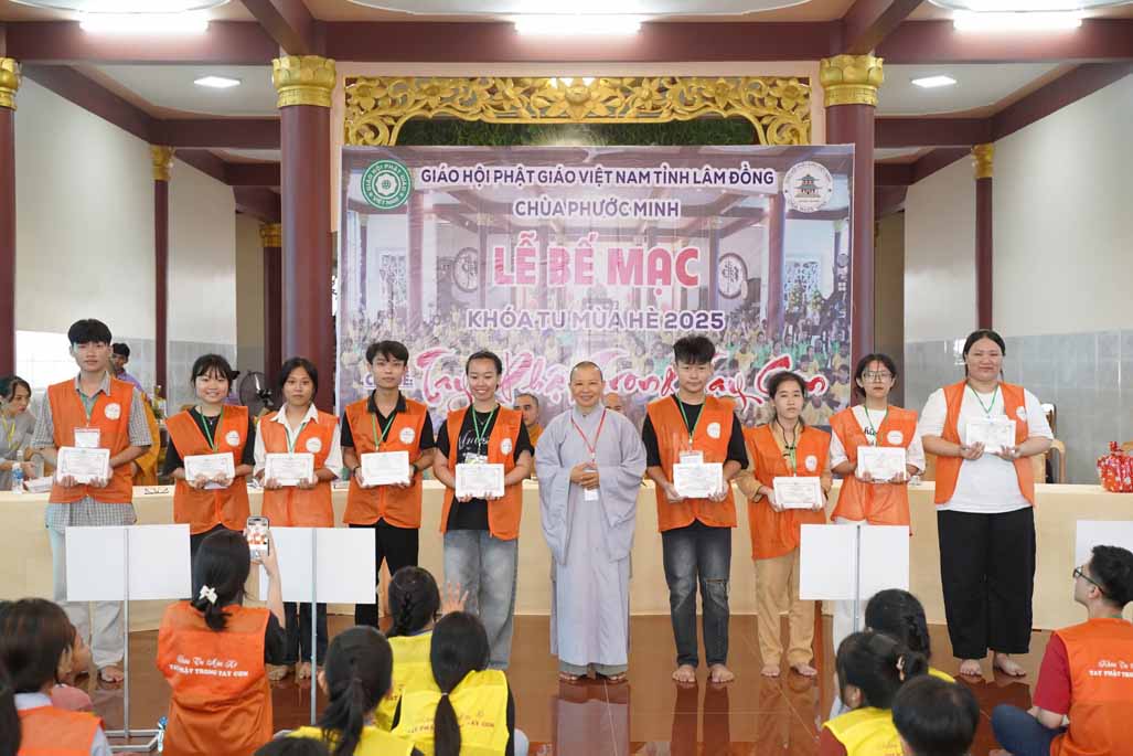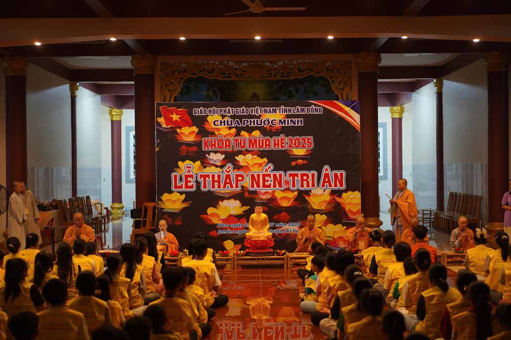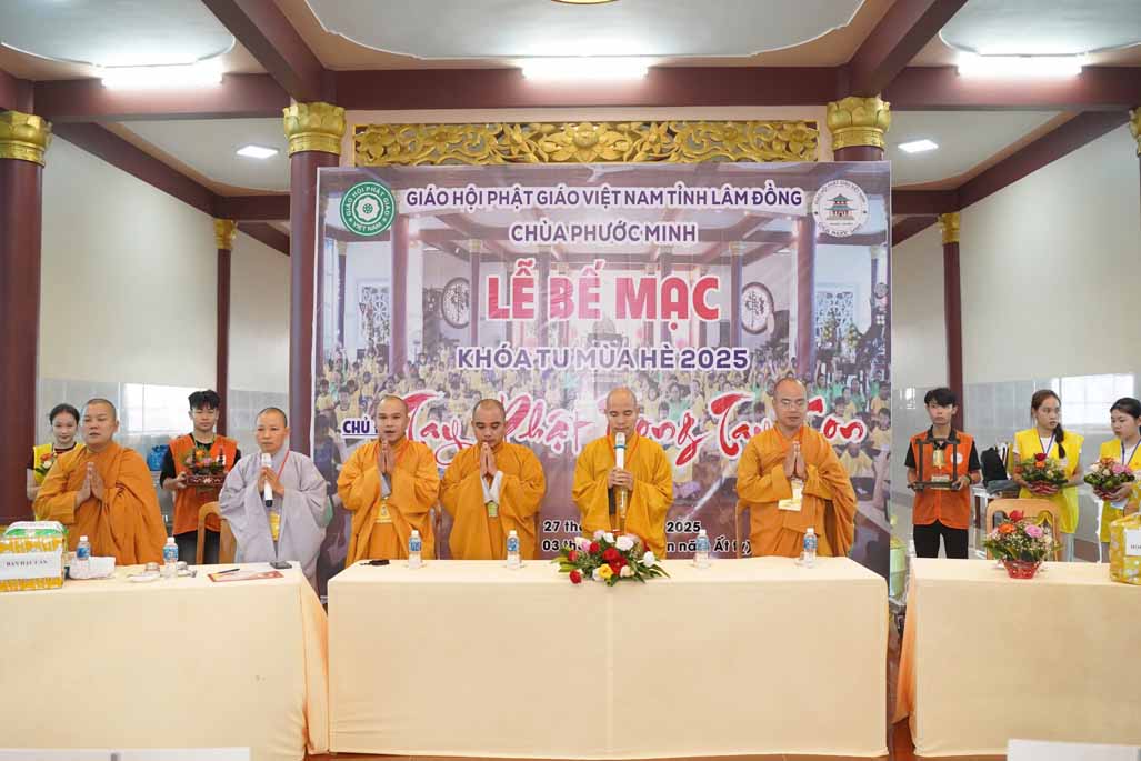 Chứng minh cho khóa lễ khai mạc có TT. Thích Pháp Huệ – UVTT Ban Hoằng pháp TW GHPGVN, Phó ban BTS kiêm Trưởng Ban Hoằng pháp GHPGVN tỉnh Lâm Đồng; TT. Thích Nguyên Chơn – Trưởng Ban Nghi lễ GHPGVN tỉnh Lâm Đồng; ĐĐ. Thích Nguyên Phương – Phó Ban Hoằng pháp GHPGVN tỉnh Bình Thuận (cũ); ĐĐ. Thích Giác Hạnh – Phó ban kiêm Chánh Thư ký Ban Hoằng pháp GHPGVN tỉnh Bình Thuận (cũ); SC. Thích nữ Nguyên Minh – UVTT Ban Hoằng pháp GHPGVN tỉnh Bình Thuận (cũ), trụ trì chùa Phước Minh, Trưởng BTC khóa tu; chư Tôn đức Tăng Ni trong Ban Tổ chức và trú xứ chùa Phước Minh cùng quý phụ huynh và gần 400 tu sinh, phụng sự viên đồng tham dự.