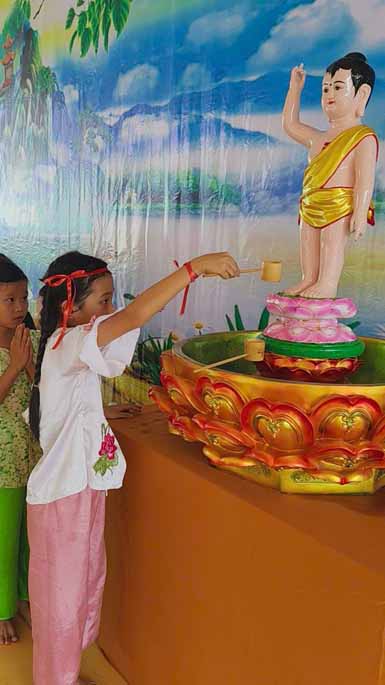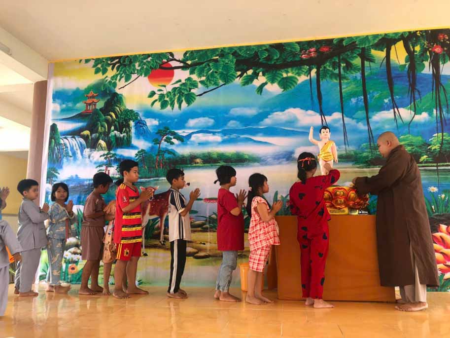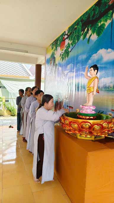 Một điểm nhấn đầy màu sắc nghệ thuật là phần thi thiết kế xe hoa Phật Đản, nơi các nhóm bạn tâm huyết để sáng tạo nên những mô hình xe hoa độc đáo, thể hiện lòng tôn kính và niềm hoan hỷ dâng lên Đức Bổn Sư Thích Ca Mâu Ni. Qua đó, tinh thần làm việc nhóm, thẩm mỹ và sự khéo léo của tuổi trẻ được phát huy trọn vẹn.Đến buổi trưa, toàn thể đại chúng cùng thực tập ăn cơm chánh niệm trong sự tĩnh lặng và tỉnh thức. Thời khóa kinh hành – tắm Phật – quán niệm hơi thở vào cuối ngày giúp thân tâm an tịnh, đưa các bạn trẻ trở về với sự tỉnh thức trong từng bước chân. Hình ảnh Đức Phật sơ sinh hiện lên như một lời nhắc nhở nhẹ nhàng về con đường giác ngộ, từ bi và giải thoát mà mỗi người con Phật cần noi theo.
