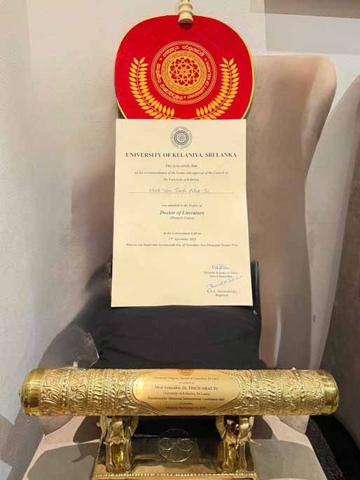 Ngày 17/11/2025, tại Hội trường lớn Đại học Kelaniya, trong khuôn khổ Lễ tốt nghiệp lần thứ 154. Thầy Thích Nhật Từ đã được Hòa thượng Giáo sư Tiến sĩ Kollupitiye Mahinda Sangharakkhita, Hiệu trưởng Đại học Kelaniya kiêm Viện chủ Kelaniya Rajamaha Viharaya, long trọng trao Bằng Tiến sĩ Văn học Danh dự (Honorary Doctor of Literature).