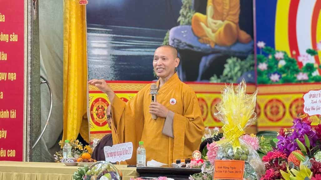 Tại buổi lễ, Thượng tọa Thích Minh Quang đã ban đạo từ, TT nhắc ý nghĩa thiêng liêng của ngày 20/ 11 – ngày hiến dâng lòng biết ơn đến chư vị Thầy Cô giáo. Thượng tọa nhấn mạnh: “Nhân ngày Nhà giáo Việt Nam, chúng ta tưởng niệm và tri ân chư Thầy Cô – những vị đã trao truyền tri kiến và giá trị sống cho thế hệ trẻ. Đồng thời, bên cạnh các bậc Thầy nơi học đường, mỗi người đều có hai vị Thầy gần gũi và quan trọng nhất: Cha và Mẹ, những bậc đã dạy ta cách sống, cách làm người, dìu dắt ta trên con đường đạo đức và nghĩa tình.”