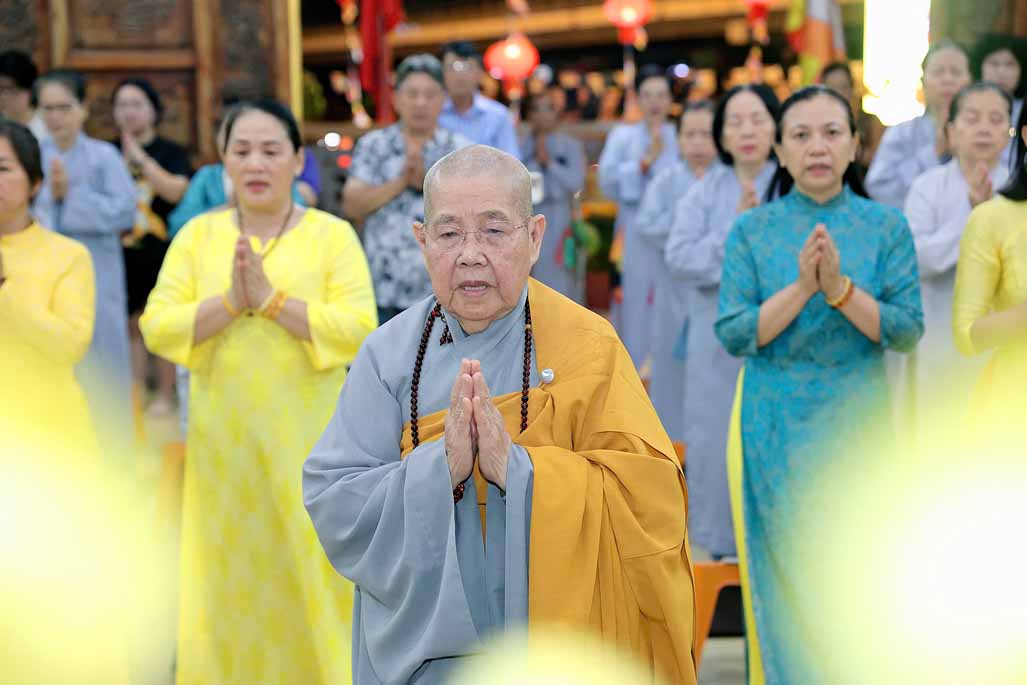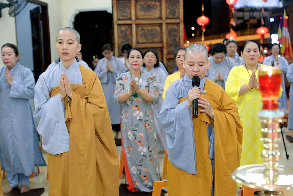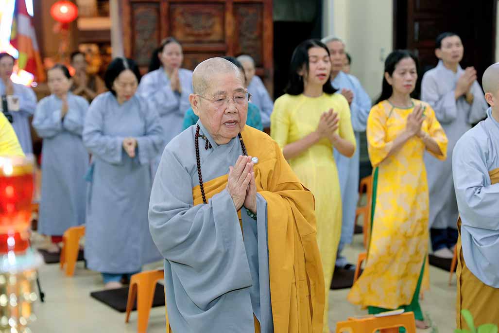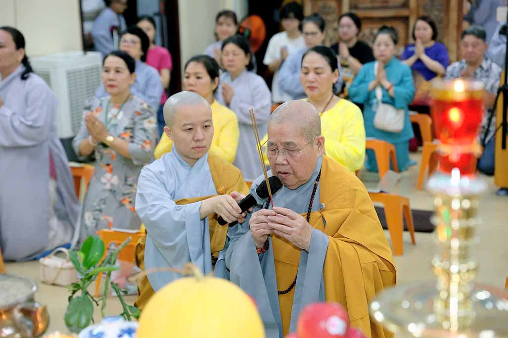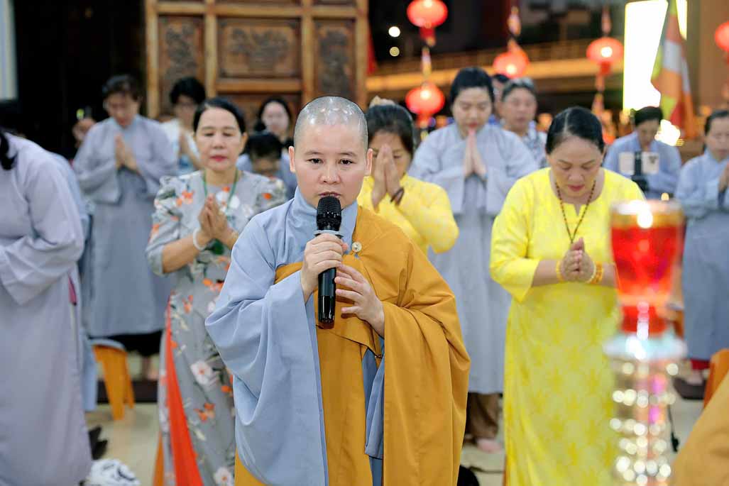 Trong ánh đèn lung linh và hương trầm quyện tỏa, Ni trưởng thành kính niêm hương bạch Phật – Đảnh lễ Tam Bảo, dâng lời nguyện cầu đạo pháp xương minh, quốc thái dân an, nhân dân an lạc.