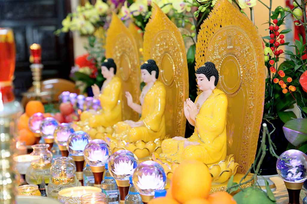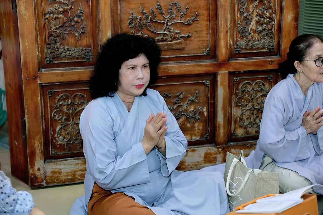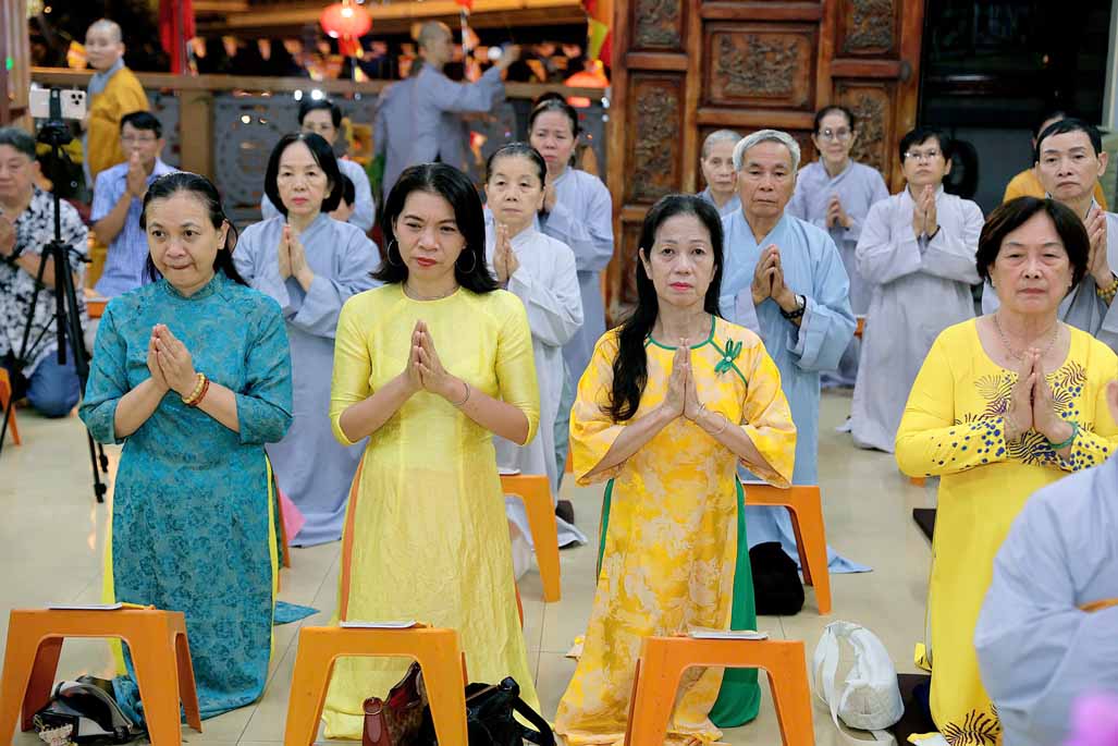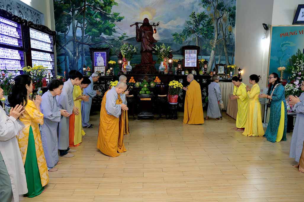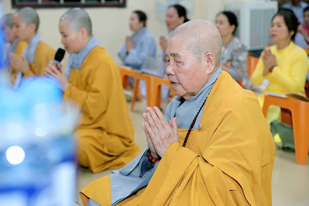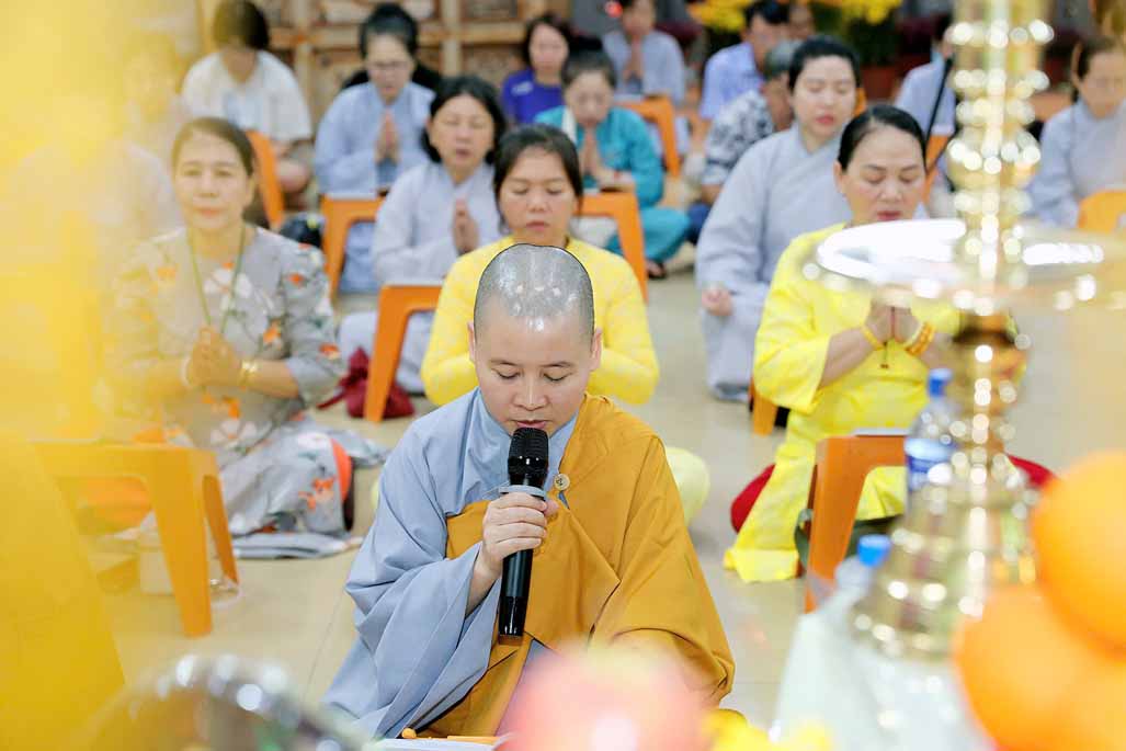 Trong ánh đèn lung linh và hương trầm quyện tỏa, Ni trưởng thành kính niêm hương bạch Phật – Đảnh lễ Tam Bảo, dâng lời nguyện cầu đạo pháp xương minh, quốc thái dân an, nhân dân an lạc.