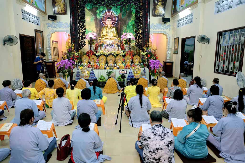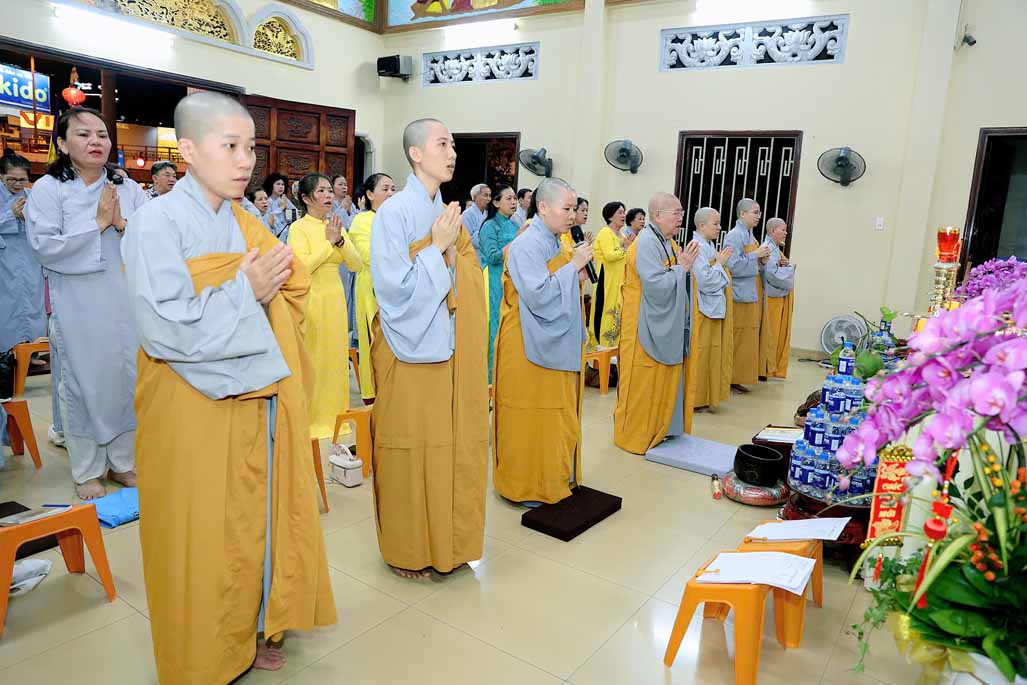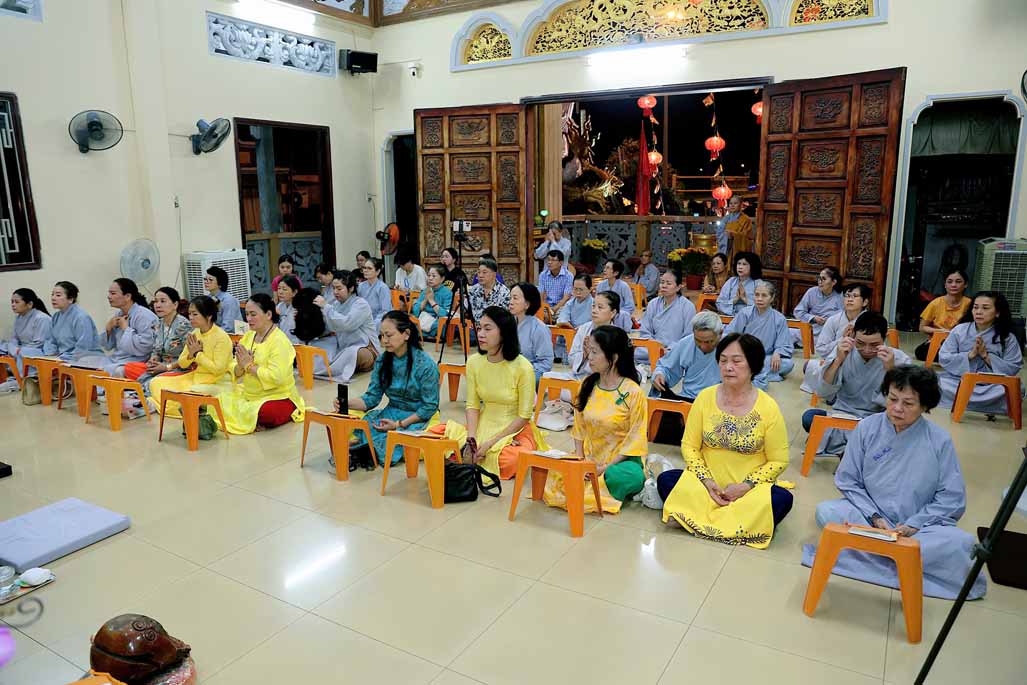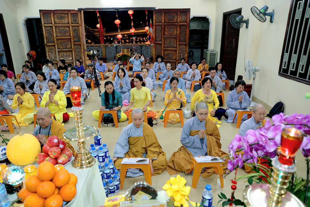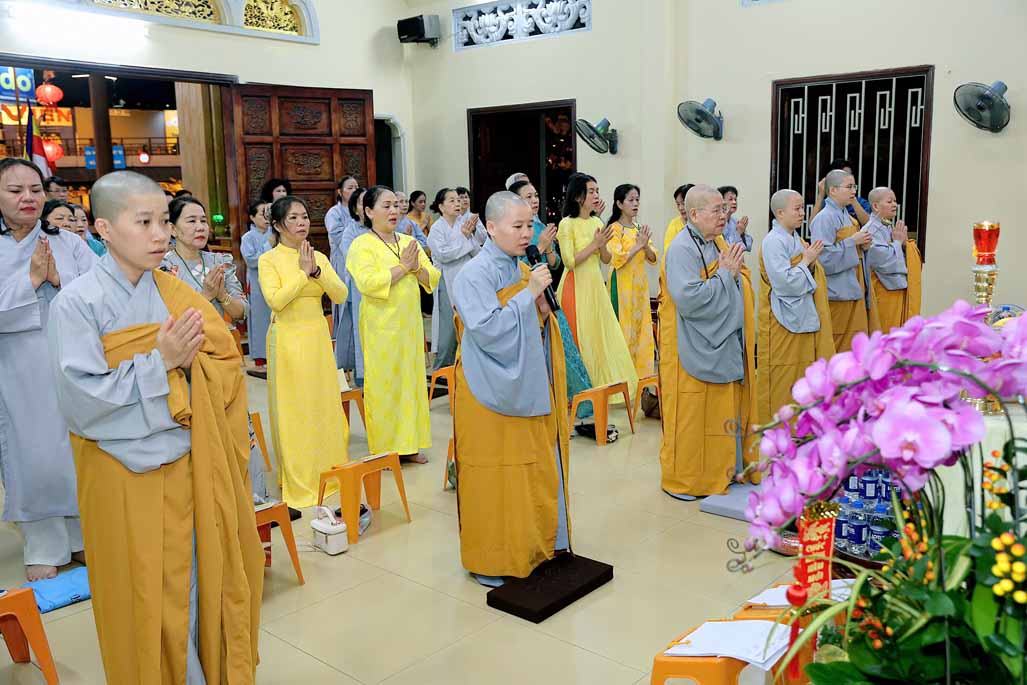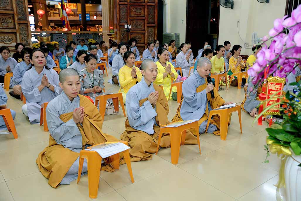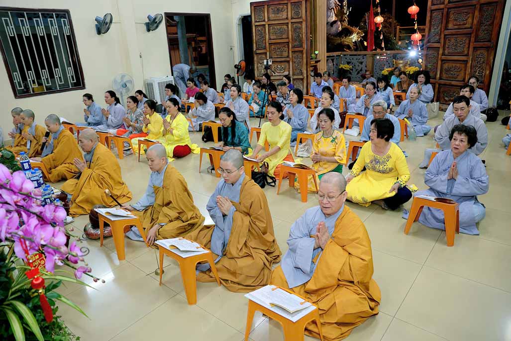 Toàn thể đạo tràng đồng tụng thời kinh Dược Sư. Âm điệu trầm hùng, thanh tịnh vang vọng nơi chánh điện, tạo nên nguồn năng lượng bình an, giúp đại chúng gột rửa ưu phiền năm cũ và khơi dậy niềm tin, hy vọng cho năm mới.