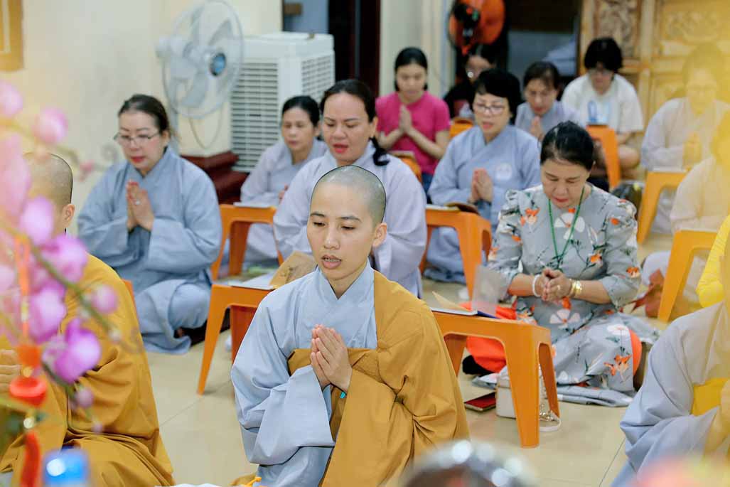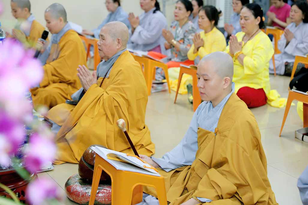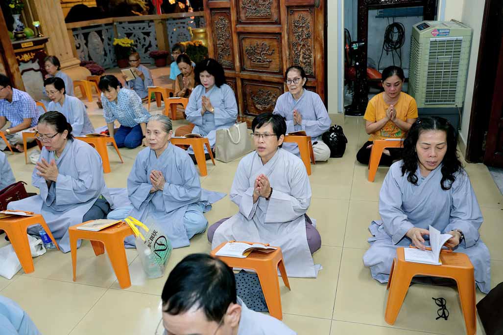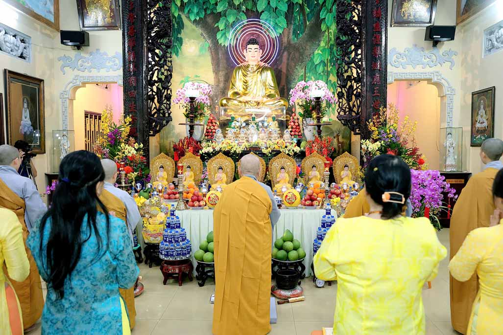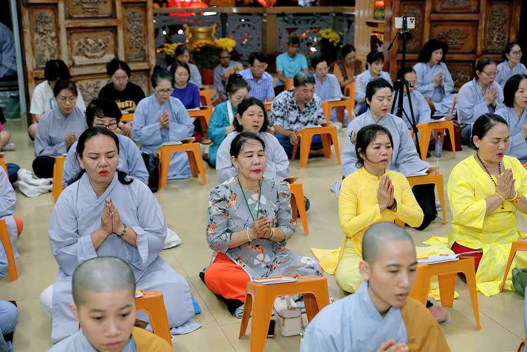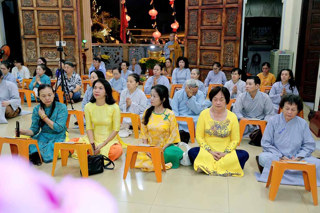 Toàn thể đạo tràng đồng tụng thời kinh Dược Sư. Âm điệu trầm hùng, thanh tịnh vang vọng nơi chánh điện, tạo nên nguồn năng lượng bình an, giúp đại chúng gột rửa ưu phiền năm cũ và khơi dậy niềm tin, hy vọng cho năm mới.