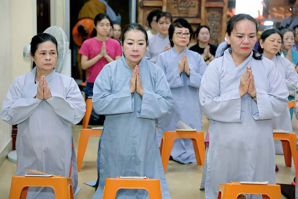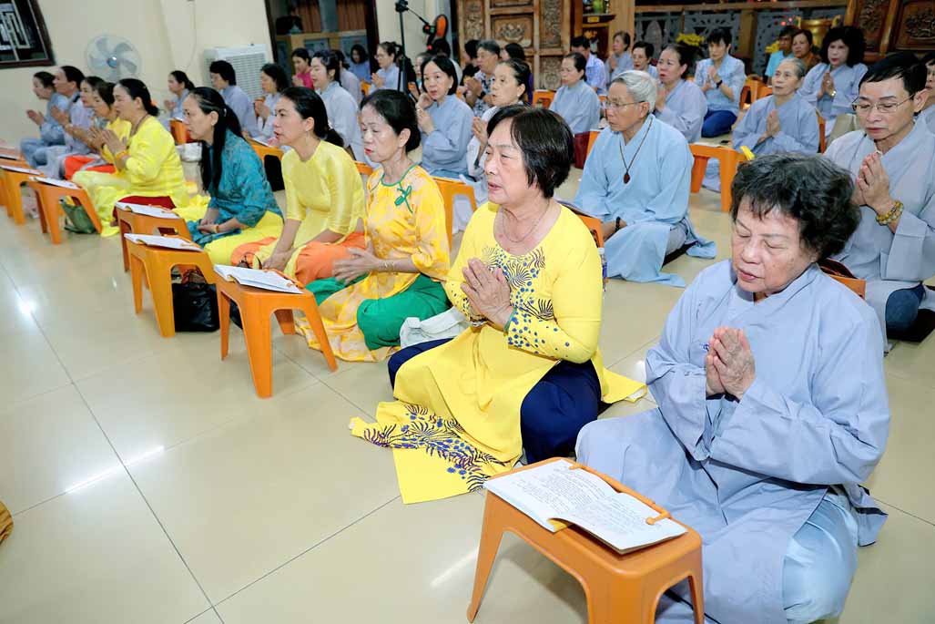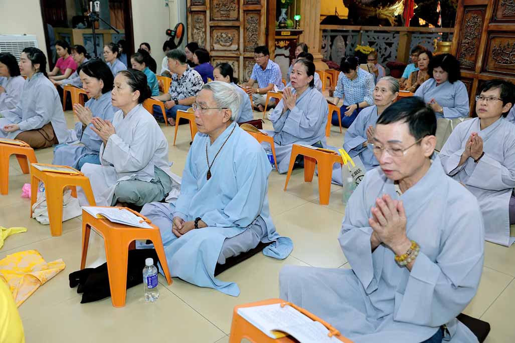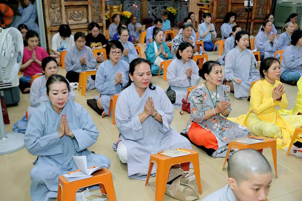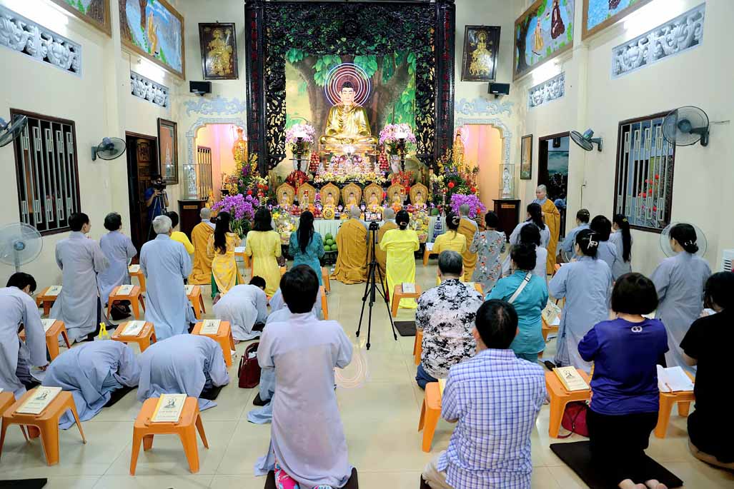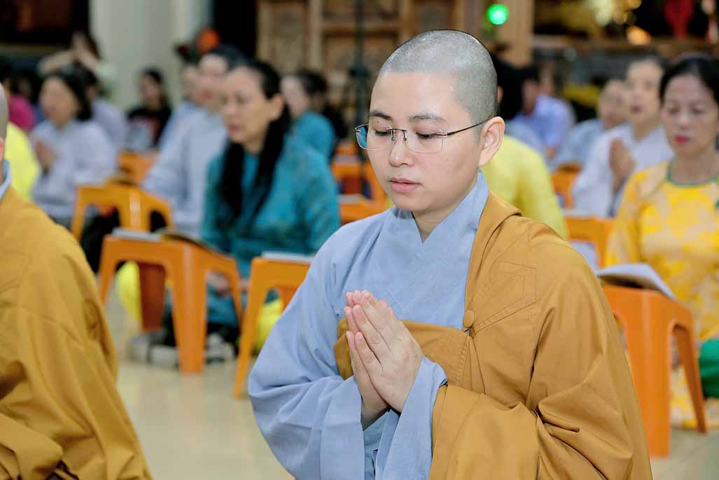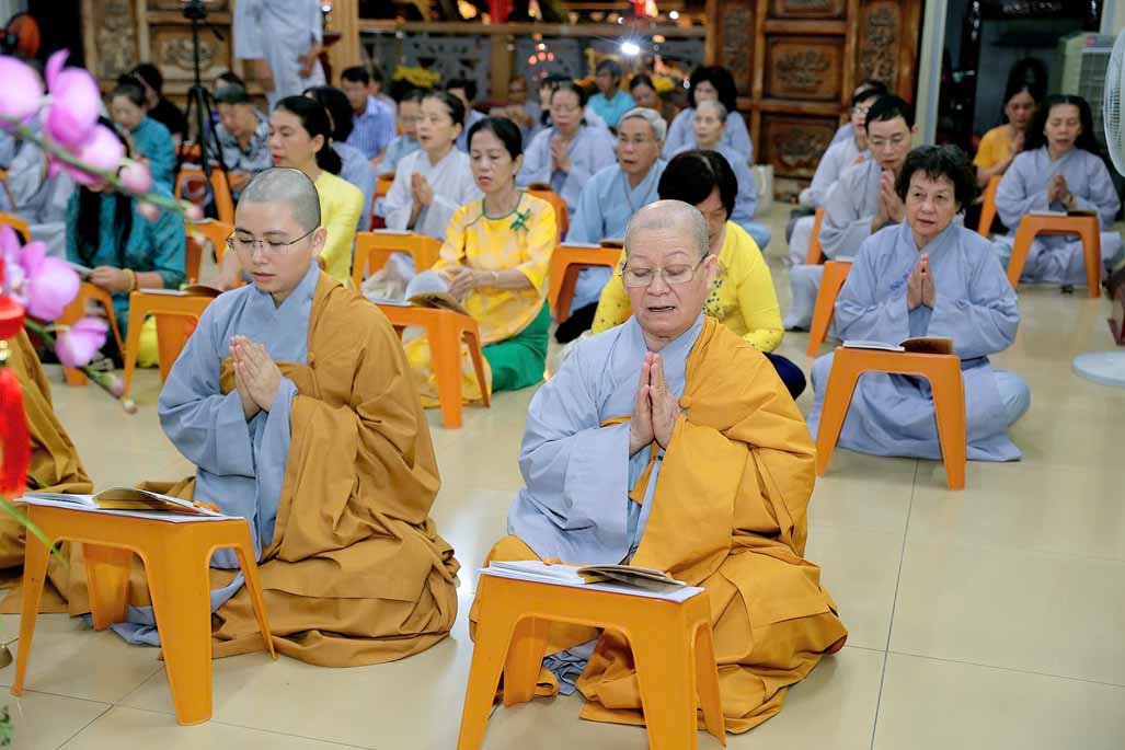 Toàn thể đạo tràng đồng tụng thời kinh Dược Sư. Âm điệu trầm hùng, thanh tịnh vang vọng nơi chánh điện, tạo nên nguồn năng lượng bình an, giúp đại chúng gột rửa ưu phiền năm cũ và khơi dậy niềm tin, hy vọng cho năm mới.
