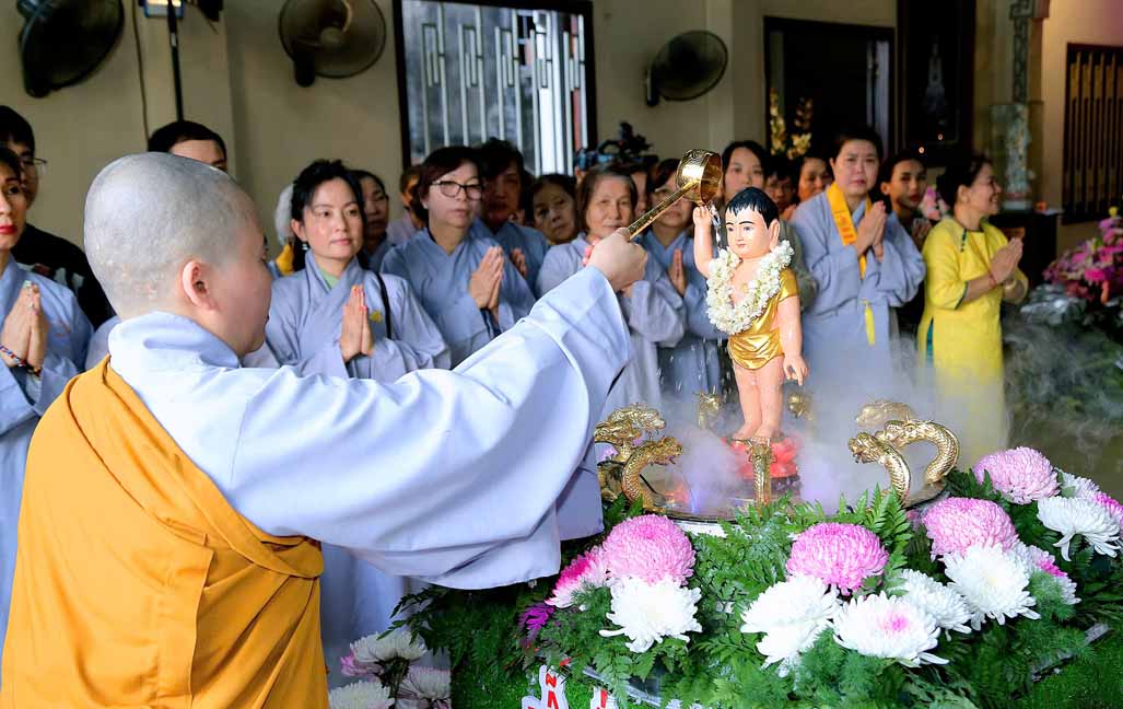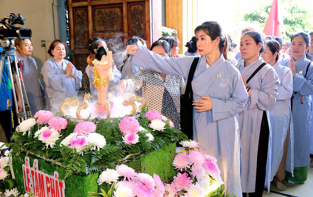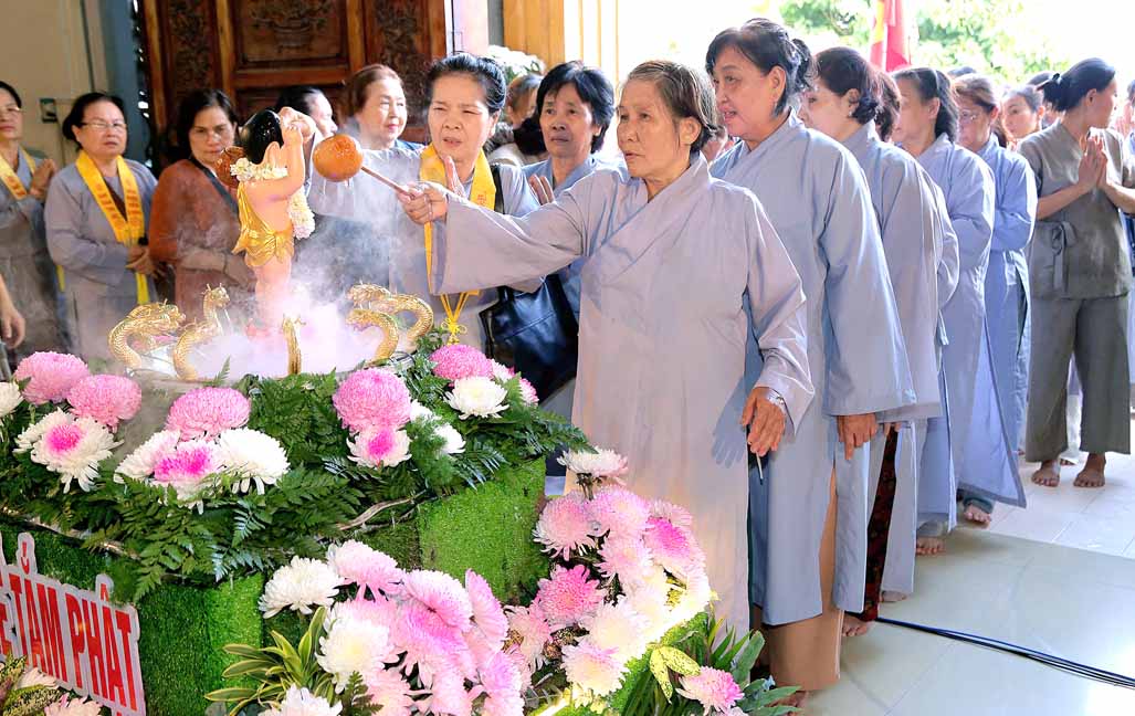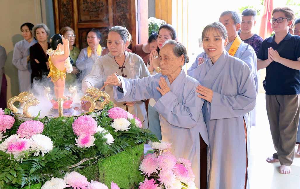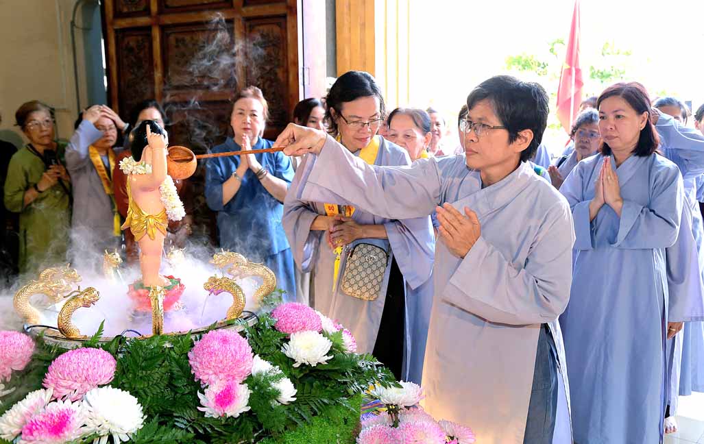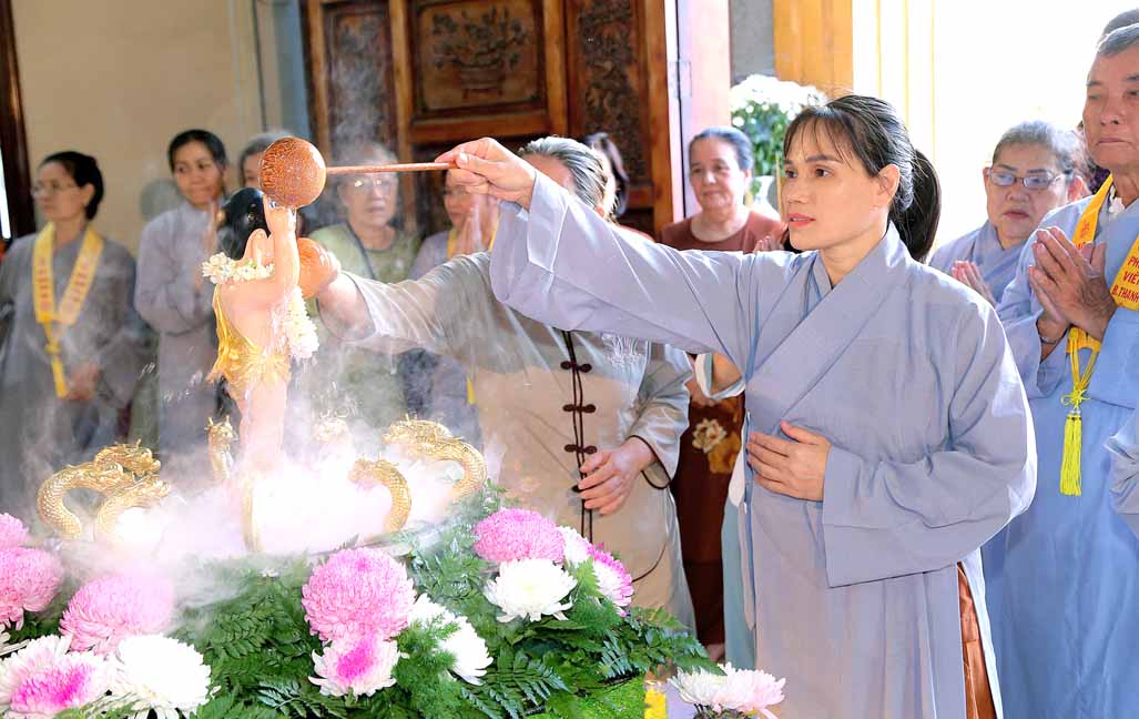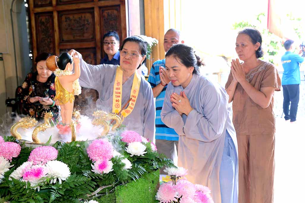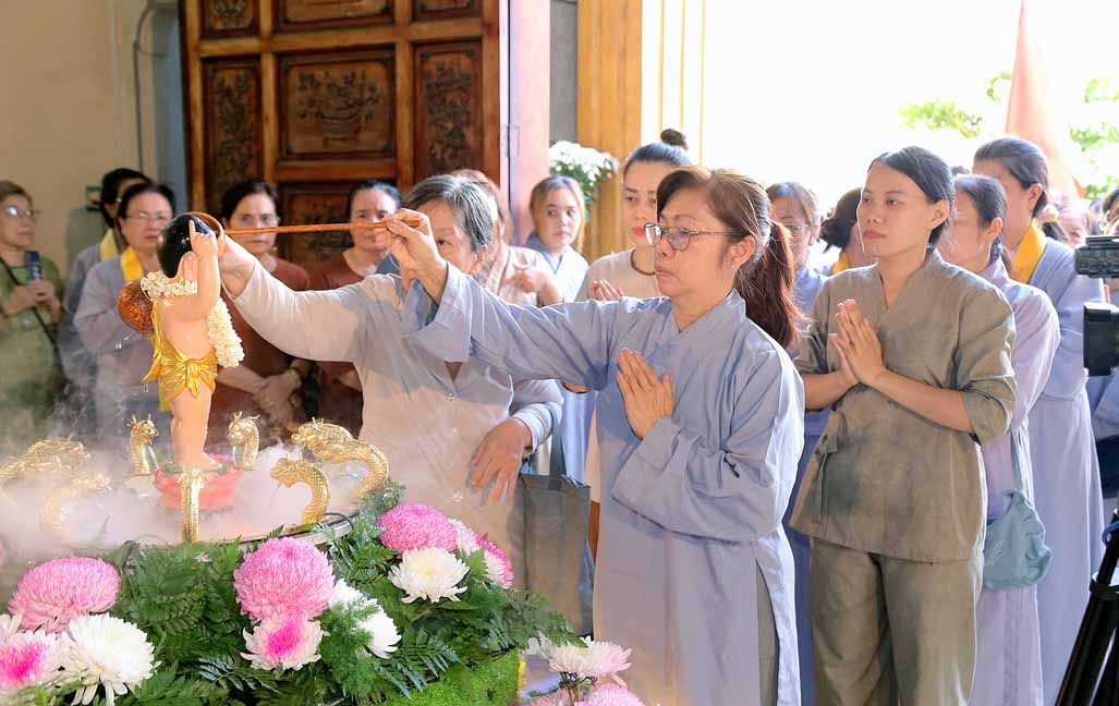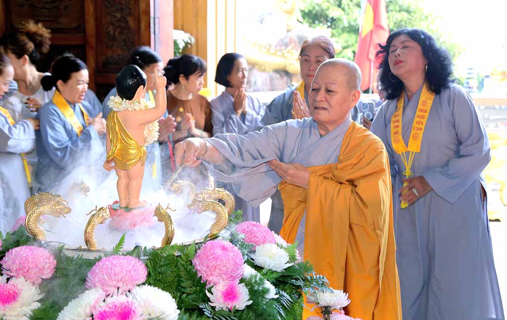 Tiếp đến, đạo tràng tụng một thời kinh “Lược sử cuộc đời đức Phật Thích Ca, lạy vía khánh đản” cùng chư Ni tại đạo tràng. Với sự chứng minh, hướng dẫn của Ni trưởng Thích Từ Nhẫn – Phó trưởng PBNG Trung ương, Trưởng PBNG GHPGVN TP. HCM, trụ trì chùa Phước Viên, trưởng BTC đại lễ, chư Tôn đức Ni cùng hàng Phật tử, tiếp nối nhau thực hiện nghi thức Tắm Phật (Lễ Mộc Dục) để dâng lòng tưởng nhớ, thành kính tri ân đến đấng Cha lành của nhân loại.