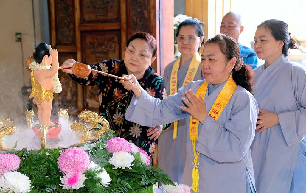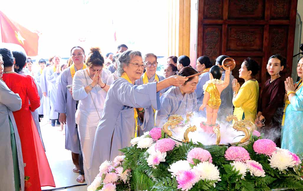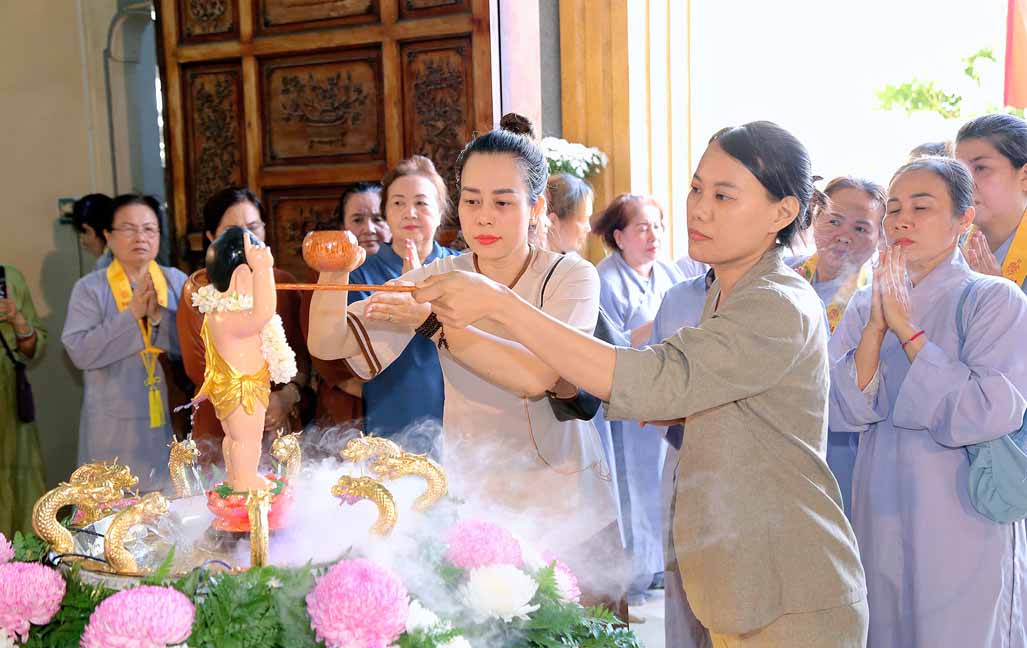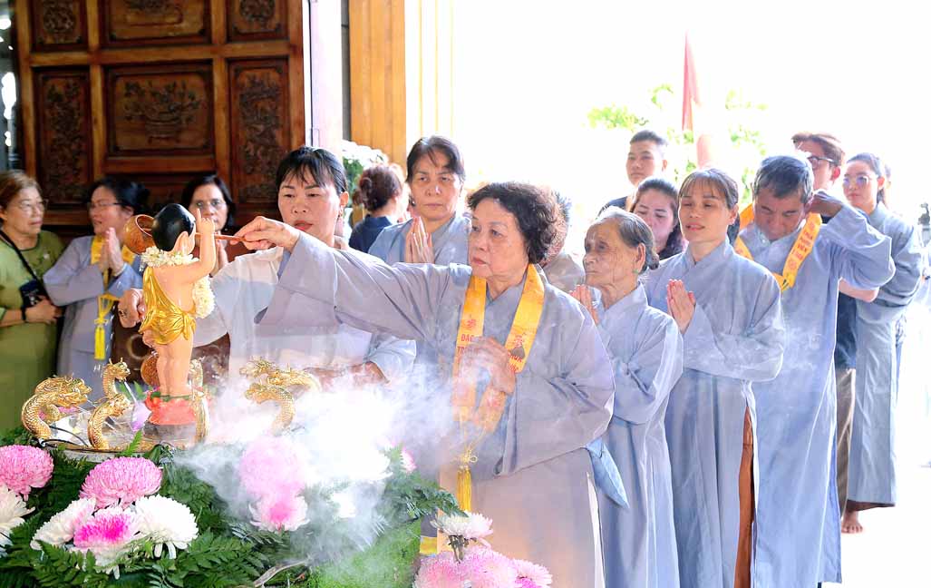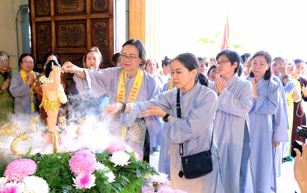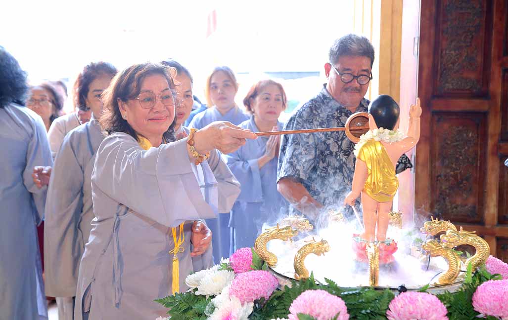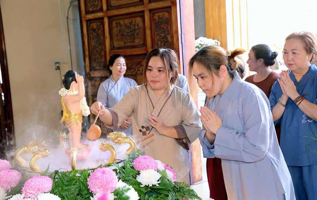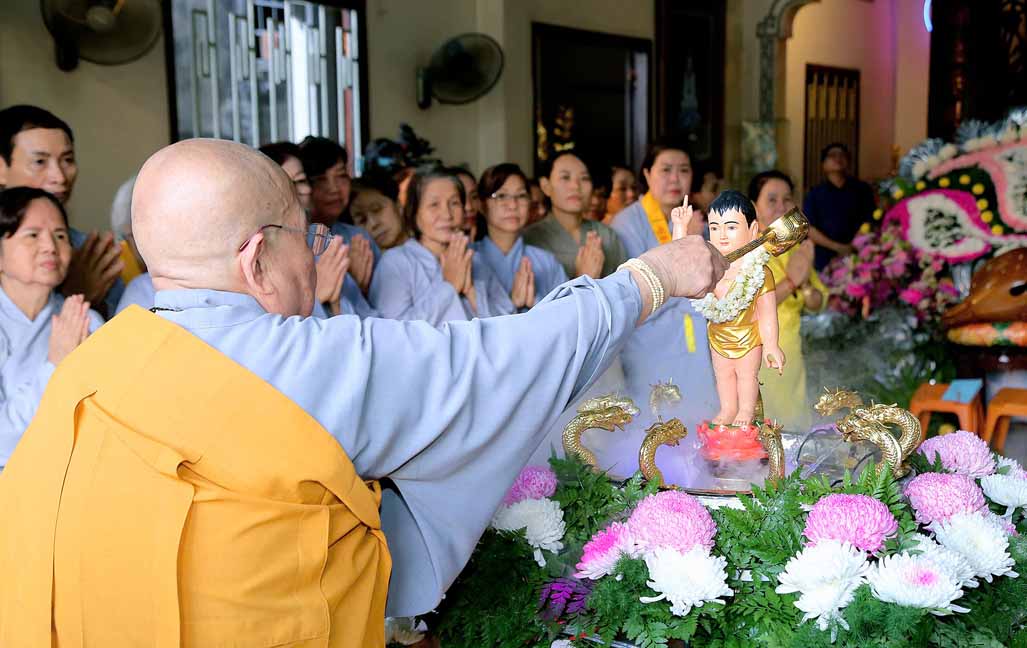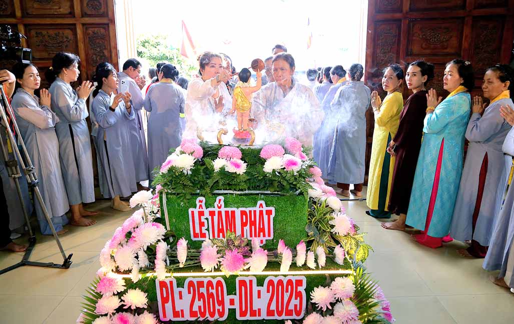 Tiếp đến, đạo tràng tụng một thời kinh “Lược sử cuộc đời đức Phật Thích Ca, lạy vía khánh đản” cùng chư Ni tại đạo tràng. Với sự chứng minh, hướng dẫn của Ni trưởng Thích Từ Nhẫn – Phó trưởng PBNG Trung ương, Trưởng PBNG GHPGVN TP. HCM, trụ trì chùa Phước Viên, trưởng BTC đại lễ, chư Tôn đức Ni cùng hàng Phật tử, tiếp nối nhau thực hiện nghi thức Tắm Phật (Lễ Mộc Dục) để dâng lòng tưởng nhớ, thành kính tri ân đến đấng Cha lành của nhân loại.