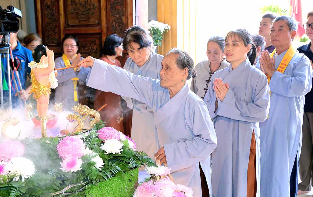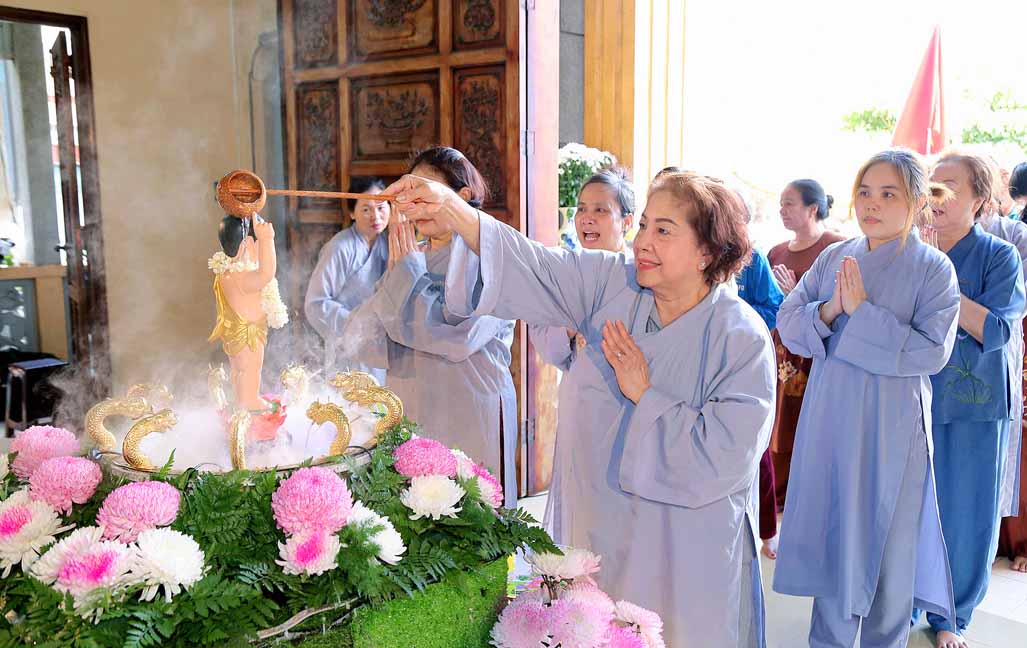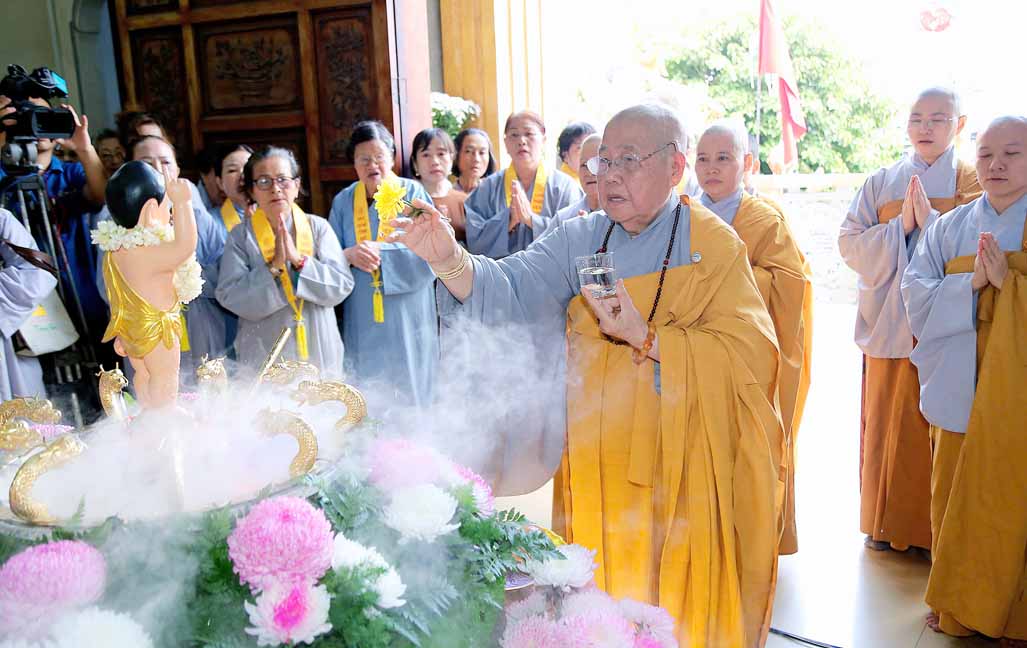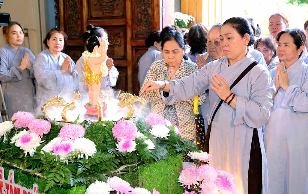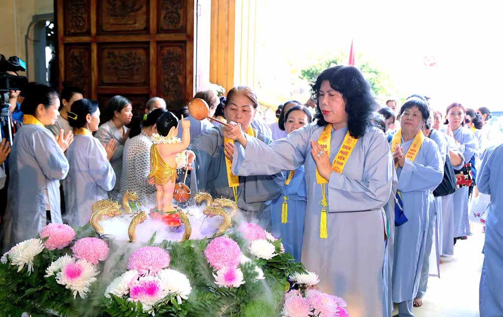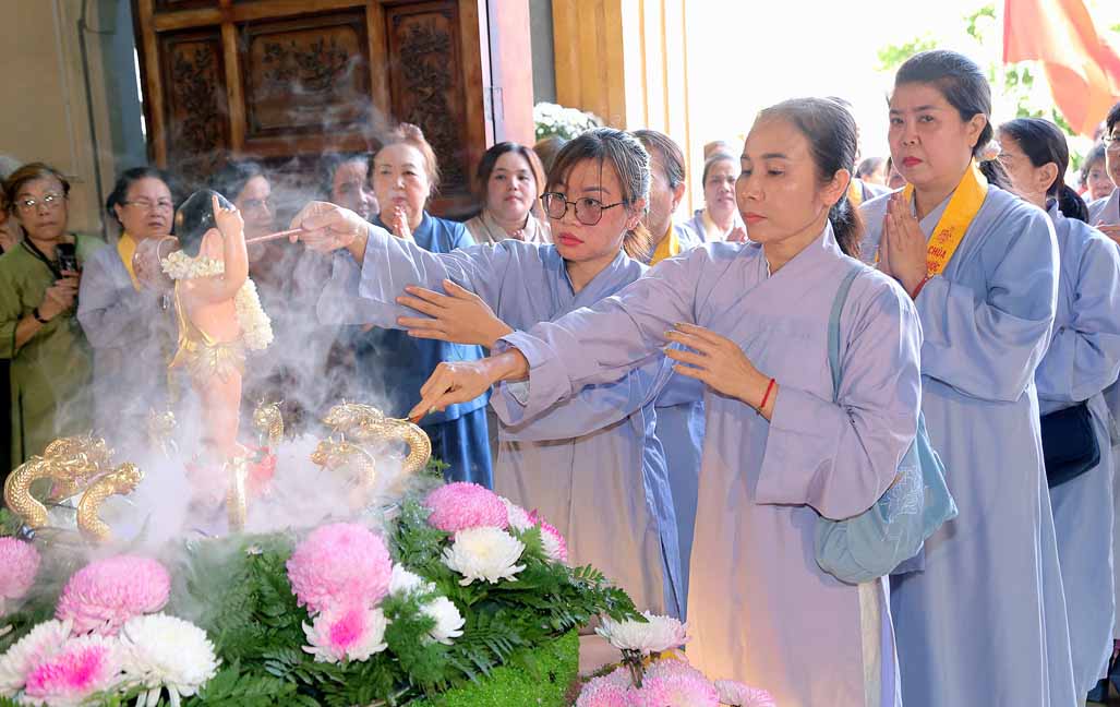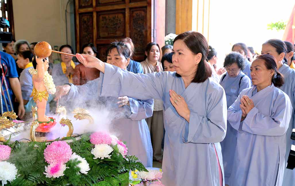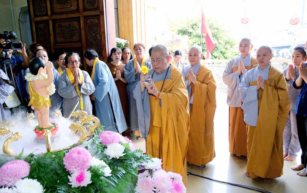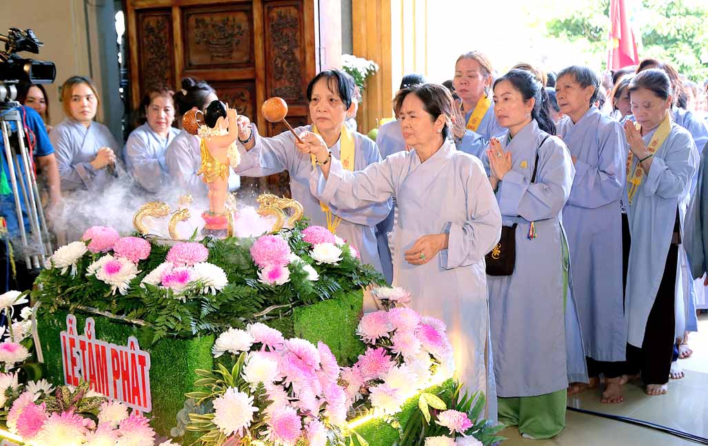 Tiếp đến, đạo tràng tụng một thời kinh “Lược sử cuộc đời đức Phật Thích Ca, lạy vía khánh đản” cùng chư Ni tại đạo tràng. Với sự chứng minh, hướng dẫn của Ni trưởng Thích Từ Nhẫn – Phó trưởng PBNG Trung ương, Trưởng PBNG GHPGVN TP. HCM, trụ trì chùa Phước Viên, trưởng BTC đại lễ, chư Tôn đức Ni cùng hàng Phật tử, tiếp nối nhau thực hiện nghi thức Tắm Phật (Lễ Mộc Dục) để dâng lòng tưởng nhớ, thành kính tri ân đến đấng Cha lành của nhân loại.