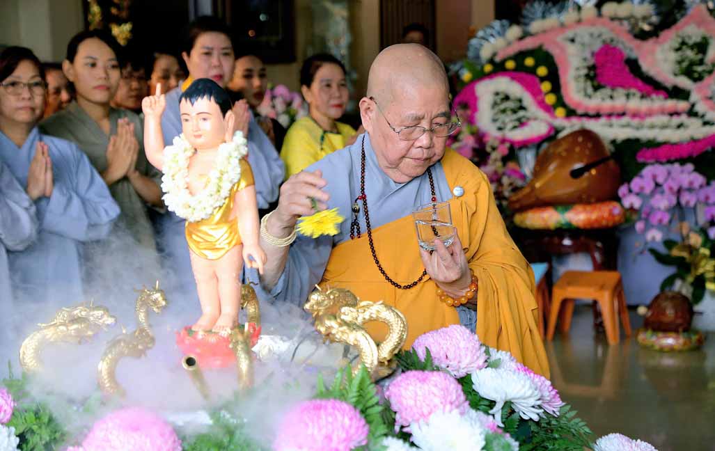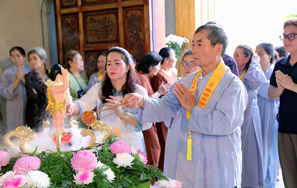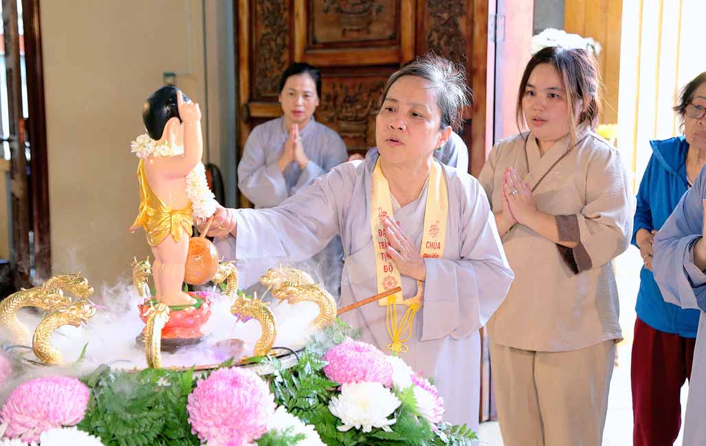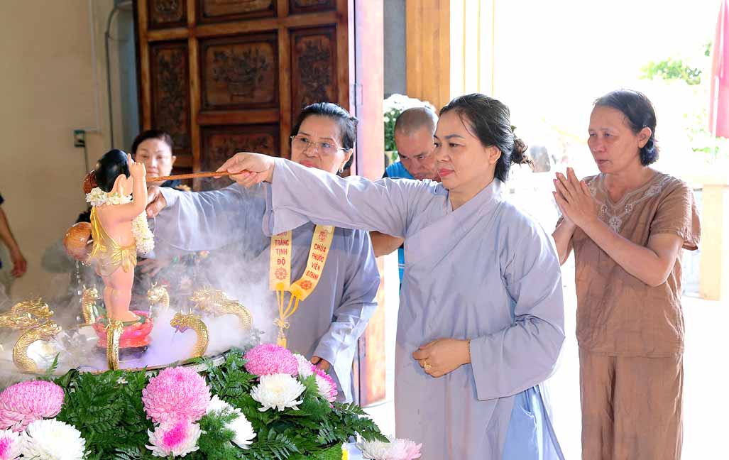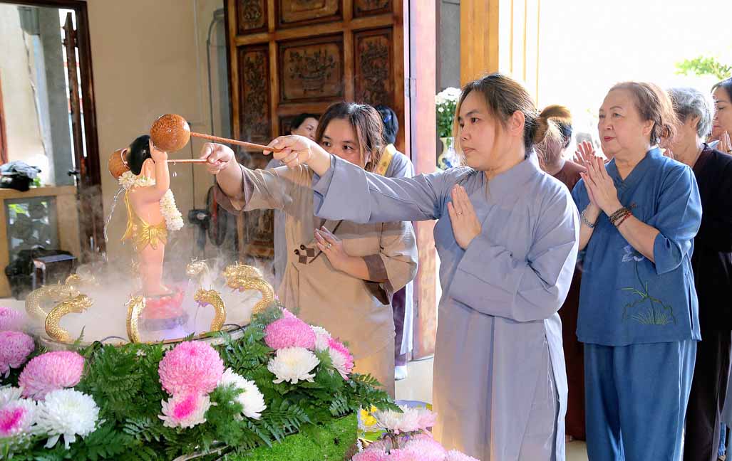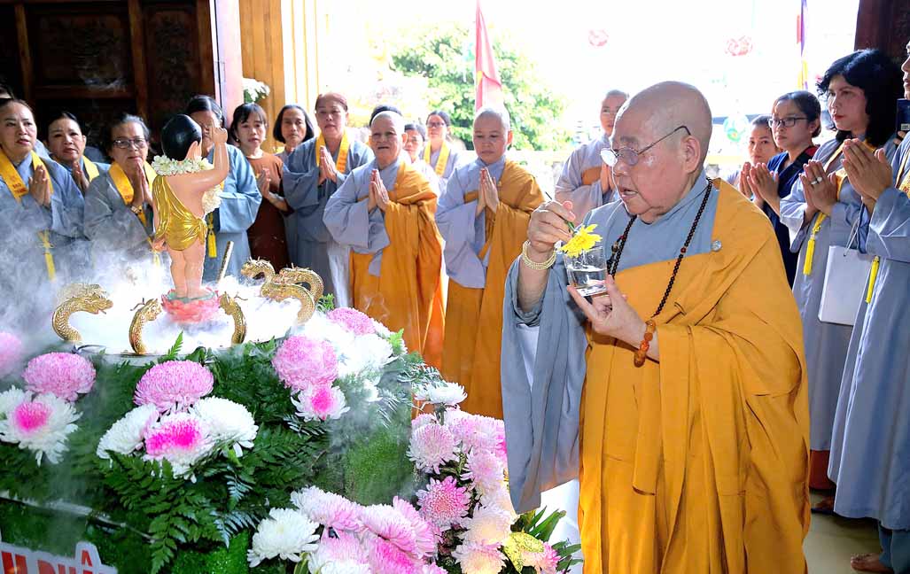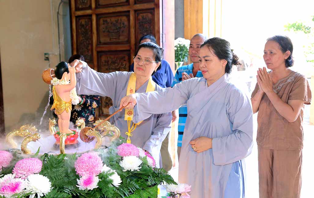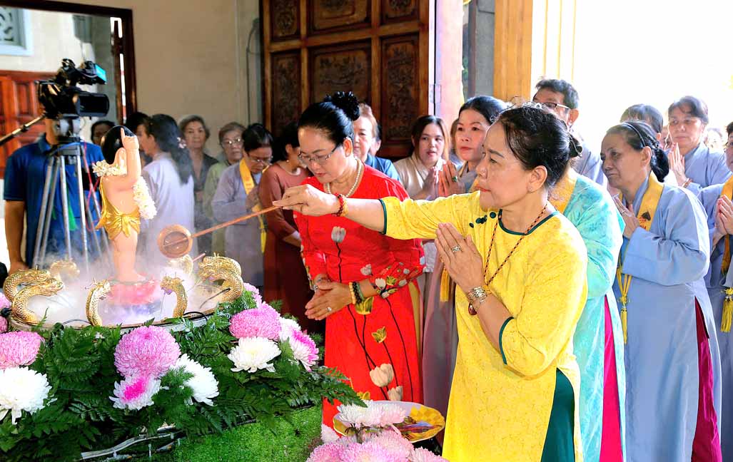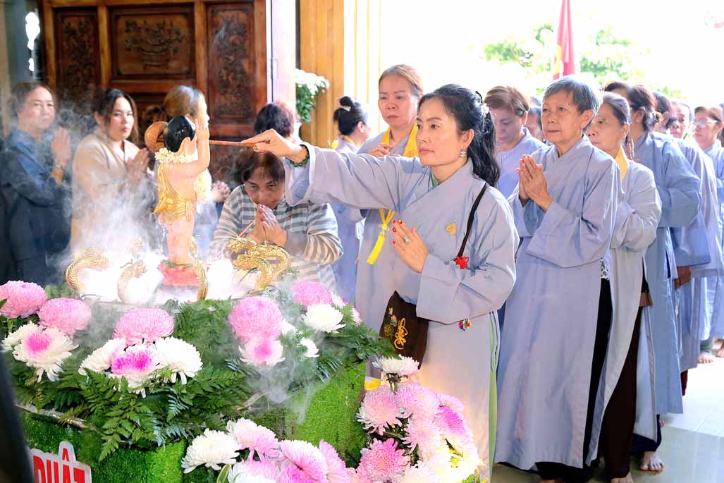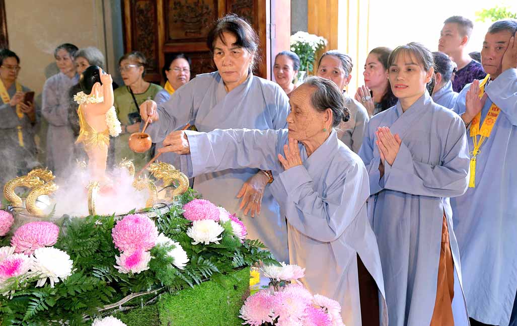 Tiếp đến, đạo tràng tụng một thời kinh “Lược sử cuộc đời đức Phật Thích Ca, lạy vía khánh đản” cùng chư Ni tại đạo tràng. Với sự chứng minh, hướng dẫn của Ni trưởng Thích Từ Nhẫn – Phó trưởng PBNG Trung ương, Trưởng PBNG GHPGVN TP. HCM, trụ trì chùa Phước Viên, trưởng BTC đại lễ, chư Tôn đức Ni cùng hàng Phật tử, tiếp nối nhau thực hiện nghi thức Tắm Phật (Lễ Mộc Dục) để dâng lòng tưởng nhớ, thành kính tri ân đến đấng Cha lành của nhân loại.