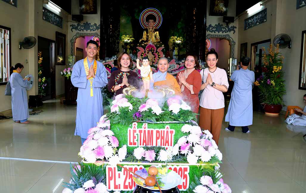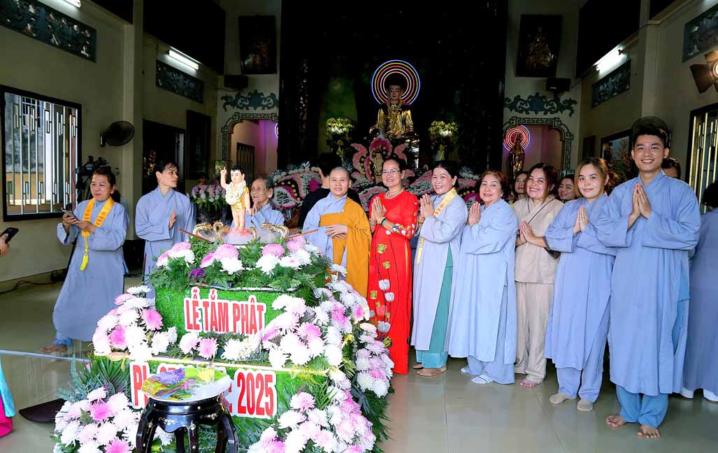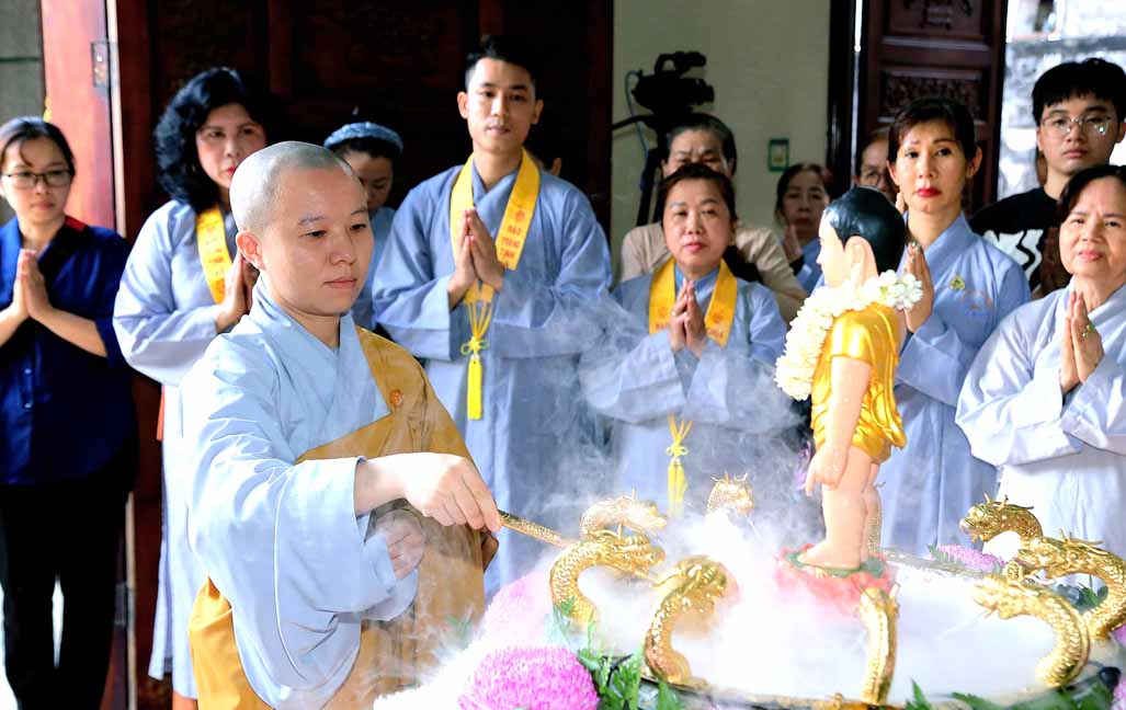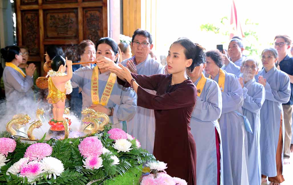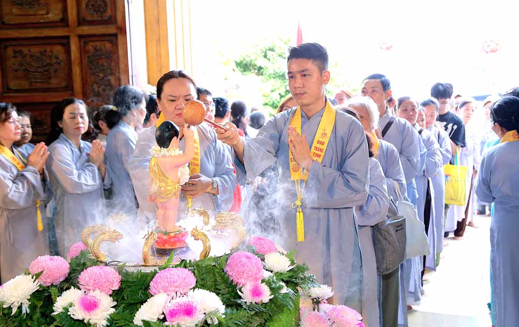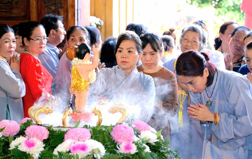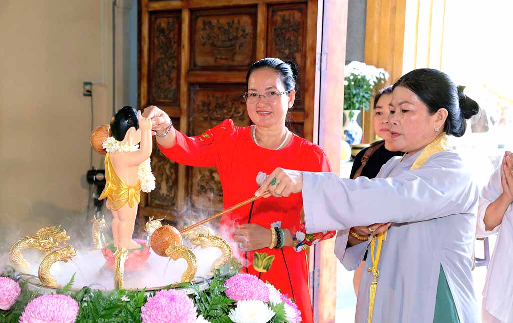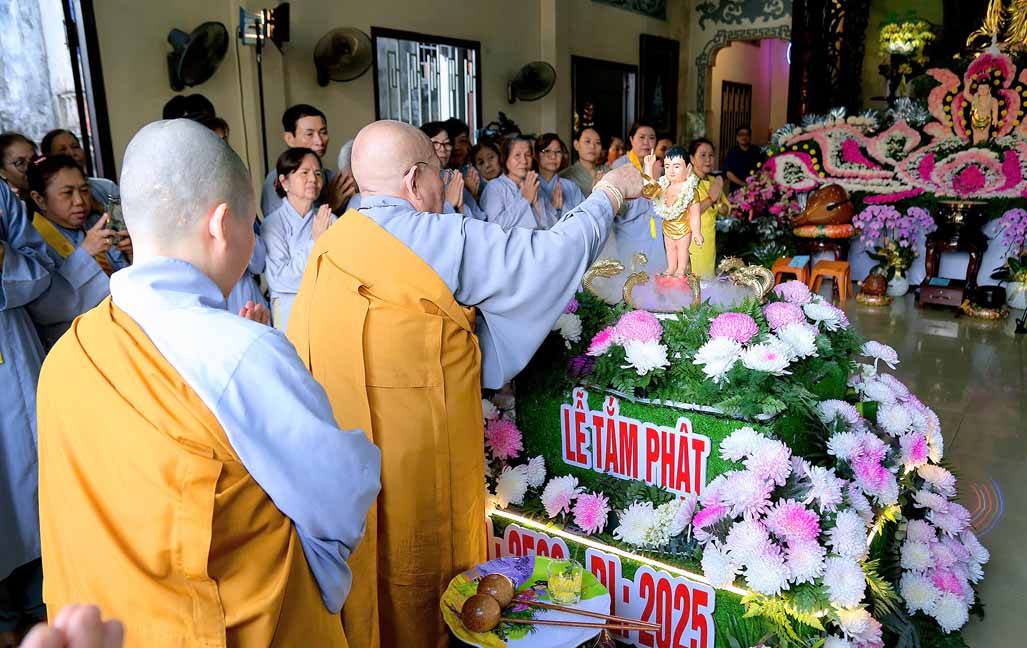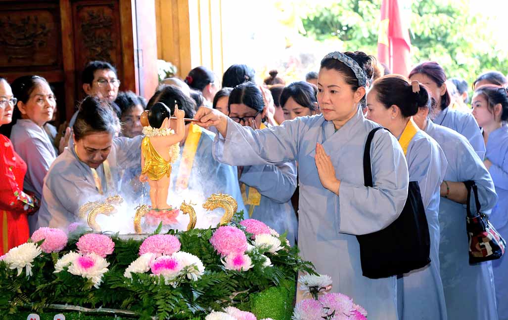 Tiếp đến, đạo tràng tụng một thời kinh “Lược sử cuộc đời đức Phật Thích Ca, lạy vía khánh đản” cùng chư Ni tại đạo tràng. Với sự chứng minh, hướng dẫn của Ni trưởng Thích Từ Nhẫn – Phó trưởng PBNG Trung ương, Trưởng PBNG GHPGVN TP. HCM, trụ trì chùa Phước Viên, trưởng BTC đại lễ, chư Tôn đức Ni cùng hàng Phật tử, tiếp nối nhau thực hiện nghi thức Tắm Phật (Lễ Mộc Dục) để dâng lòng tưởng nhớ, thành kính tri ân đến đấng Cha lành của nhân loại.