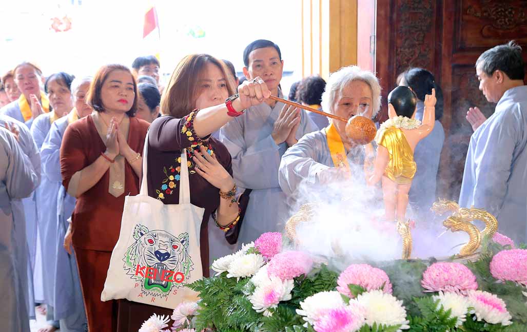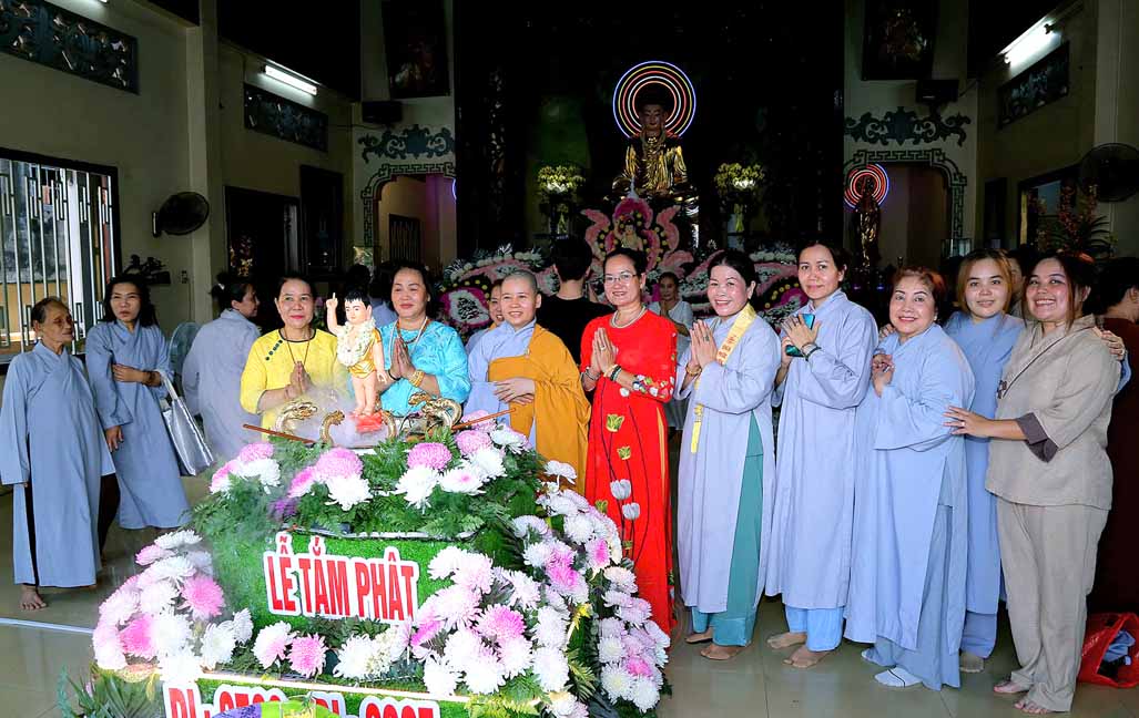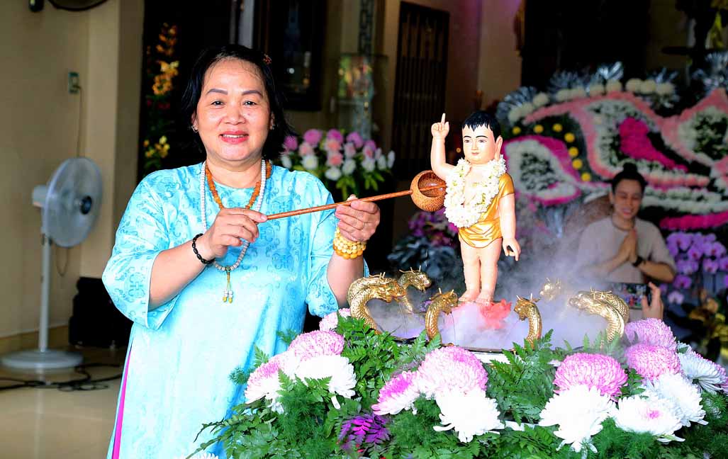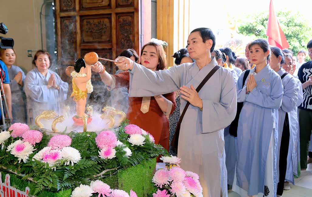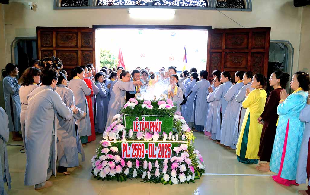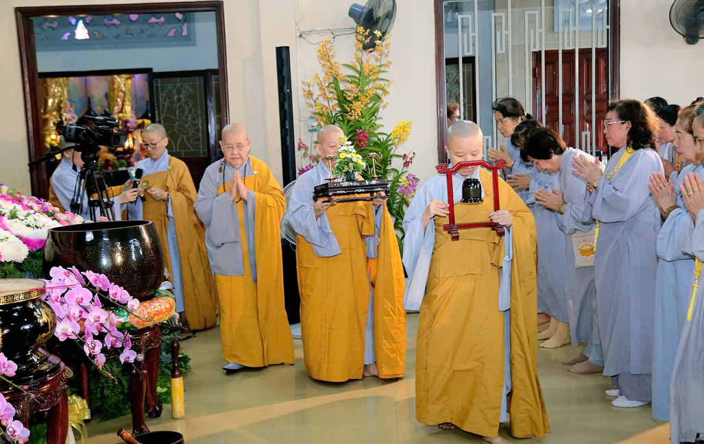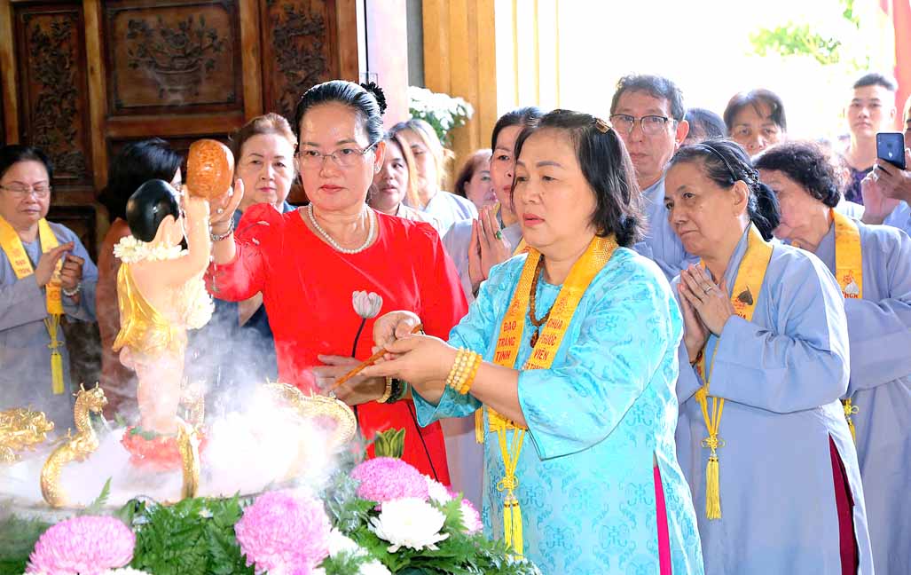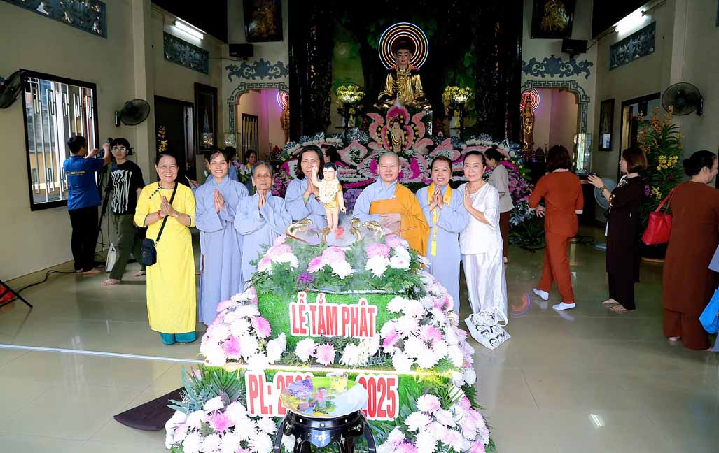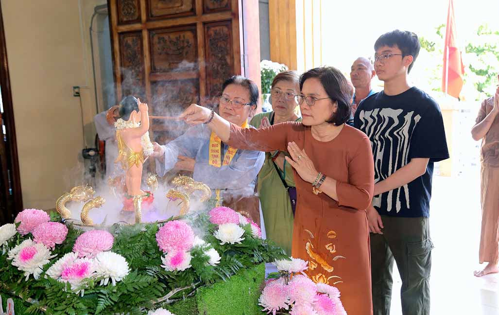 Tiếp đến, đạo tràng tụng một thời kinh “Lược sử cuộc đời đức Phật Thích Ca, lạy vía khánh đản” cùng chư Ni tại đạo tràng. Với sự chứng minh, hướng dẫn của Ni trưởng Thích Từ Nhẫn – Phó trưởng PBNG Trung ương, Trưởng PBNG GHPGVN TP. HCM, trụ trì chùa Phước Viên, trưởng BTC đại lễ, chư Tôn đức Ni cùng hàng Phật tử, tiếp nối nhau thực hiện nghi thức Tắm Phật (Lễ Mộc Dục) để dâng lòng tưởng nhớ, thành kính tri ân đến đấng Cha lành của nhân loại.