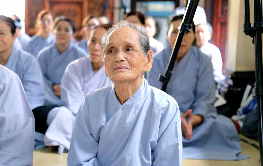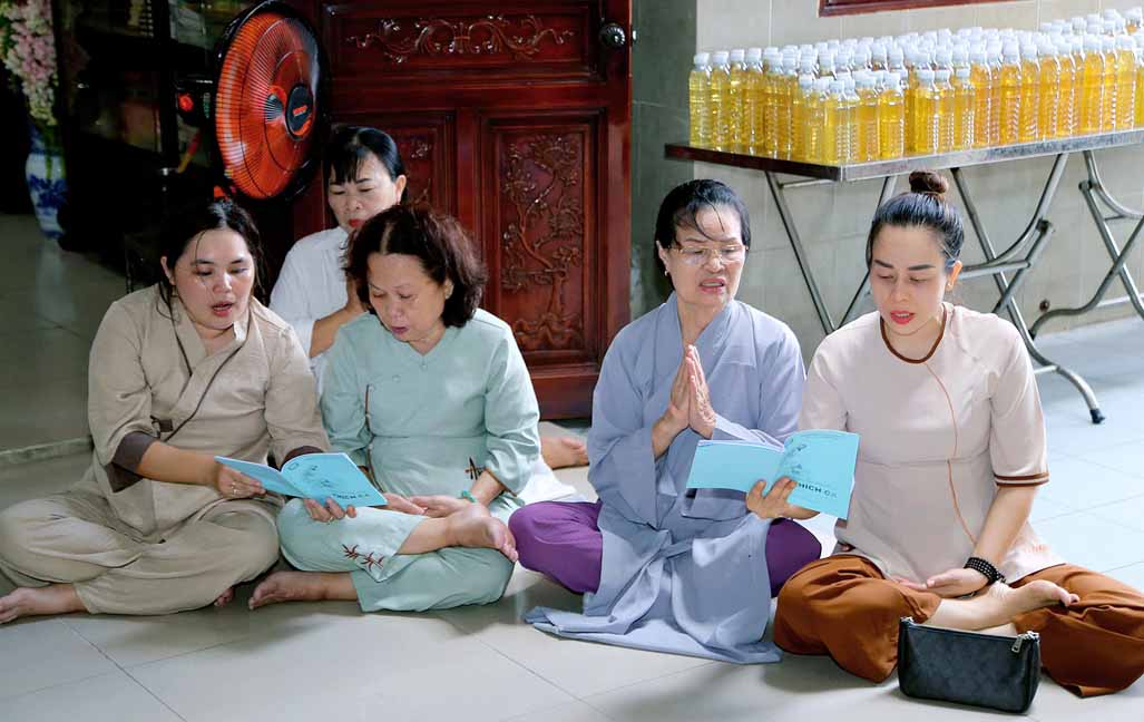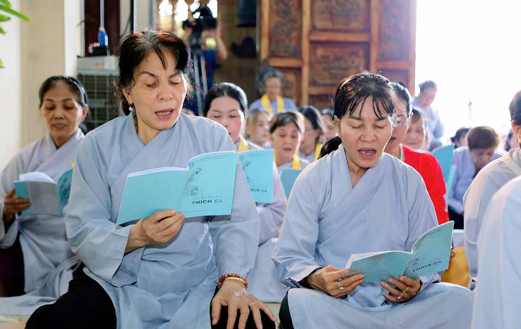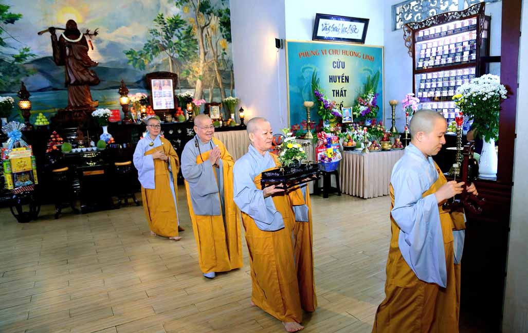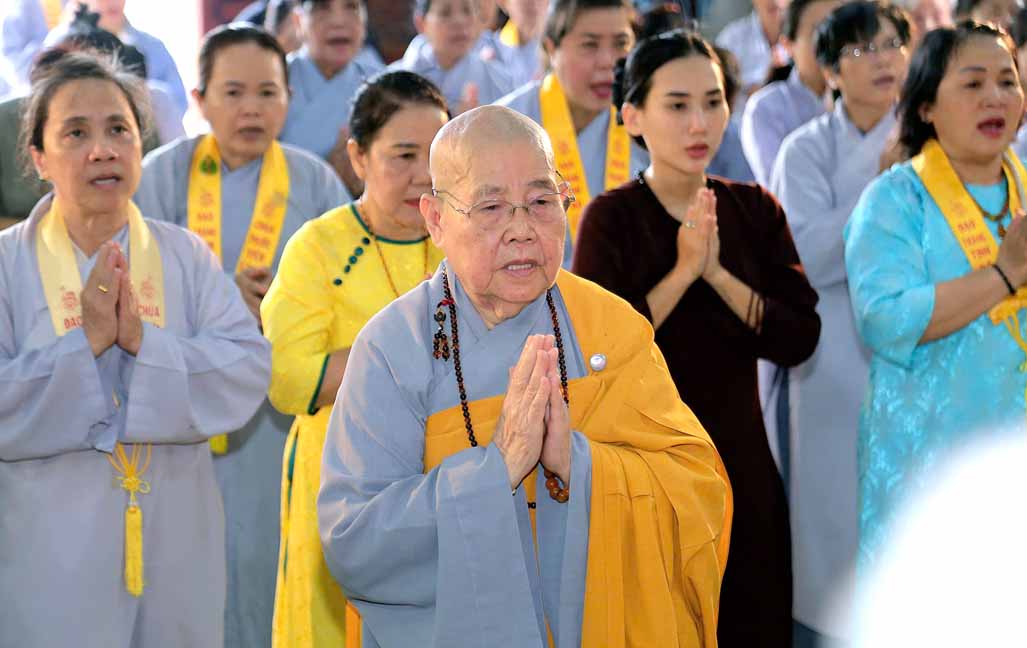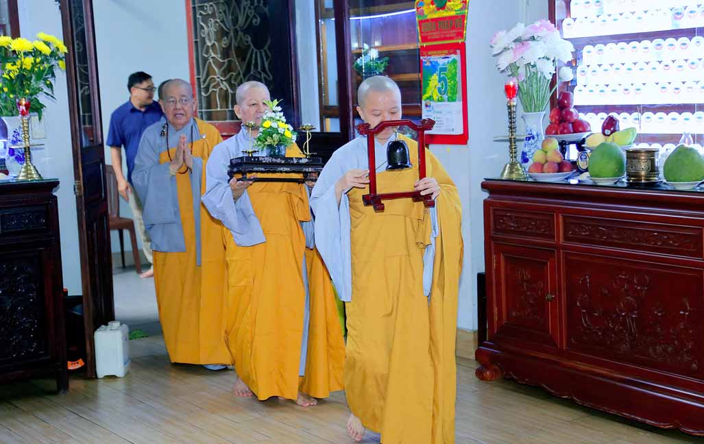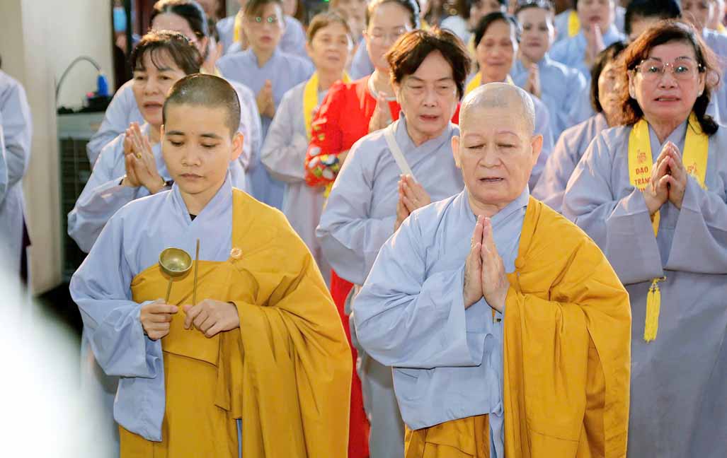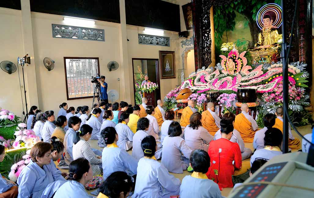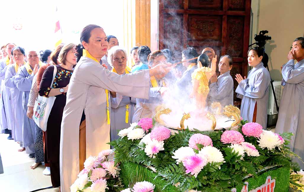 Tiếp đến, đạo tràng tụng một thời kinh “Lược sử cuộc đời đức Phật Thích Ca, lạy vía khánh đản” cùng chư Ni tại đạo tràng. Với sự chứng minh, hướng dẫn của Ni trưởng Thích Từ Nhẫn – Phó trưởng PBNG Trung ương, Trưởng PBNG GHPGVN TP. HCM, trụ trì chùa Phước Viên, trưởng BTC đại lễ, chư Tôn đức Ni cùng hàng Phật tử, tiếp nối nhau thực hiện nghi thức Tắm Phật (Lễ Mộc Dục) để dâng lòng tưởng nhớ, thành kính tri ân đến đấng Cha lành của nhân loại.
