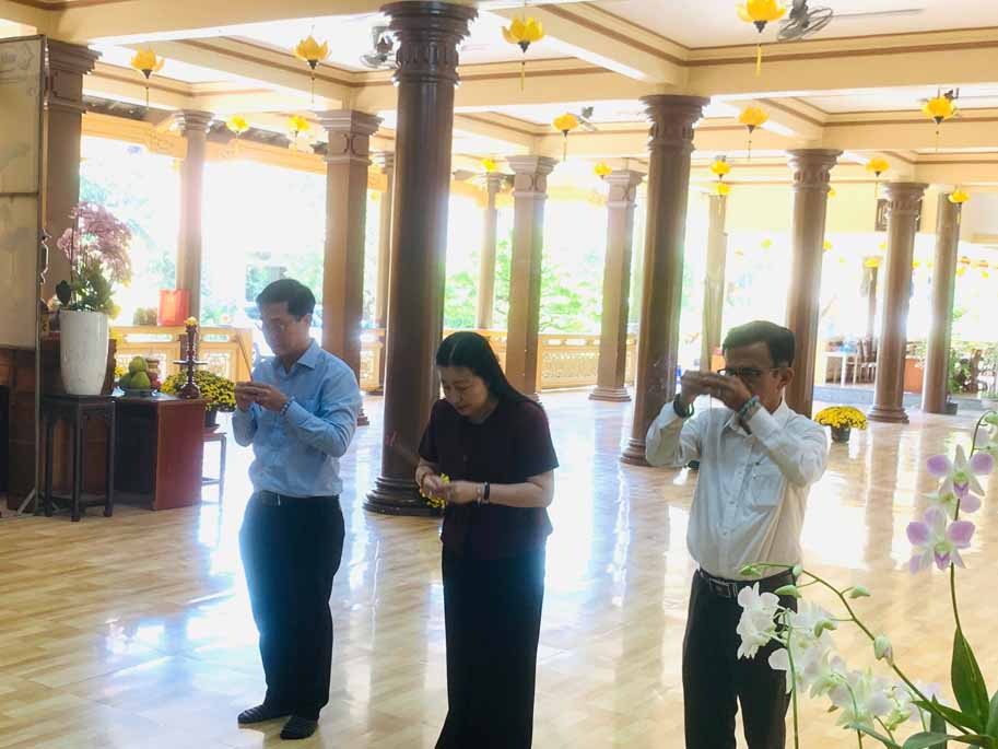 Đoàn do bà Trương Thanh Nga – Thành ủy viên, Phó trưởng Ban Tuyên Giáo và Dân Vận Thành ủy làm trưởng đoàn. Tiếp đoàn có Ni sư Thích Từ Thảo – Ủy viên Hội đồng Trị sự GHPGVN, Phó Trưởng ban kiêm trưởng Tiểu Ban Pháp chế PBNGTW, Phó trưởng ban Trị sự GHPGVN TP. HCM, Phó Trưởng ban Thường trực Ban Kinh tế Tài Chánh GHPGVN TP. HCM, trụ trì chùa Bồ Đề Đạo Tràng.