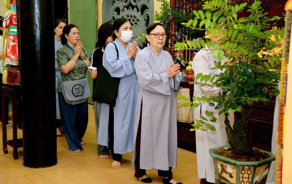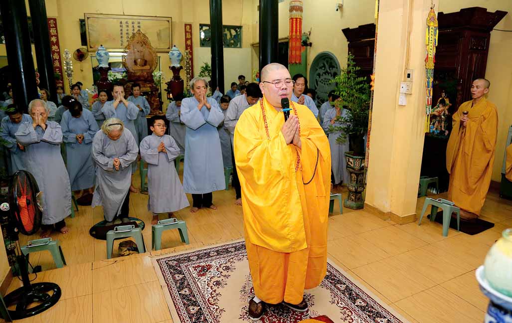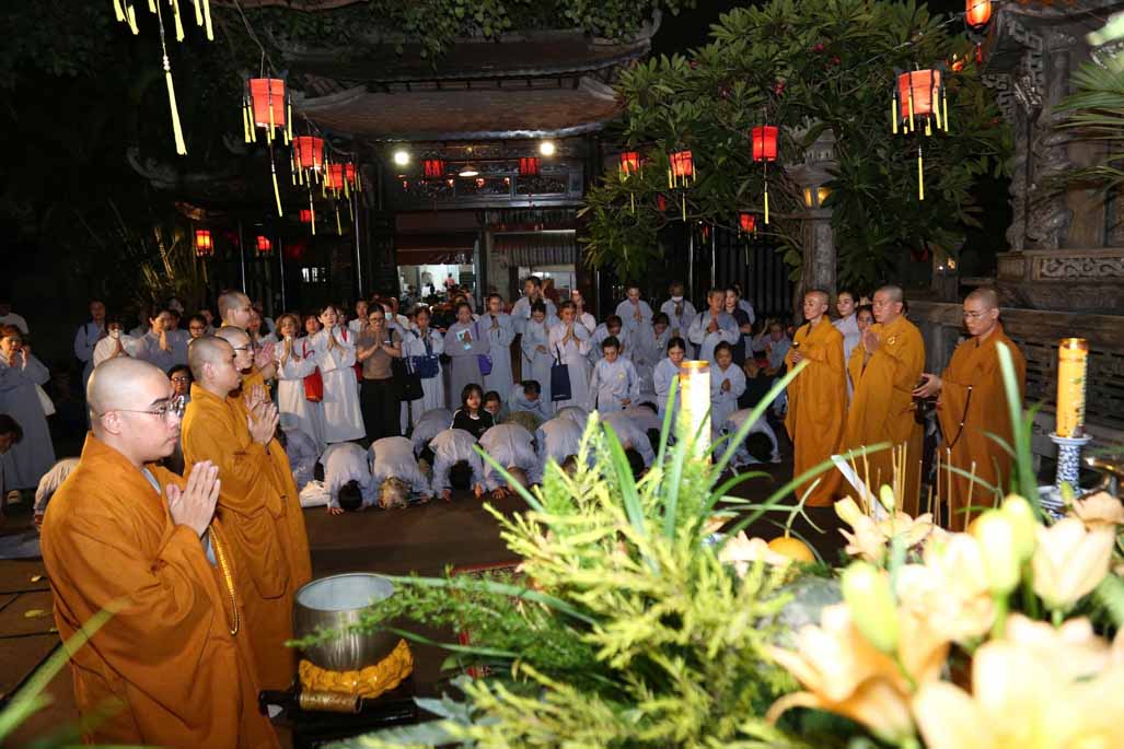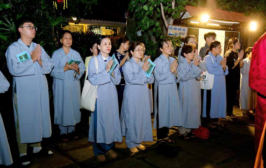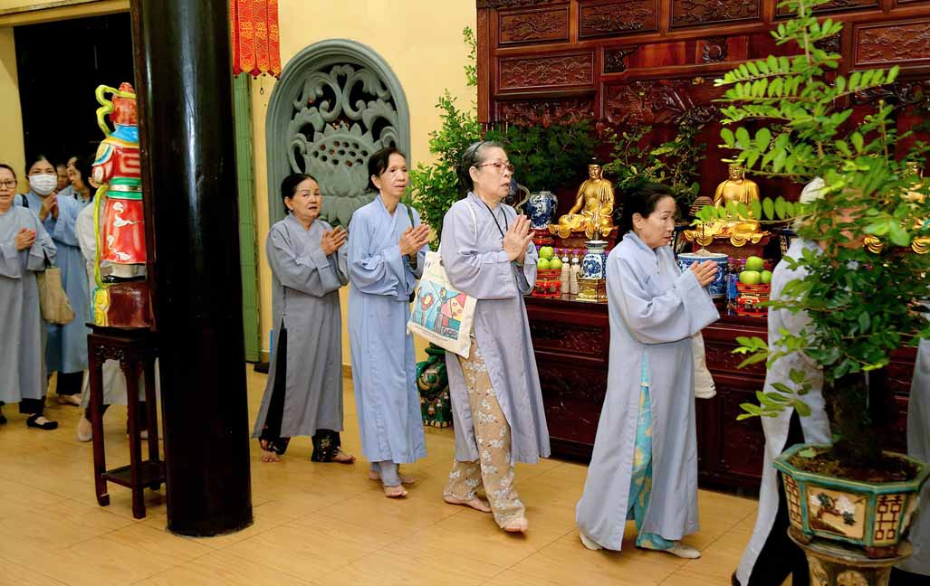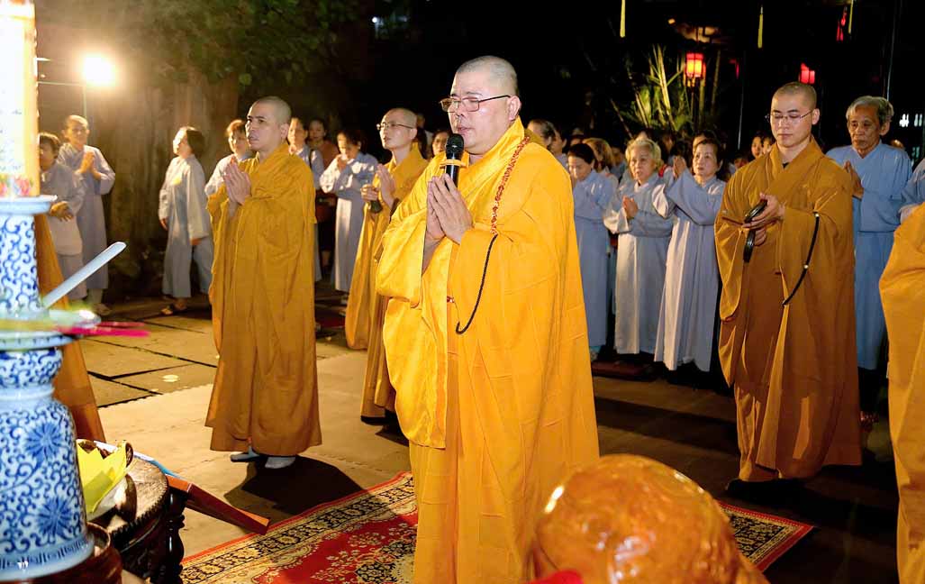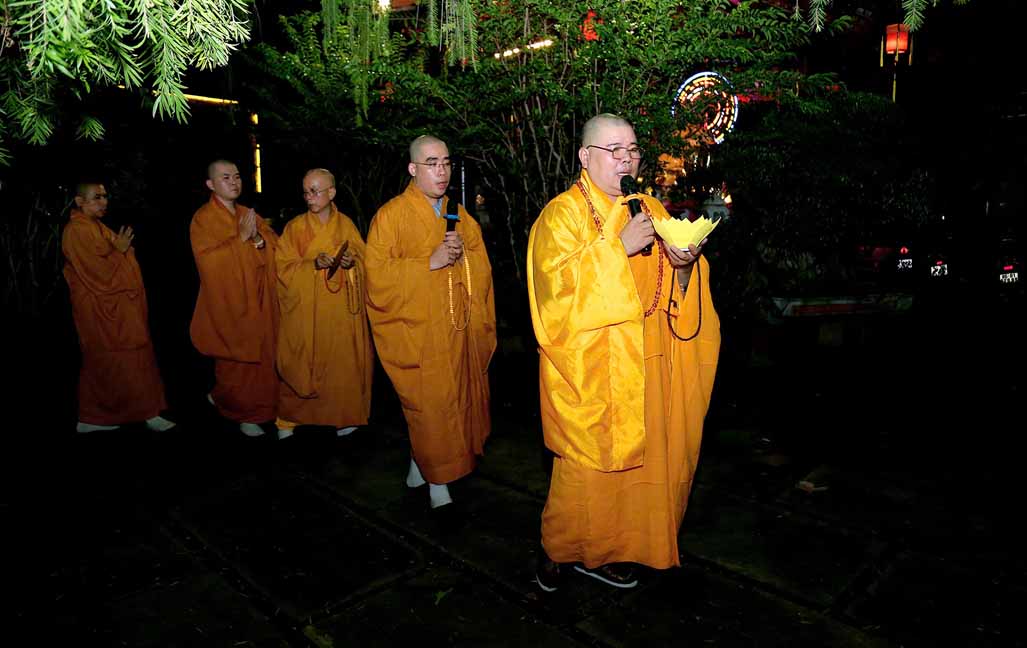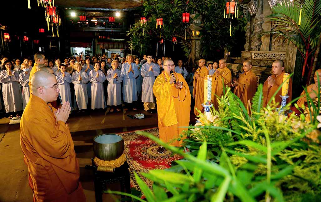 Tại đây Thượng tọa trụ trì cùng chư Tôn đức Tăng tại Bổn tự đã hướng dẫn quý Phật tử niêm hương bạch Phật, trì chú Đại Bi và đảnh lễ ngũ bách danh Bồ tát Quán Thế Âm, nguyện cầu hòa bình thế giới, quốc thái dân an, mưa thuận gió hòa, nhân dân an lạc.