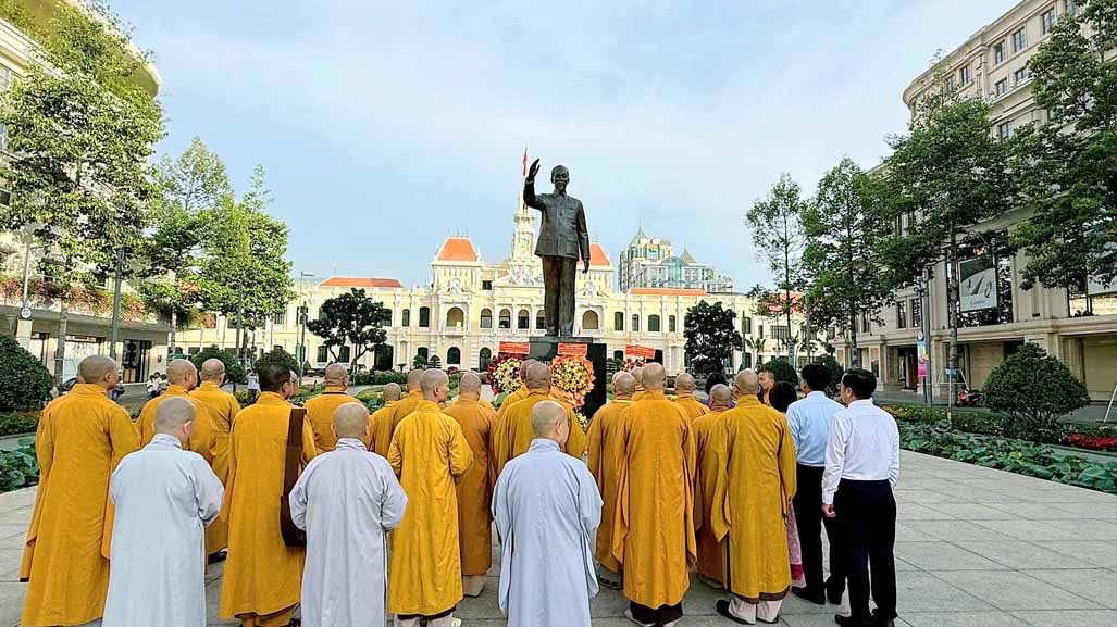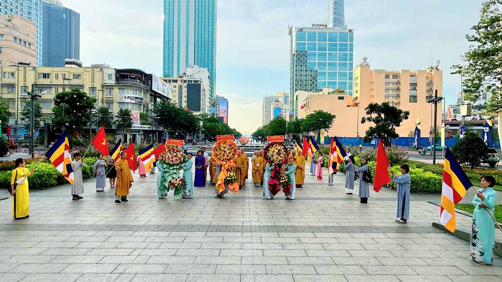 Sáng nay 11 – 5 – 2025 (14 tháng 4 năm Ất Tỵ). Ban Thường trực BTS GHPGVN TP. HCM và các BTS Phật giáo Q.1, Q. 4, Q. Phú Nhuận cùng đại diện chính quyền Quận uỷ, HĐND, UBMTTQVN Q.1 và chư Tôn Đức Tăng Ni, Phật tử các tự viện Q.1, đã đến đặt vòng hoa và thắp hương tưởng niệm tại Tượng đài Bác Hồ, tượng đài Đức thánh Trần Hưng Đạo và tượng đài Liệt nữ Quách Thị Trang (Q.1).
