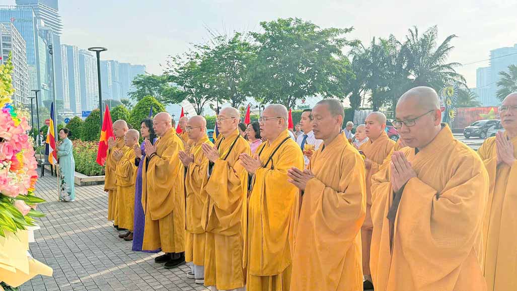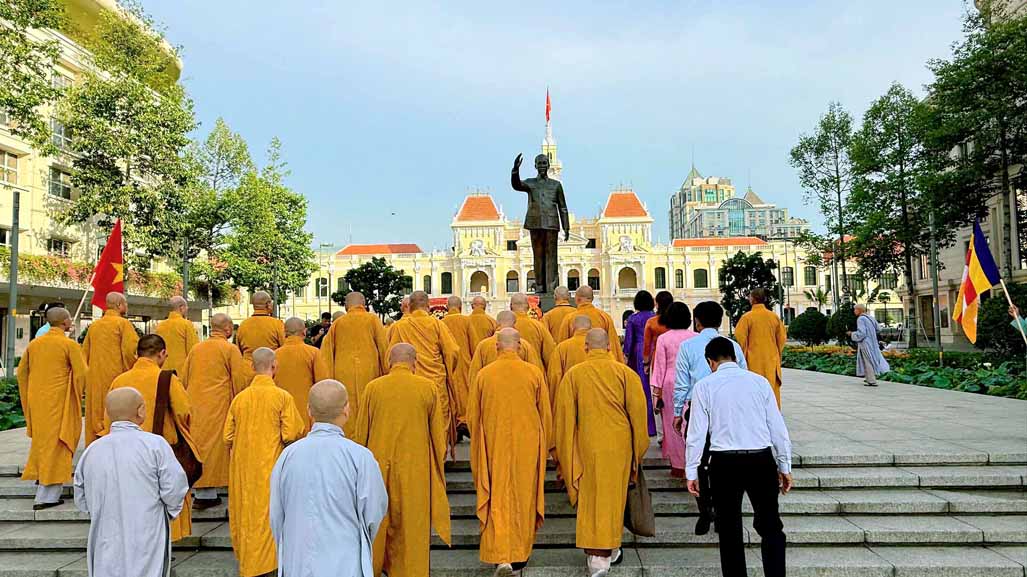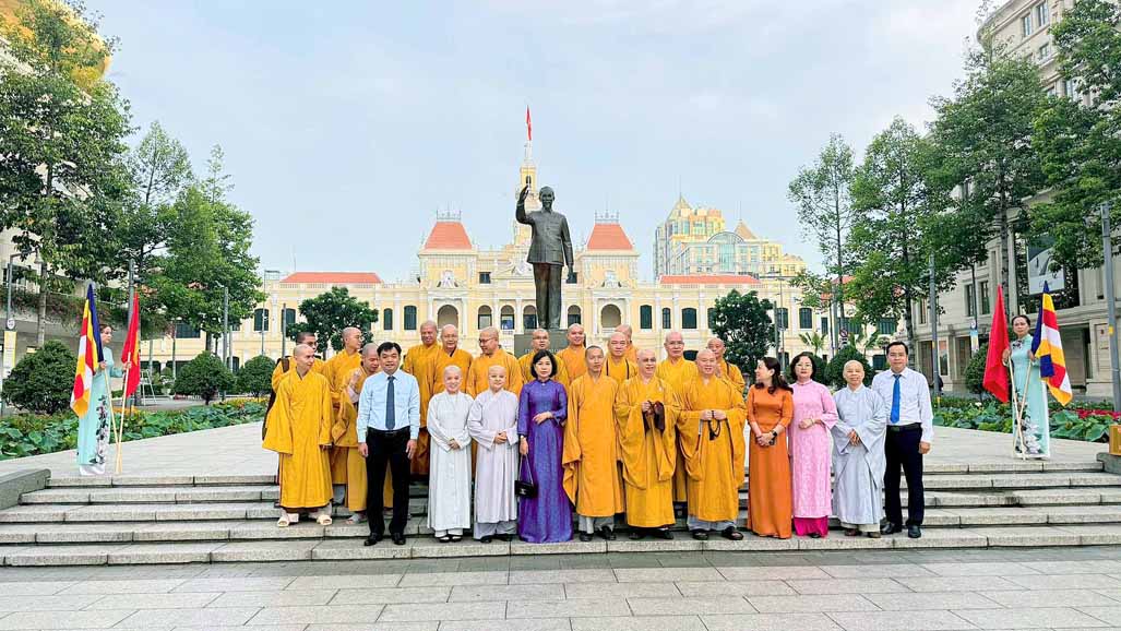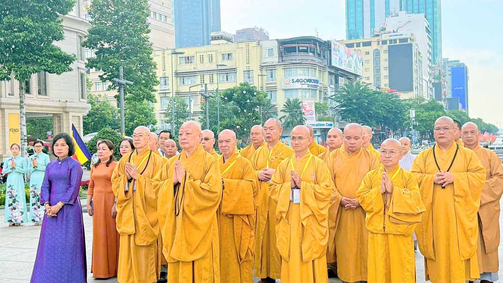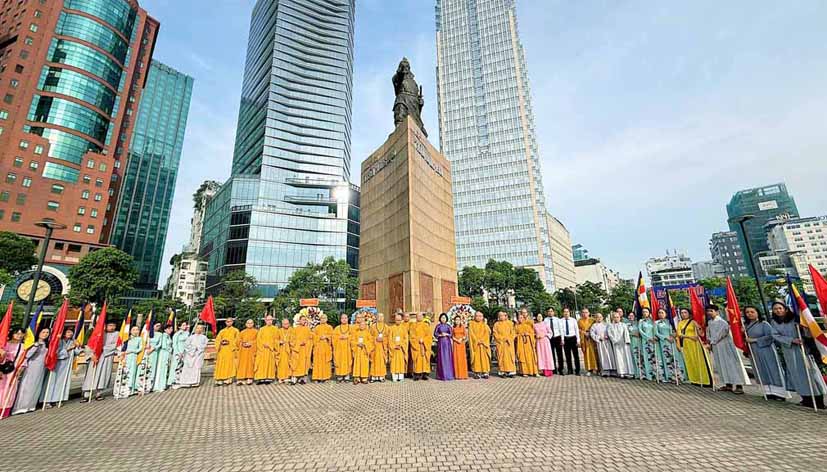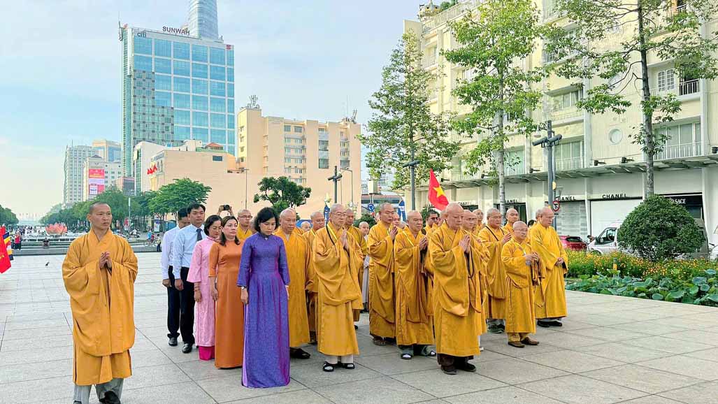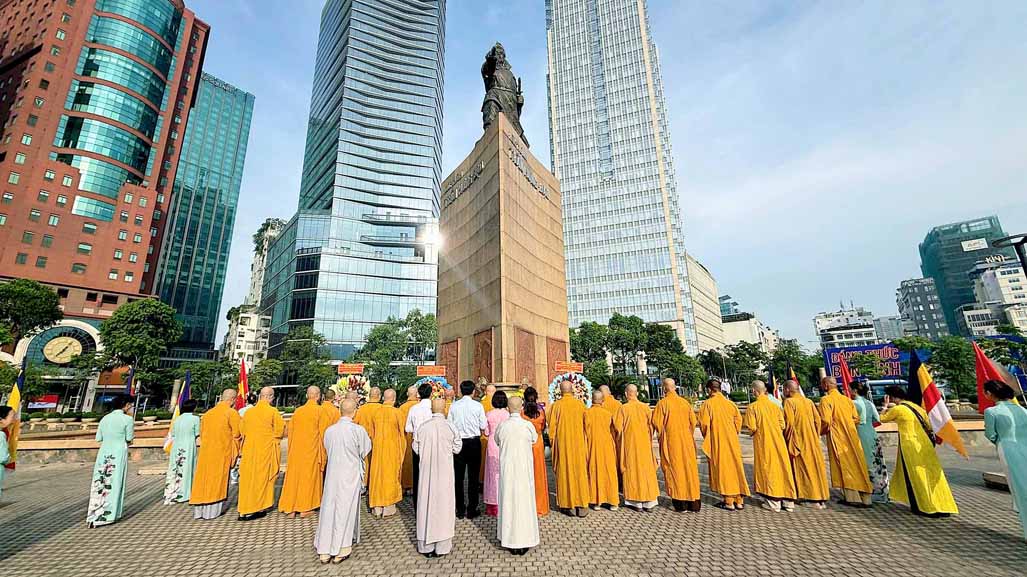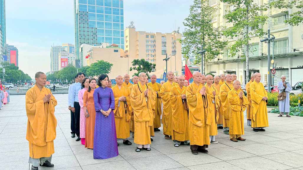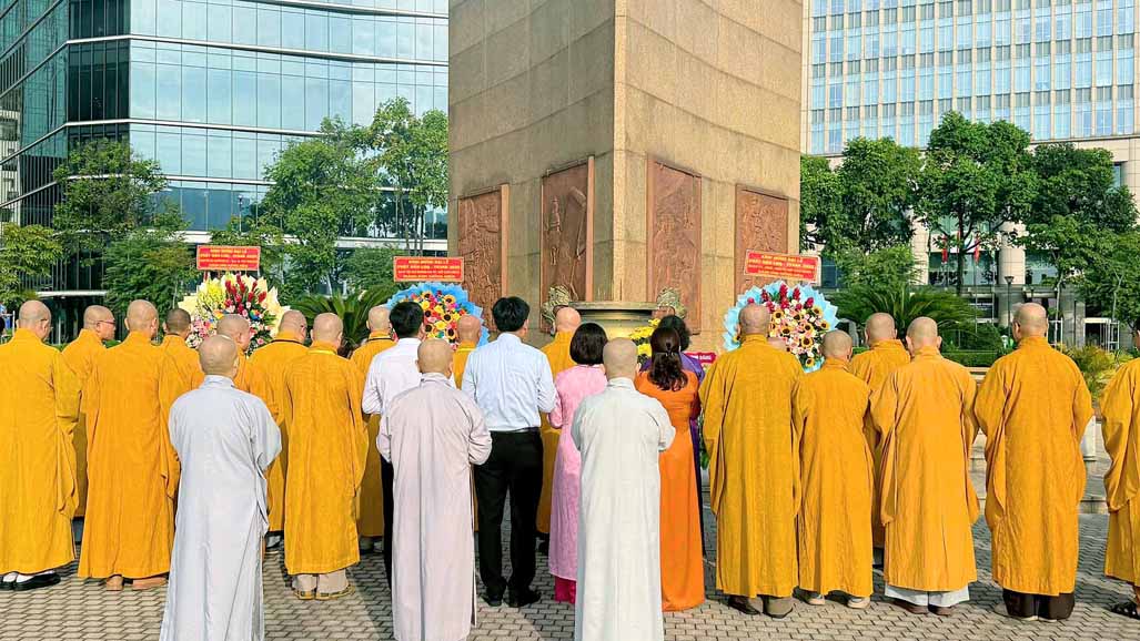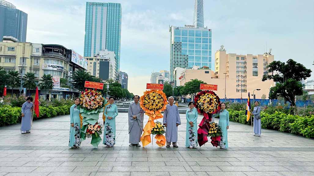 Sáng nay 11 – 5 – 2025 (14 tháng 4 năm Ất Tỵ). Ban Thường trực BTS GHPGVN TP. HCM và các BTS Phật giáo Q.1, Q. 4, Q. Phú Nhuận cùng đại diện chính quyền Quận uỷ, HĐND, UBMTTQVN Q.1 và chư Tôn Đức Tăng Ni, Phật tử các tự viện Q.1, đã đến đặt vòng hoa và thắp hương tưởng niệm tại Tượng đài Bác Hồ, tượng đài Đức thánh Trần Hưng Đạo và tượng đài Liệt nữ Quách Thị Trang (Q.1).