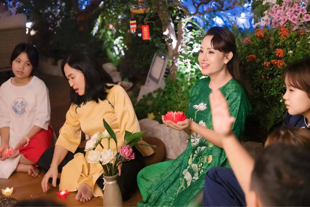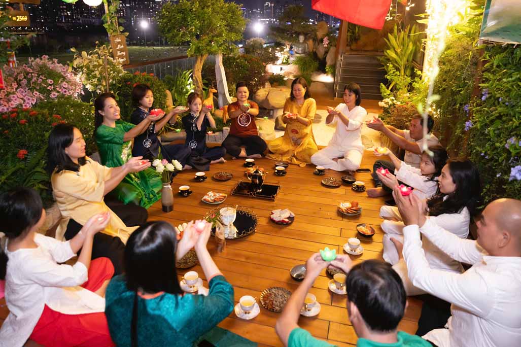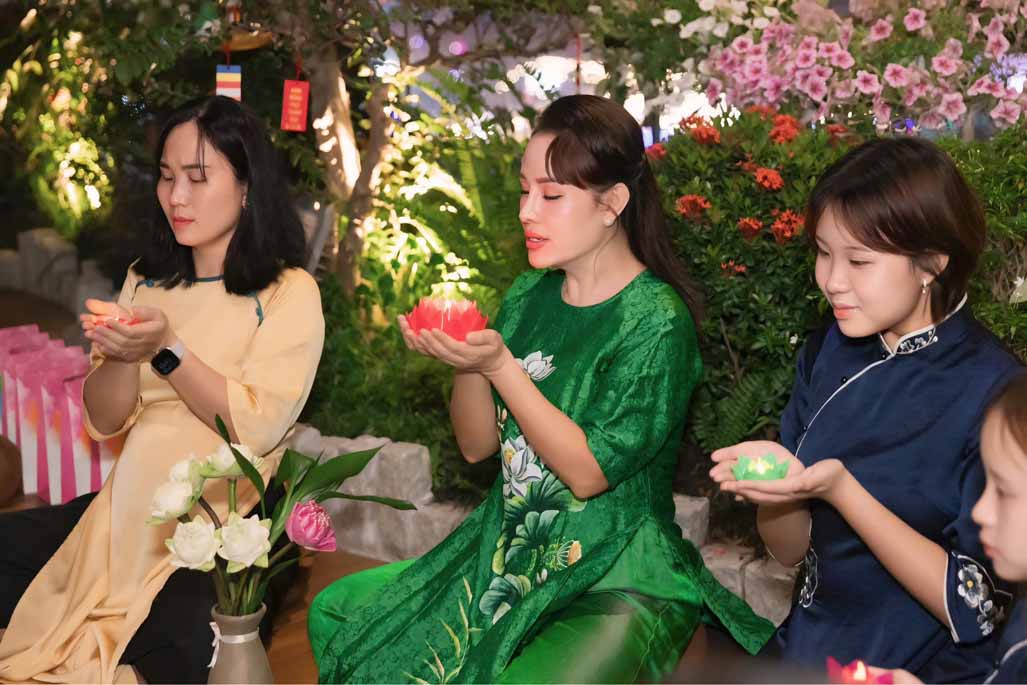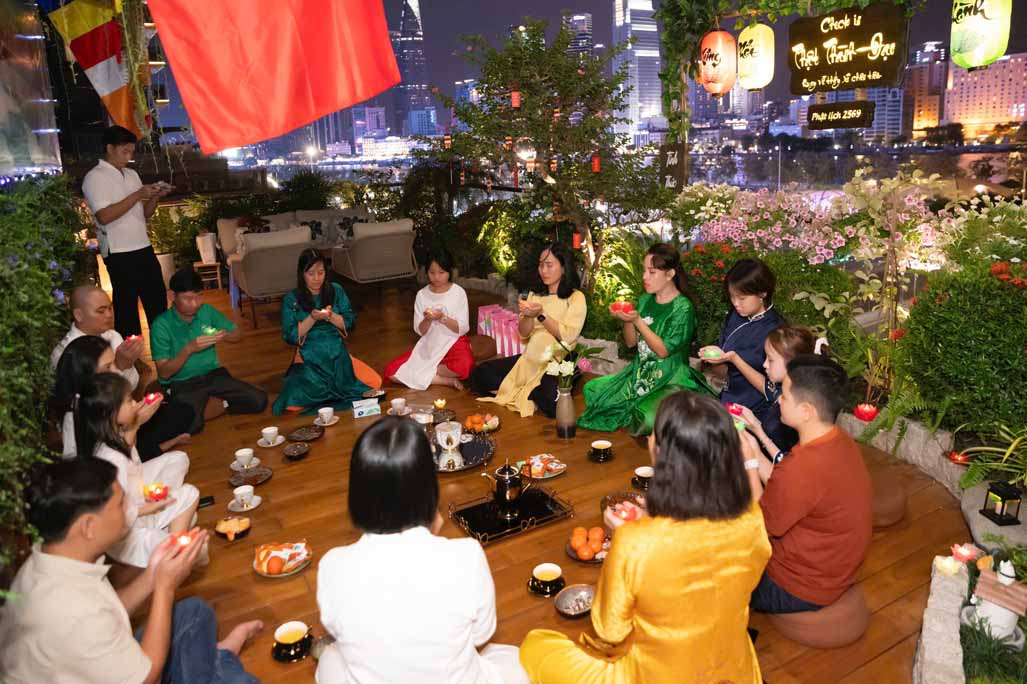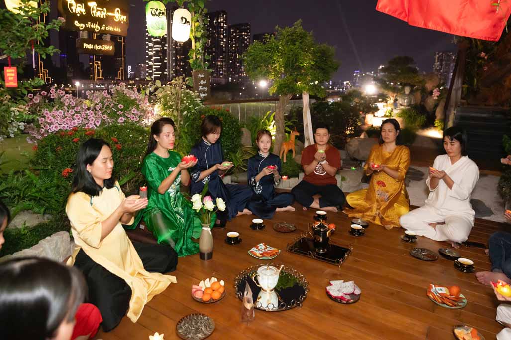 Ngoài phần tụng niệm và đọc thời kinh, buổi lễ còn có không gian trà đạo, một hoạt động mang tính tĩnh lặng, giúp người tham dự an trú tâm, lắng nghe và trao đổi về tu tập. Những cuộc trao đổi, chia sẻ Phật pháp giữa các đạo hữu và khách mời diễn ra một cách thân mật, hướng về tinh thần hoan hỷ, hoà hợp và ứng dụng lời Phật dạy trong đời sống gia đình, công việc.